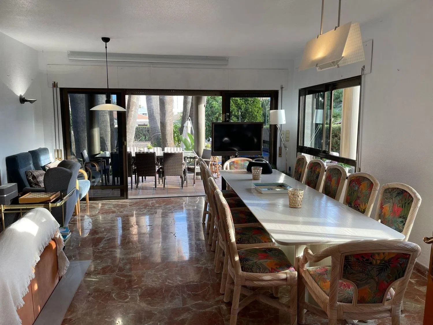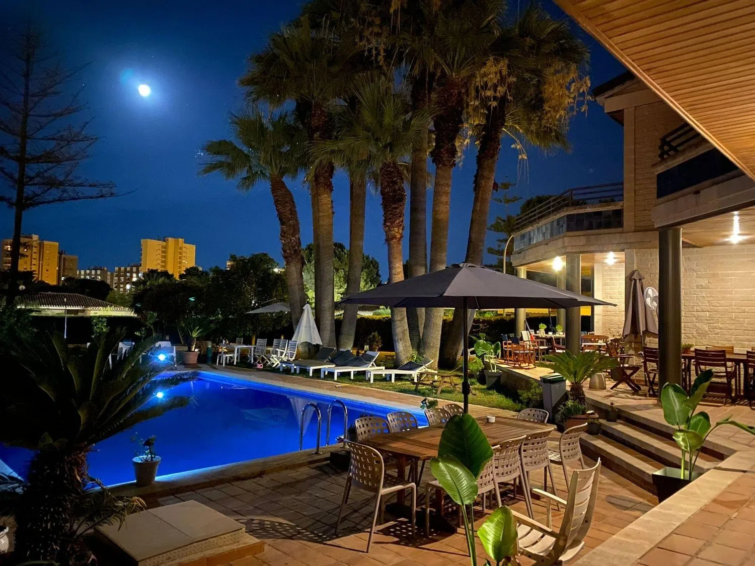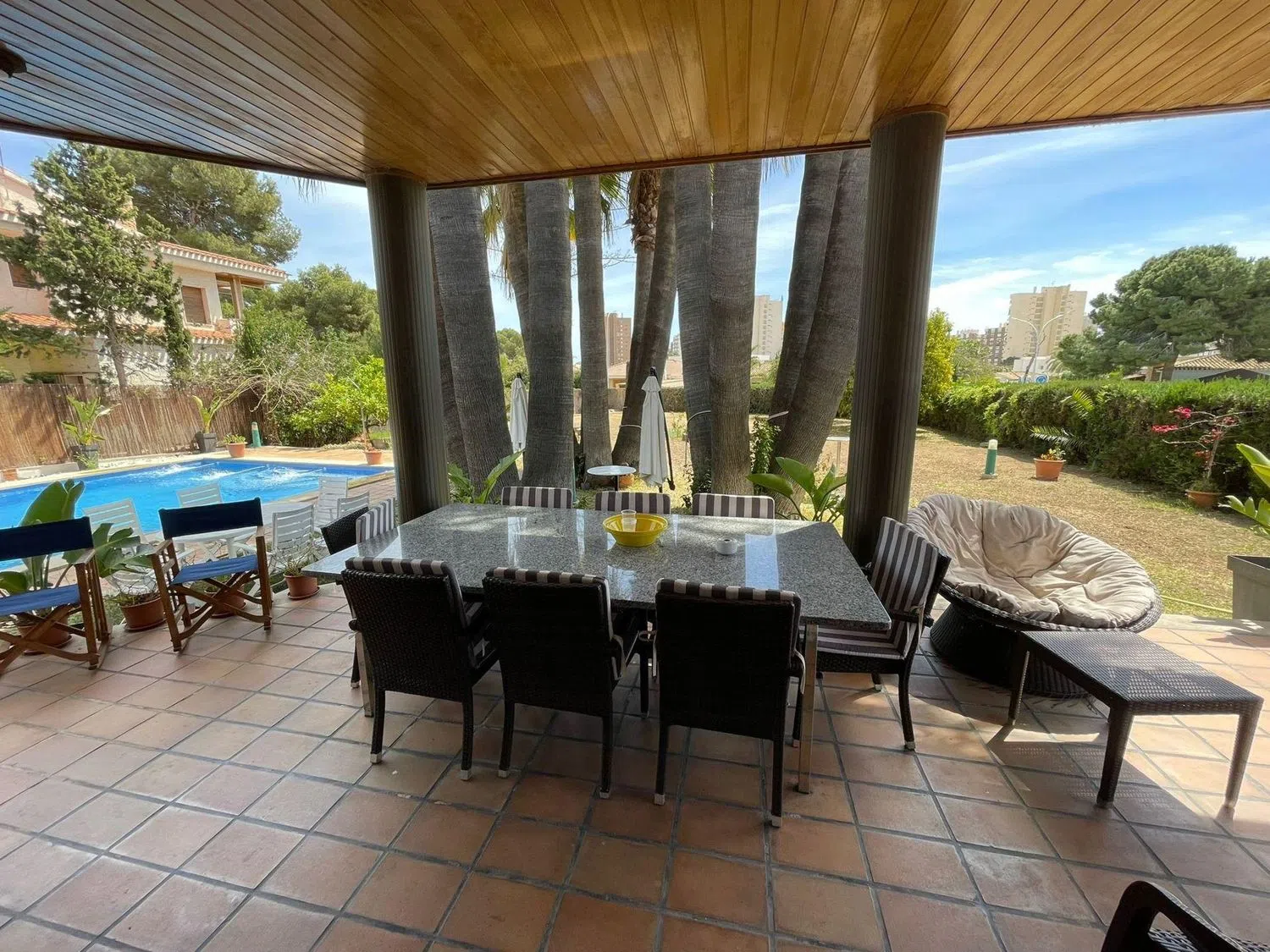 Das zweigeschossige Gebäude umfasst 5 Schlafzimmer und 3 Badezimmer. Im Außenbereich der unteren Etage erwartet Sie eine großzügige Veranda mit mehreren, nach Osten ausgerichteten Bereichen, die Ihnen herrliche Ausblicke auf den spektakulären Pool von 6 x 10 m bieten. Der Garten, geschmückt mit einem majestätischen Palmenhain, der etwa 15 mehrstämmige Palmen umfasst, schafft eine einzigartige und perfekte Atmosphäre für den Sommer. Eine der Terrassen verfügt zudem über einen Barbereich mit einem Bieranschluss, ideal für Feiern und gesellige Beisammensein im Freien.