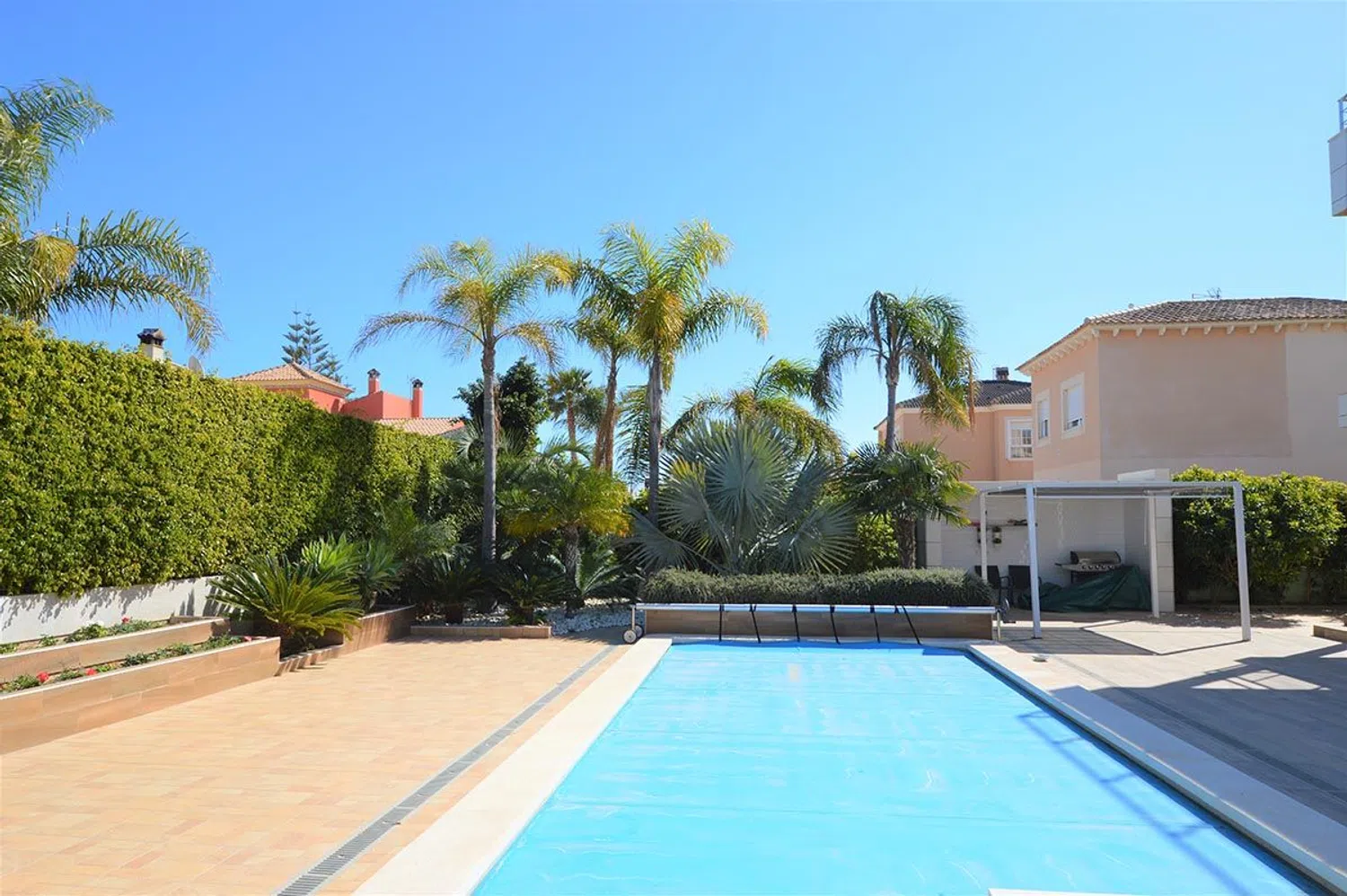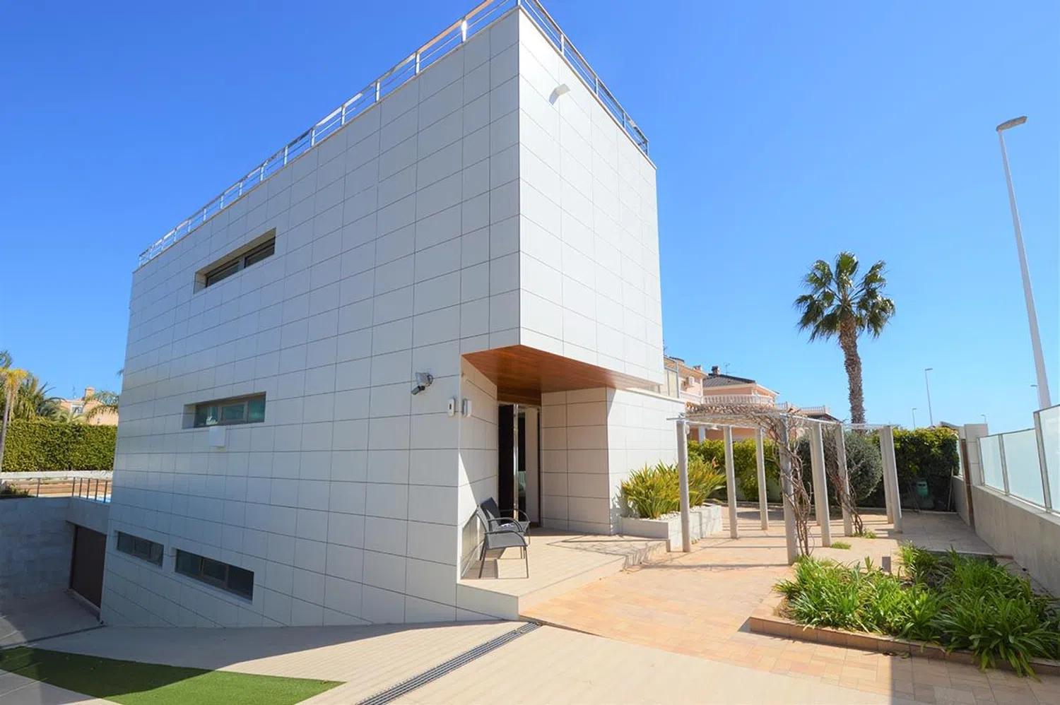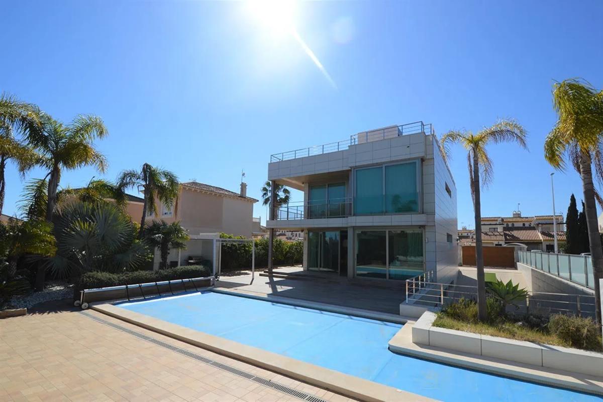 Ubicada en uno de los mejores lugares de la Costa Blanca, por su cercanía a todos los servicios y a muy poca distancia de las playas de La Zenia y Cabo Roig, a solo unos minutos caminando del centro comercial Zenia Boulevard y a menos de cinco minutos en coche de los campos de golf de la zona, como son: Las Ramblas, Villamartín y Campoamor. Se trata de una propiedad de gran diseño arquitectónico, dentro de una parcela de 703 m2 y consta de un total de 2 habitaciones y 4 baños, con un gran salón comedor, cocina semi independiente equipada con electrodomésticos de última generación, dos habitaciones con baño en suite y vestidor, posibilidad de realizar una tercera habitación para invitados, en el sótano un gran espacio abierto con grandes ventanales en el techo y mucha luz natural, dan acceso a un salón de estar con chimenea, sauna finlandesa y una preciosa bodega. Cuenta además con cuarto para lavandería, sala de maquinas y garaje privado y tambien un amplio solarium con bonitas vistas. Gran piscina privada y zona de barbacoa. Se encuentra a la venta completamente amueblado y equipado, con muebles de gran lujo y diseño, domótica en casa, aire acondicionado, energia solar y un largo etc.