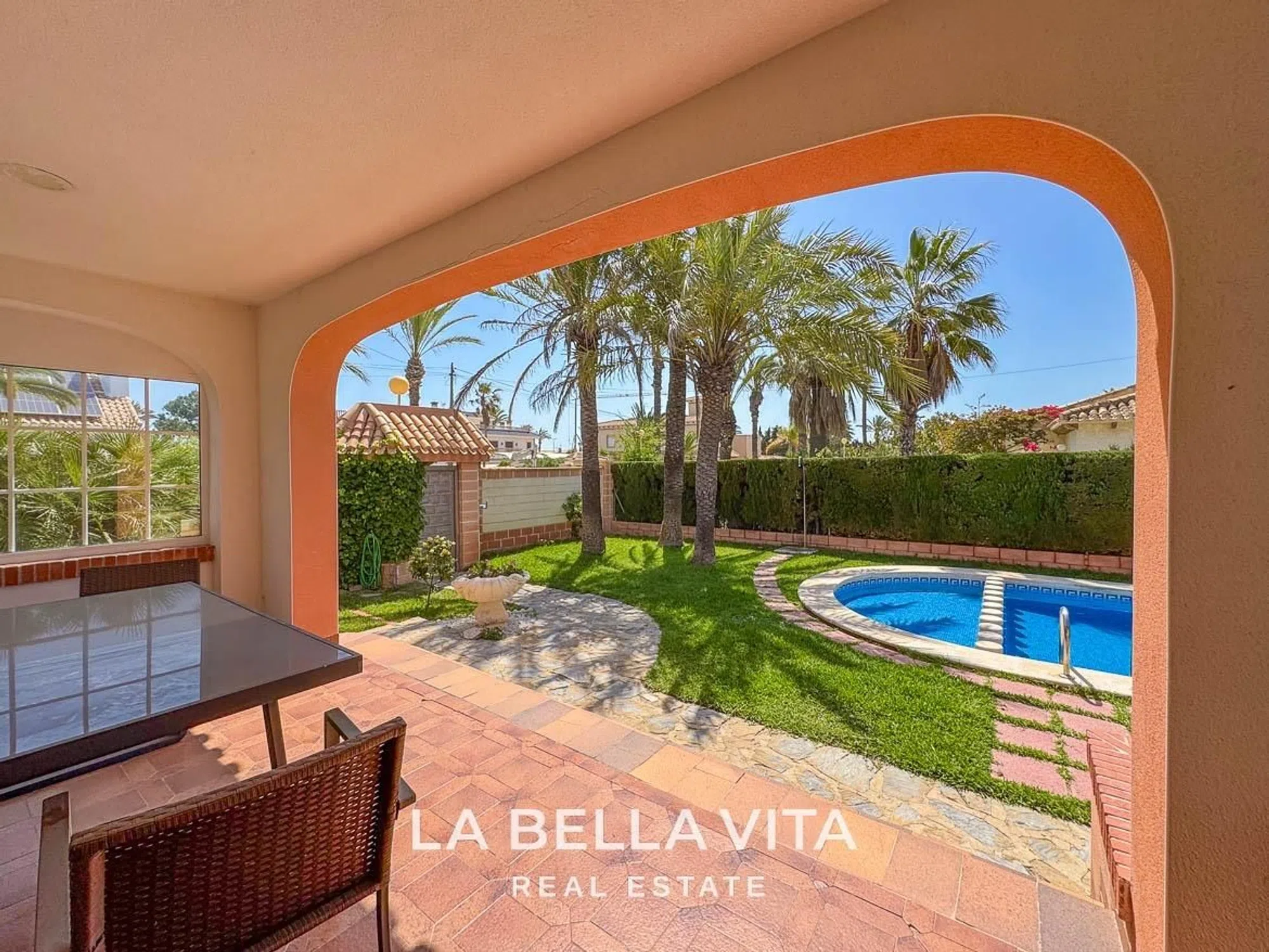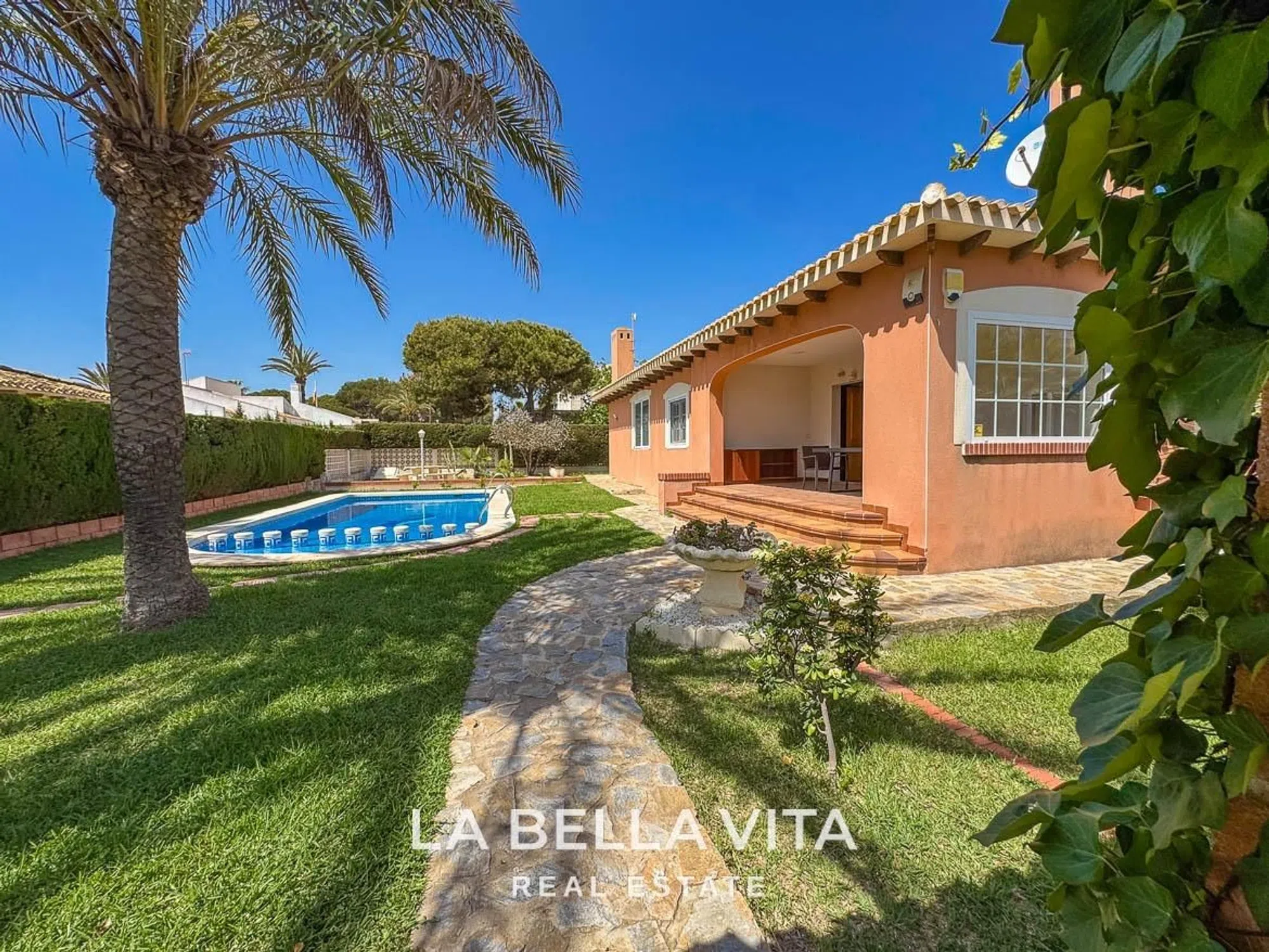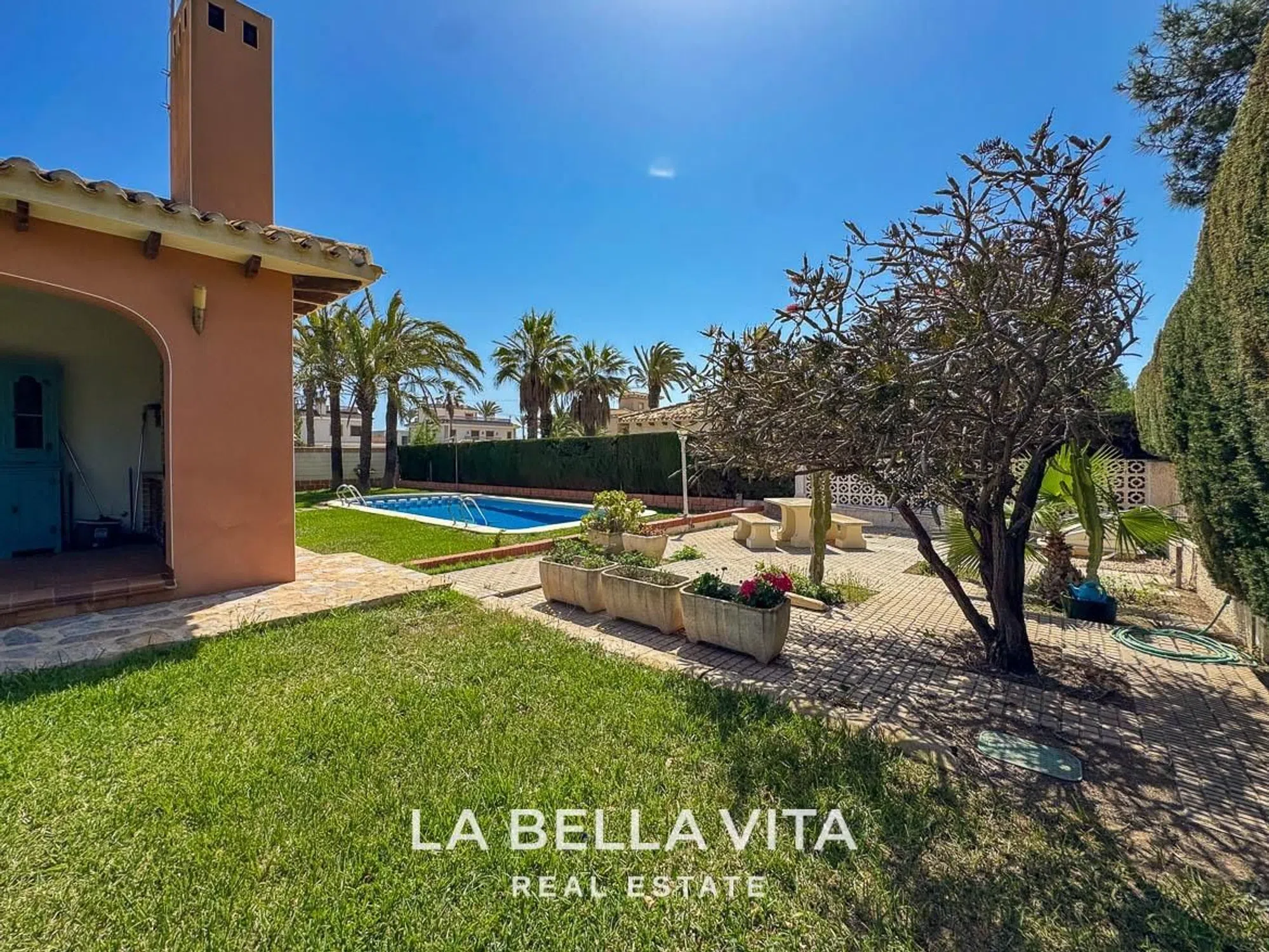 ►►► VILLA EN VENTA A SOLO 150 METROS DEL MAR EN CABO ROIG, ORIHUELA COSTA – PARCELA GRANDE, PISCINA PRIVADA Y 4 DORMITORIOS Ubicada en una de las zonas más exclusivas de Orihuela Costa, esta villa independiente de una sola planta se encuentra a solo 150 metros del mar. Una propiedad muy especial por su amplitud, privacidad y potencial, ideal para quienes buscan vivir junto al Mediterráneo sin renunciar al espacio exterior y a la tranquilidad. Construida sobre una parcela de esquina de 853 m², la vivienda ofrece un precioso jardín con césped natural, piscina privada con zona de asiento integrada, barbacoa, terraza cubierta y aparcamiento privado para varios vehículos. Todo rodeado de vegetación, palmeras y un entorno cuidado. Con una superficie construida de 195 m², la villa cuenta con 4 dormitorios dobles, 3 baños completos, un salón amplio con chimenea, cocina moderna con zona de comedor y salida directa al jardín. Además, dispone de calefacción por gas en toda la casa, lo que la hace confortable también en invierno. La vivienda se encuentra en buen estado estructural y ha sido bien mantenida, aunque también ofrece una excelente oportunidad de modernización o actualización al gusto del comprador, con un gran potencial de revalorización gracias a su ubicación privilegiada. Puntos destacados: Parcela privada de gran tamaño con jardín consolidado y piscina A solo 2 minutos caminando de la playa 4 dormitorios, 3 baños y amplias zonas de día Terraza cubierta y zona de barbacoa Parking dentro de la parcela Calefacción por gas instalada Ubicación premium en la Costa Blanca Sur: Cabo Roig es una de las zonas más cotizadas de la costa, con sus amplias avenidas, playas de arena, villas independientes y ambiente tranquilo pero con todos los servicios a mano. Cerca de supermercados, restaurantes, beach clubs, colegios internacionales, campos de golf y con fácil acceso a los aeropuertos de Murcia (35 min) y Alicante (45 min). Una propiedad perfecta como residencia habitual, casa de vacaciones o proyecto de reforma junto al mar. Muy pocas villas con estas características y tan cerca de la playa salen al mercado. Contacta con LA BELLA VITA Real Estate, especialistas en propiedades únicas en la Costa Blanca. Te acompañamos en todo el proceso con un servicio cercano, transparente y personalizado.