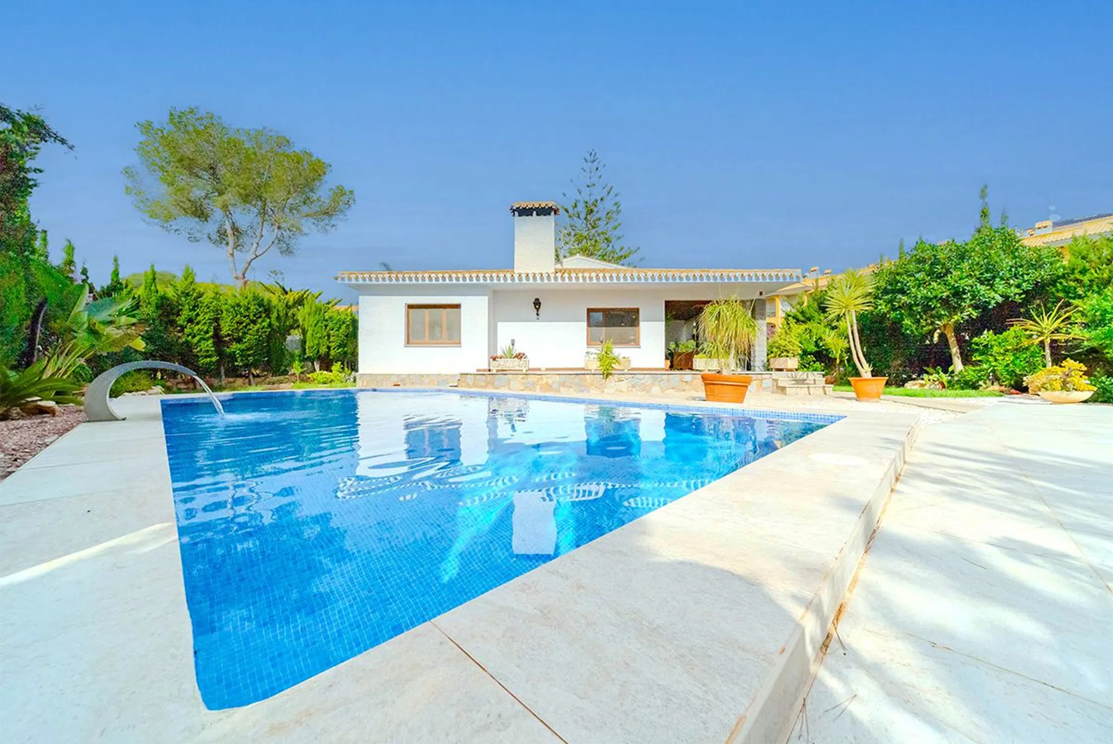 Situado en una de las más exclusivas urbanizaciones de la Costa Blanca, en un vecindario tranquilo con grandes casas unifamiliares con jardines bien cuidados, a poca distancia caminando de tiendas y servicios, bares y restaurantes, a solo 900m de la playa, con múltiples servicios comunales deportivos como varias piscinas comunitarias, pistas de tenis, padel, etc. Solamente a unos 1.9km de los mejores campos de golf de la Costa Blanca La propiedad construida en 2 plantas, 4 habitaciones y 3 baños, sótano-garaje, un gran salón comedor con chimenea, con amplia cocina en concepto abierto y un bonito porche delantero. La vivienda de 252m2 esta ubicada en una parcela de 749m2 con piscina privada y un bonito jardín bien cuidado con sus plantas aromáticas, se encuentra a la venta completamente amueblada y equipada, salvo efectos personales y cuenta con sistema de aire acondicionado por conducto en todas las habitaciones.