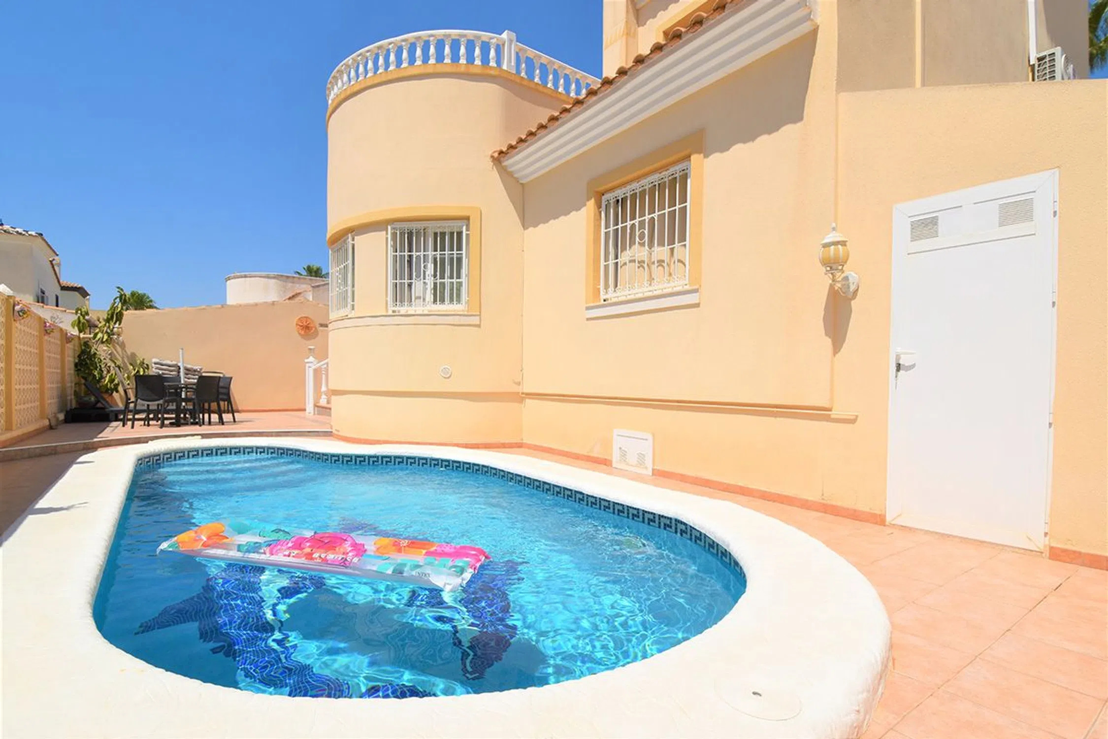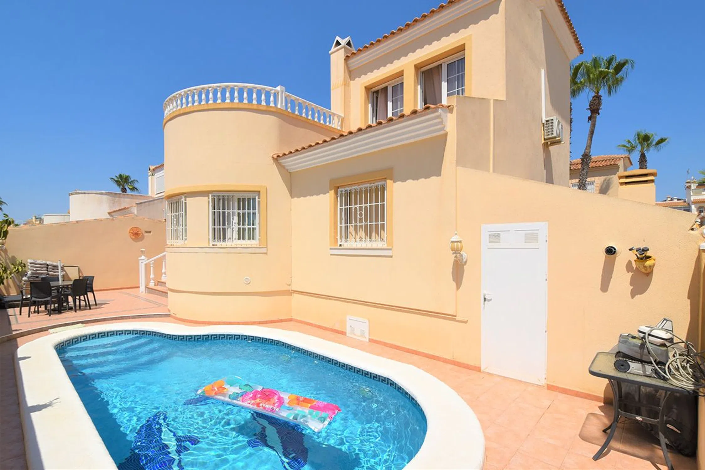 Chalet independiente con piscina privada a la venta en Playa Flamenca Situada en el corazón de la codiciada urbanización Playa Flamenca, esta propiedad destaca por su ubicación privilegiada, que permite disfrutar de todos los servicios sin necesidad de utilizar el coche. Es una oportunidad perfecta tanto para quienes buscan una residencia habitual como para quienes desean una segunda vivienda cerca del mar. A solo unos pasos se encuentran supermercados, tiendas, restaurantes y el centro deportivo municipal. Además, colegios e institutos están a menos de 1 km, lo que garantiza una vida práctica y cómoda para familias. En un corto paseo se accede al reconocido centro comercial Zenia Boulevard y a las idílicas playas de Cala La Mosca y Playa Flamenca, donde el mar y el entorno natural se integran en el día a día. La vivienda se distribuye en dos plantas construidas sobre una parcela de 260 m². Dispone de 3 amplios dormitorios —dos de ellos en planta baja— y 2 baños completos. El espacioso salón-comedor cuenta con chimenea, creando un ambiente cálido y acogedor. El porche delantero, acristalado, y el vestíbulo con entrada adicional aportan funcionalidad y confort. La cocina, independiente y bien equipada, completa la distribución interior. El exterior ha sido diseñado para ofrecer el máximo bienestar y privacidad. La parcela alberga una piscina privada, ideal para los días cálidos, y un jardín cuidado con zona de barbacoa, perfecto para reuniones o momentos de relax al aire libre. Su excelente orientación garantiza tranquilidad y luminosidad, alejada del bullicio pero cerca de todo lo necesario. También cuenta con una plaza de aparcamiento privada y un trastero que incluye calefacción central por gasoil. La propiedad se vende completamente amueblada y equipada (excepto efectos personales), lo que permite entrar a vivir de inmediato sin necesidad de realizar ninguna inversión adicional. Una magnífica oportunidad para adquirir una vivienda con todas las comodidades, en una ubicación excepcional, y con acceso inmediato a los mejores servicios, playas y zonas de ocio de la Costa Blanca. Una propiedad que lo tiene todo para disfrutar del estilo de vida que siempre has soñado.