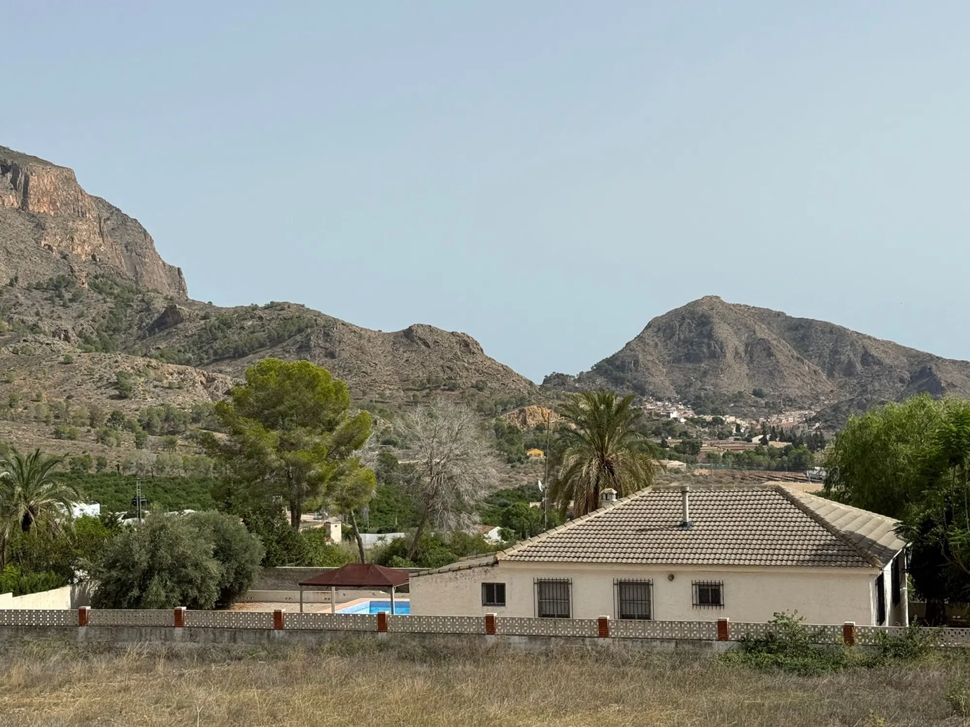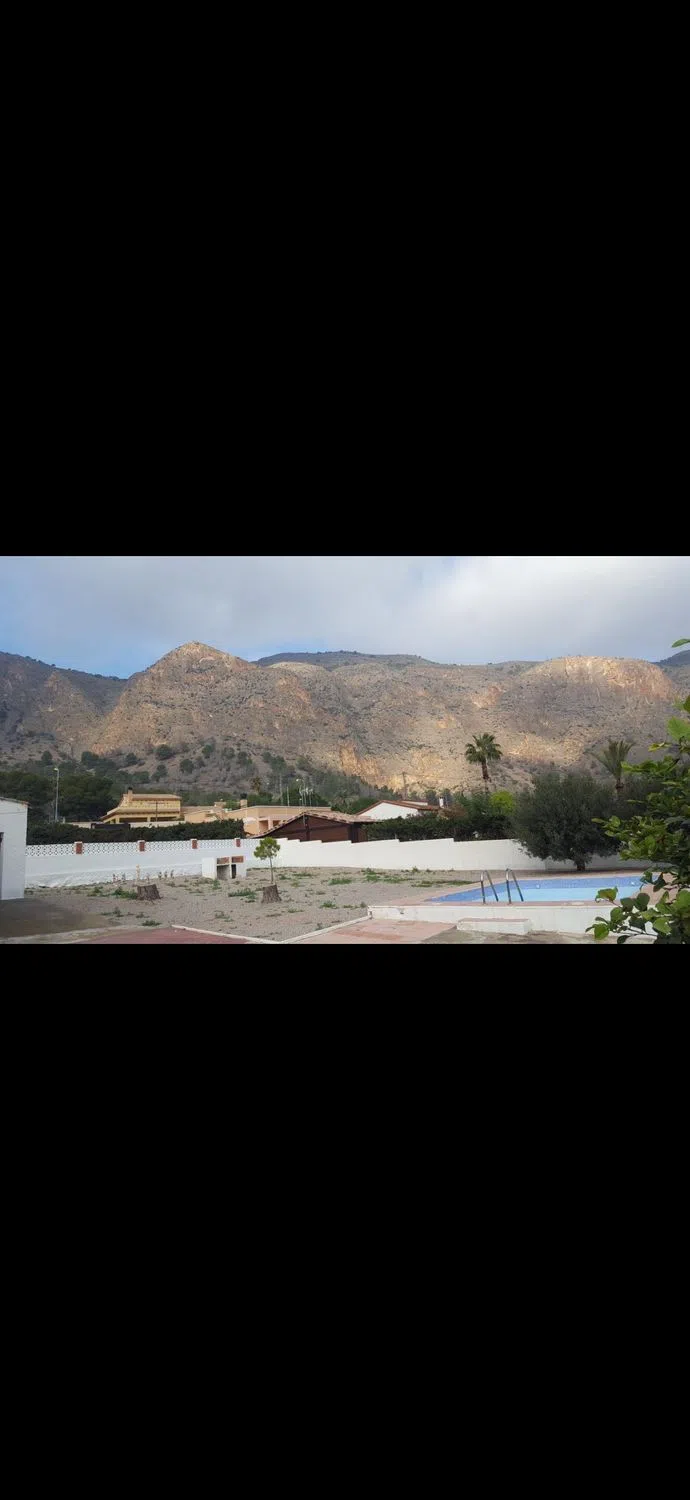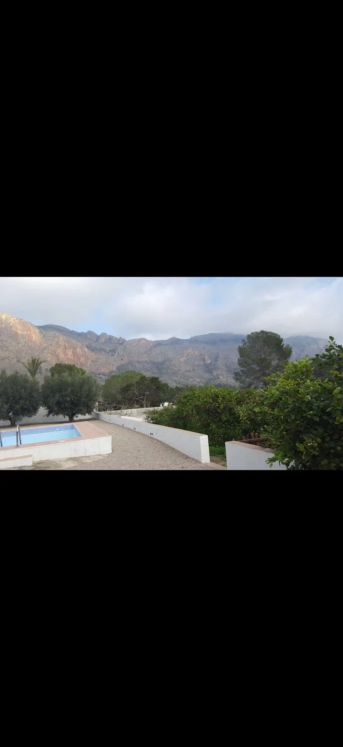 Casa con vistas a la sierra y Orihuela, equipada, tres habitaciones amplias dos de ellas con armarios empotrados, un baño con ducha y un aseo, cuarto de colada, salón comedor amplio, terraza y 1400m2 con piscina, almacén y puerta corredera para poder acceder en coche.