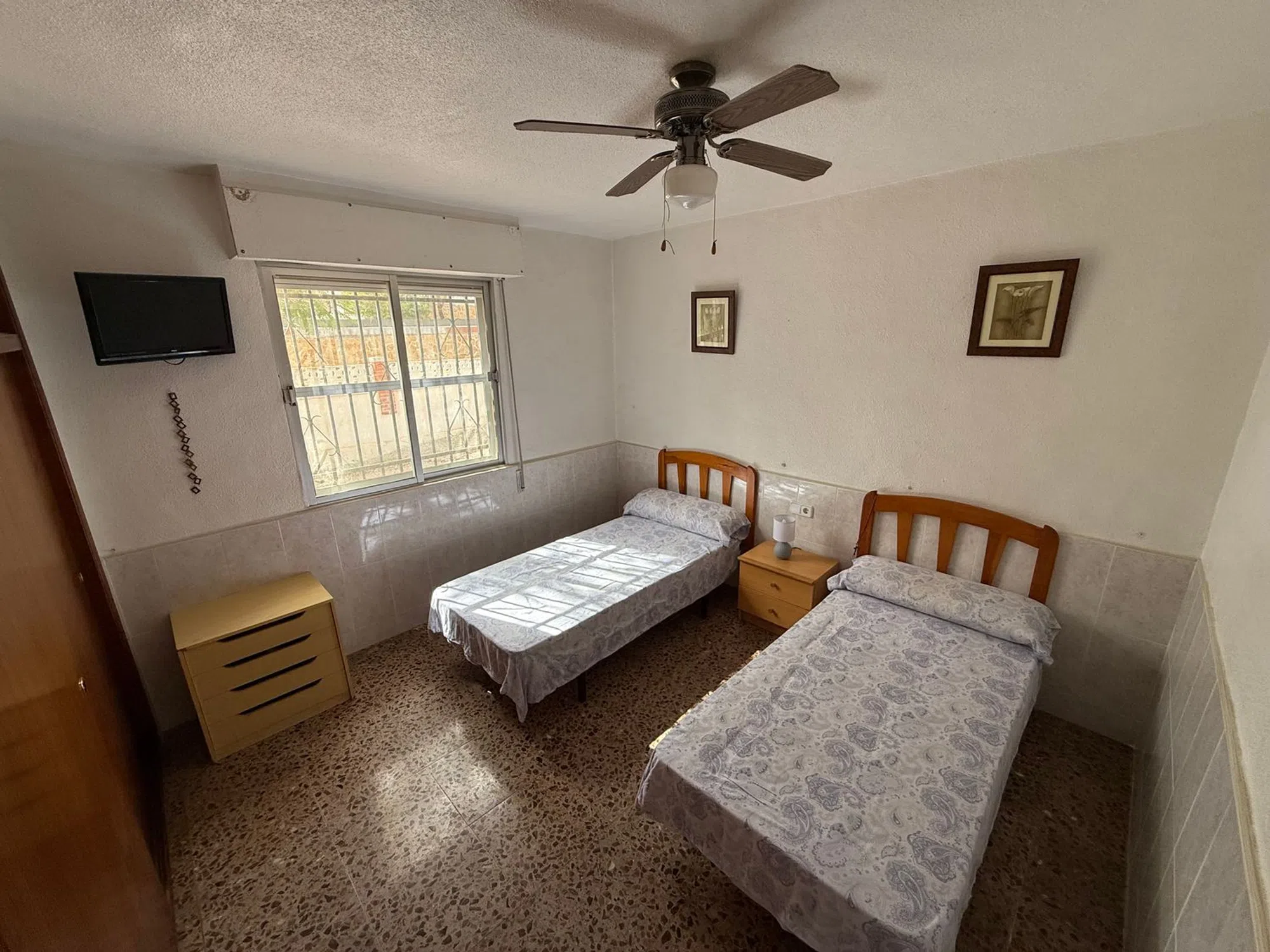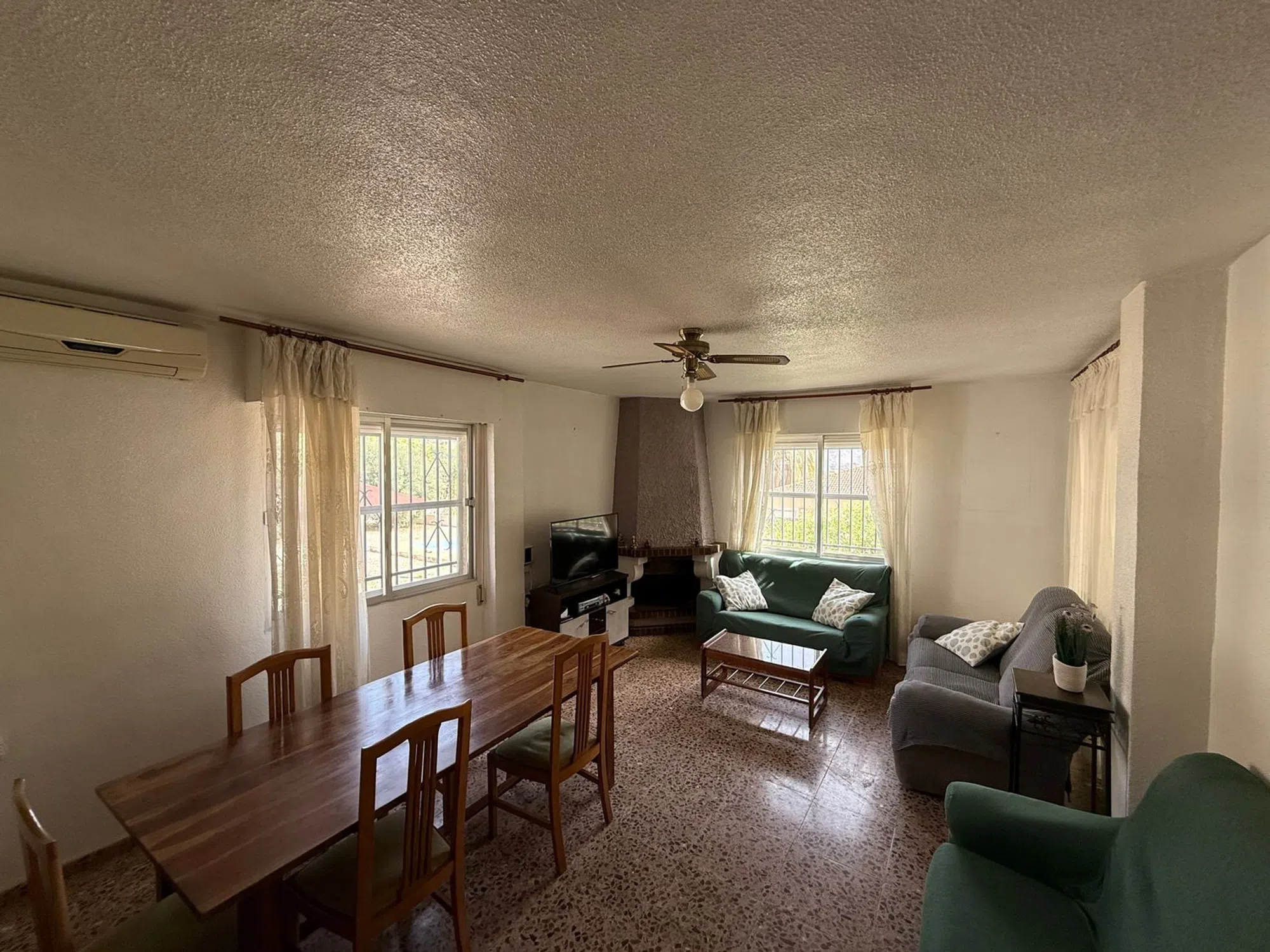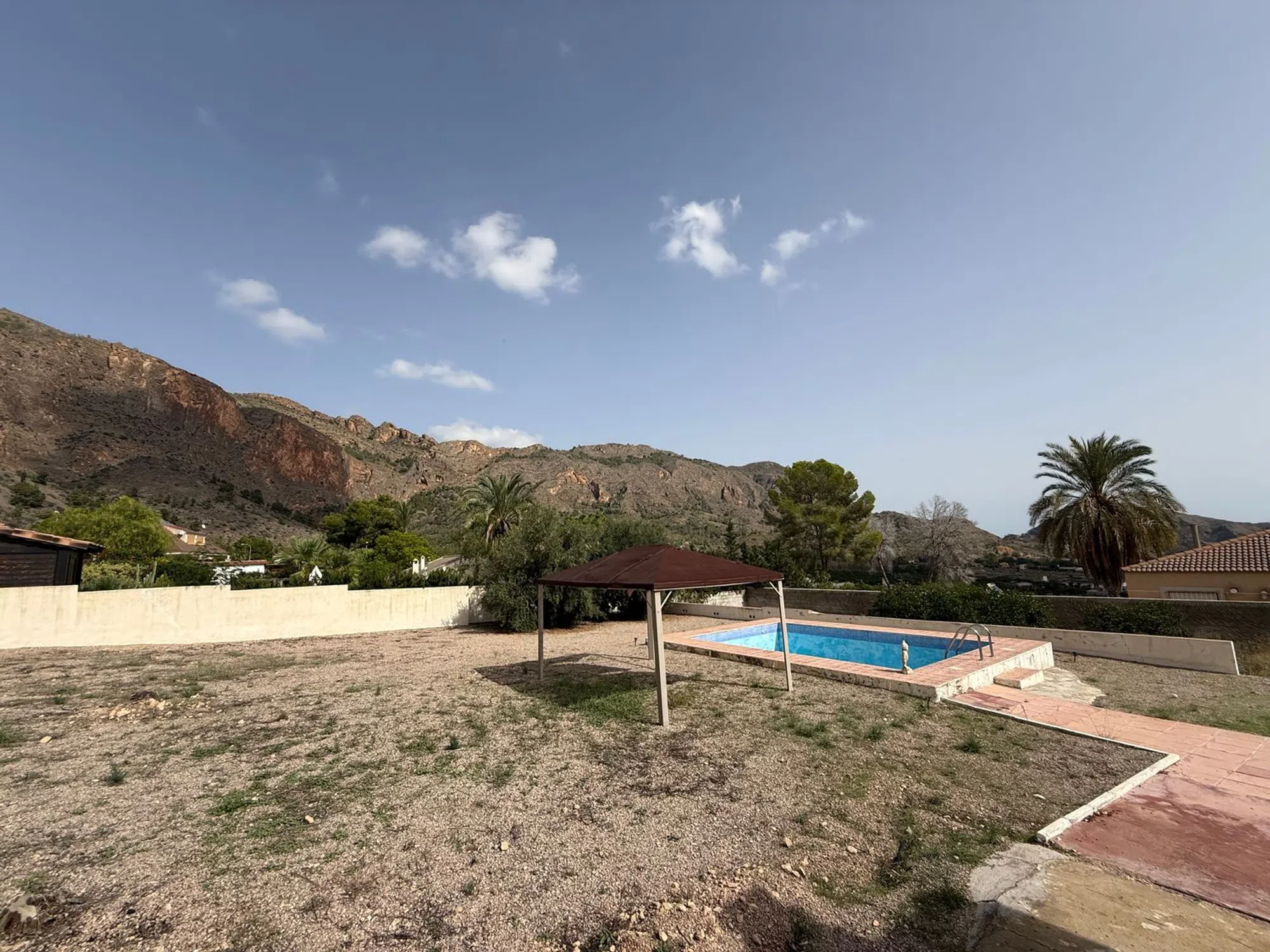 Casa con vistas a la sierra y Orihuela, equipada, tres habitaciones amplias dos de ellas con armarios empotrados, un baño con ducha y un aseo, cuarto de colada, salón comedor amplio, terraza y 1400m2 con piscina, almacén y puerta corredera para poder acceder en coche.