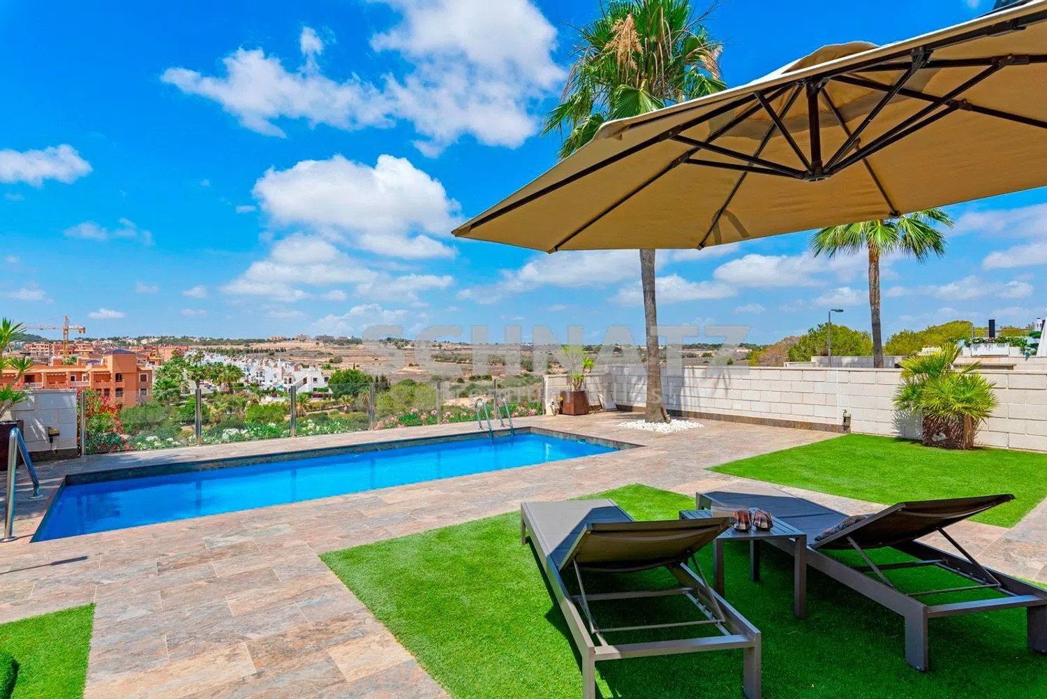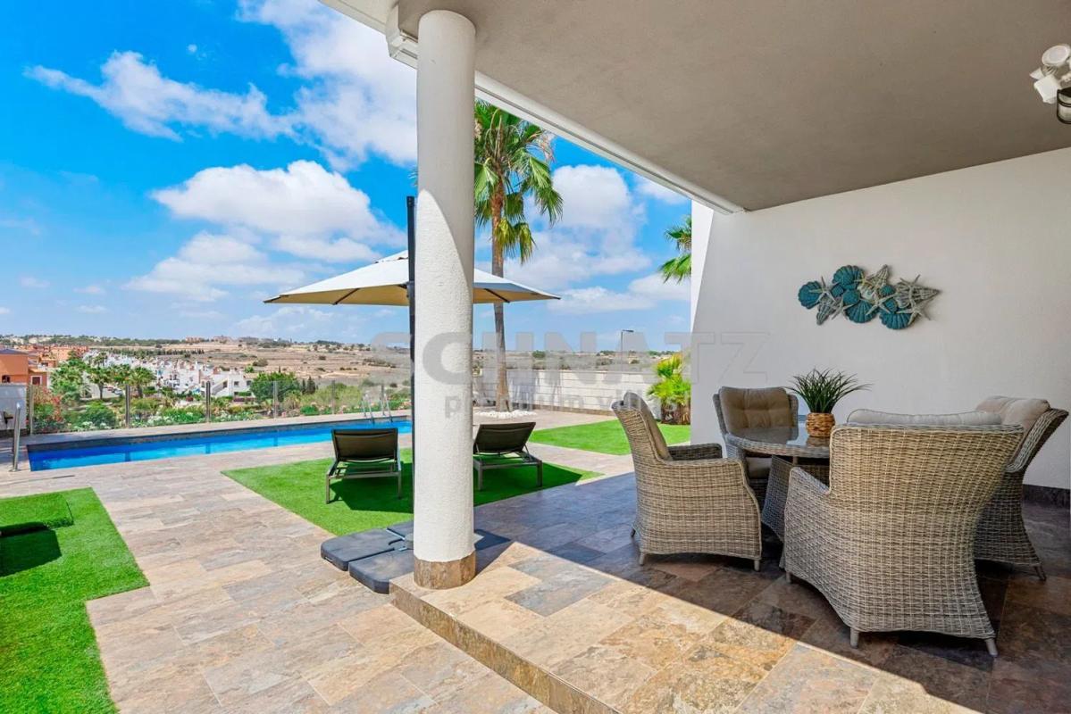 Villa en venta con impresionantes vistas, ubicada en Villamartín, Orihuela Costa. Se trata de una de las zonas más codiciadas de la Costa Blanca. Esta villa de estilo moderno cuenta con acabados de alta calidad. Tiene 3 amplios dormitorios con armarios hechos a medida, 2 baños y cocina con electrodomésticos integrados. Junto a la cocina encontramos el trastero/ lavadero, un espacio práctico y funcional con almacenamiento extra. Desde el salón se puede disfrutar de vistas panorámicas al jardín y alrededores. El jardín tiene baldosas y césped artificial, lo que facilita su mantenimiento. El acceso rodado es a través de una puerta automática. Desde la amplia terraza de la azotea podrá relajarse y disfrutar de las impresionantes vistas al mar y a los lagos salados. Nuestra interiorista Luna puede asesorarle y convertir esta casa en un hogar acogedor y totalmente a su gusto. No dude en contactarnos. .