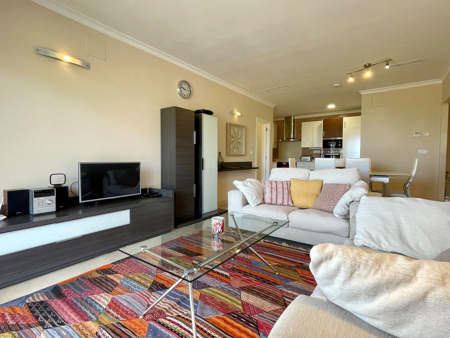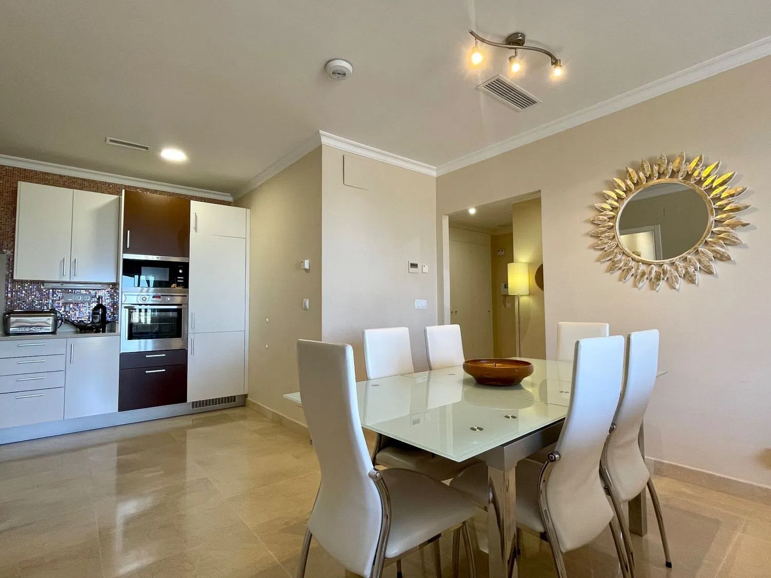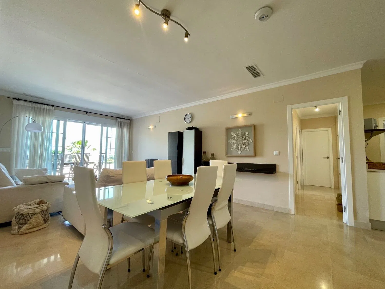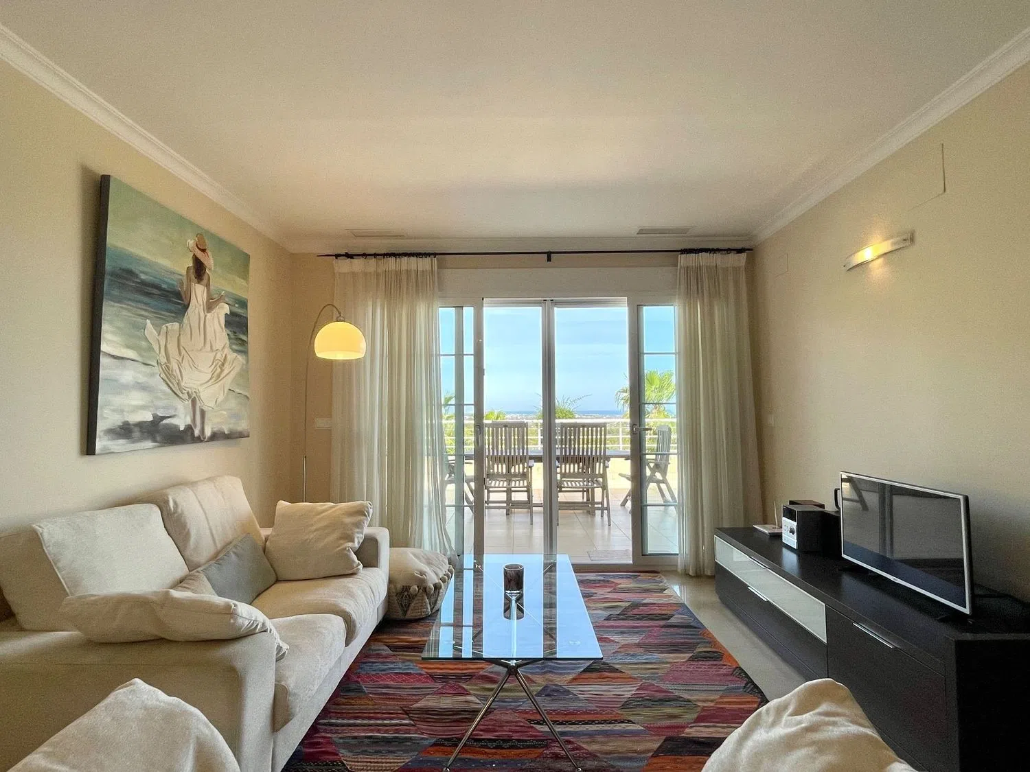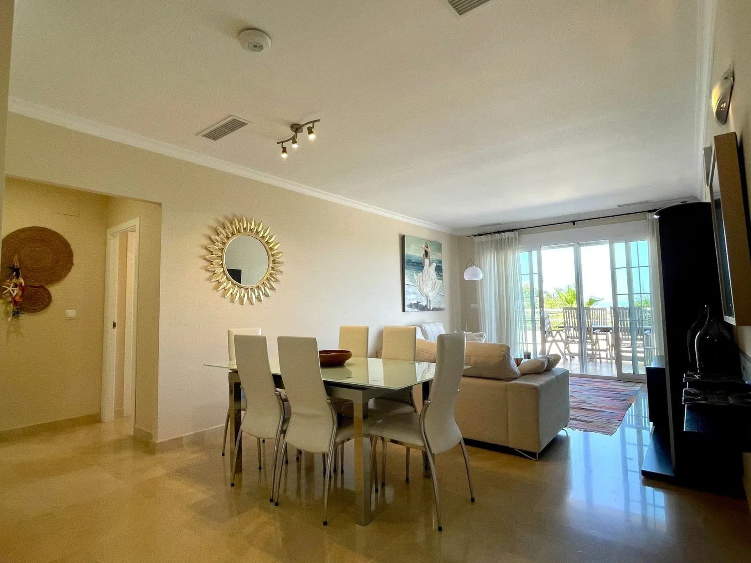 Das Apartment erstreckt sich über eine Etage und bietet ein geräumiges Wohn- und Esszimmer, eine offene Küche mit Hauswirtschaftsraum, drei Doppelzimmer und drei Badezimmer, von denen eines en-suite ist. Eine große Terrasse von ca. 60 m² ist von allen Wohnbereichen zugänglich und beeindruckt mit spektakulären Ausblicken auf das Meer, die Küstenlinie und die umliegenden Berge.