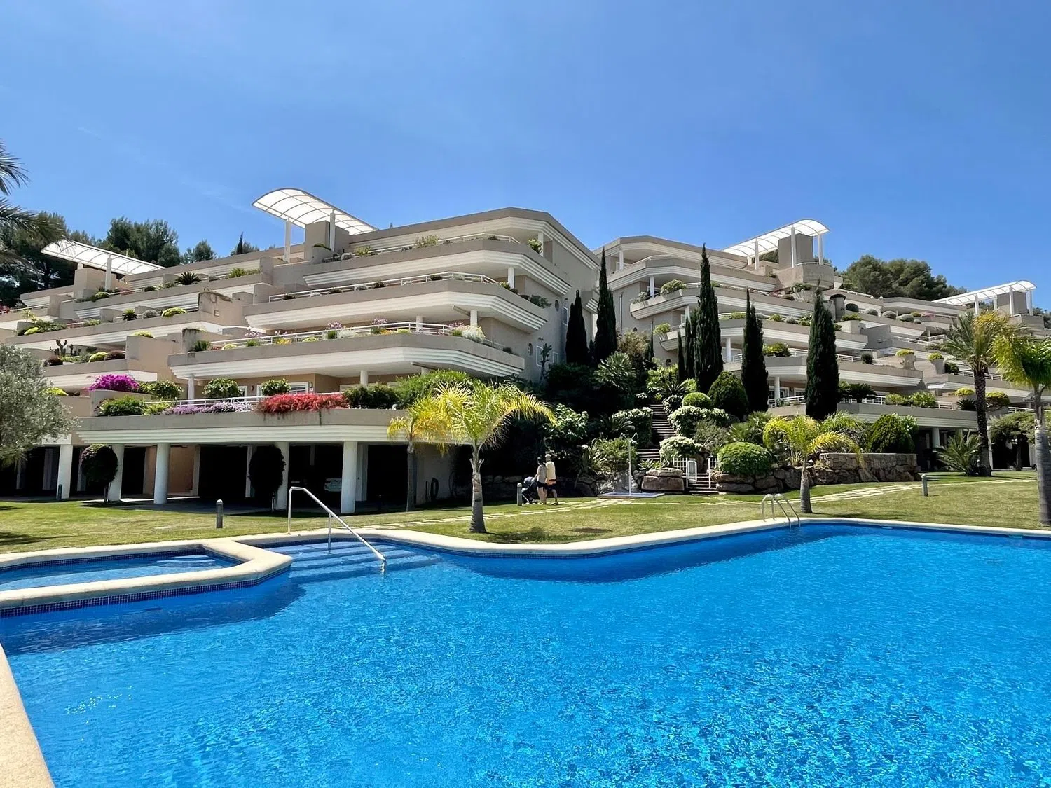 Zusätzlich bietet der Komplex einen schönen Salzwasserpool und einen weitläufigen Garten mit palmenbestandenen Flächen. Er ist in der Nähe des sozialen Zentrums der Wohnanlage gelegen und gewinnt an Attraktivität durch seine Exklusivität und den gebotenen Komfort. Zu den weiteren Annehmlichkeiten zählen hochwertige Haushaltsgeräte, doppelt verglaste Fenster mit elektrischen Rollläden, ein modernes Hausautomationssystem, Fußbodenheizung, eine Klimaanlage mit Kanalsystem (Kälte, Wärme und Belüftung), ein überdachter Parkplatz und ein Abstellraum.