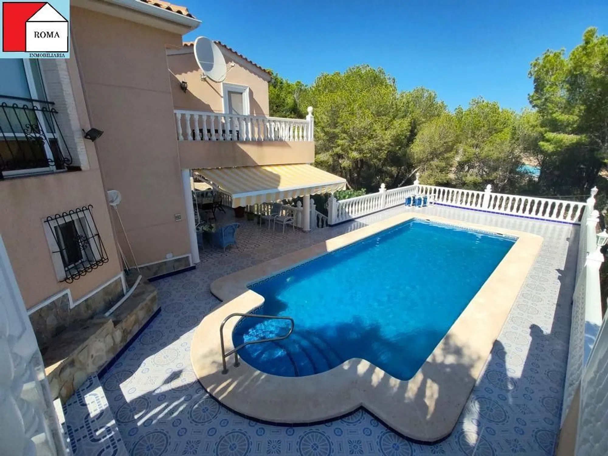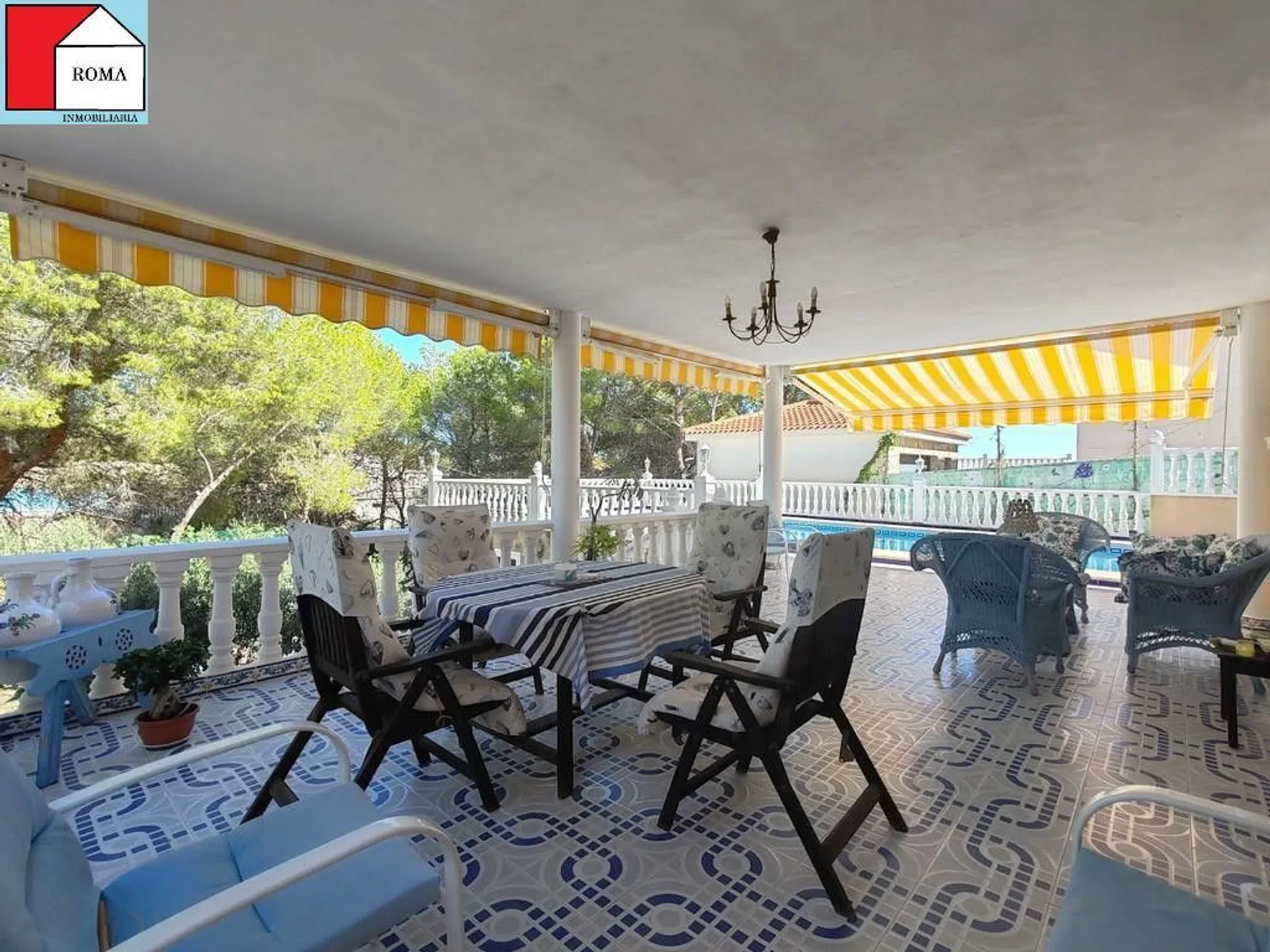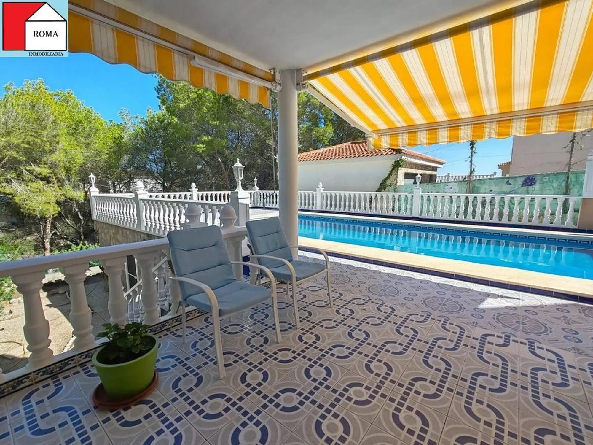 Chalet en el Pinar de Campoverde con una parcela de 975 m2 y 300m2 construidos. La casa principal se distribuye de la siguiente manera: primero nos encontramos con dos habitaciones, una de ellas comunica con una terraza abierta, y además tiene baño privado. Salón-comedor con acceso a una terraza acristalada, cocina independiente, y un baño mas. Bajamos por una escalera de caracol y ahí vemos una salita de estar, un baño y dos dormitorios, uno de ellos con acceso a un porche exterior que te guía directamente a la piscina Y a parte, un apartamento de invitados de una habitación con cocina americana y un baño. Tiene garaje con puerta automática y con capacidad para un coche, además de una barbacoa cubierta. [IW].