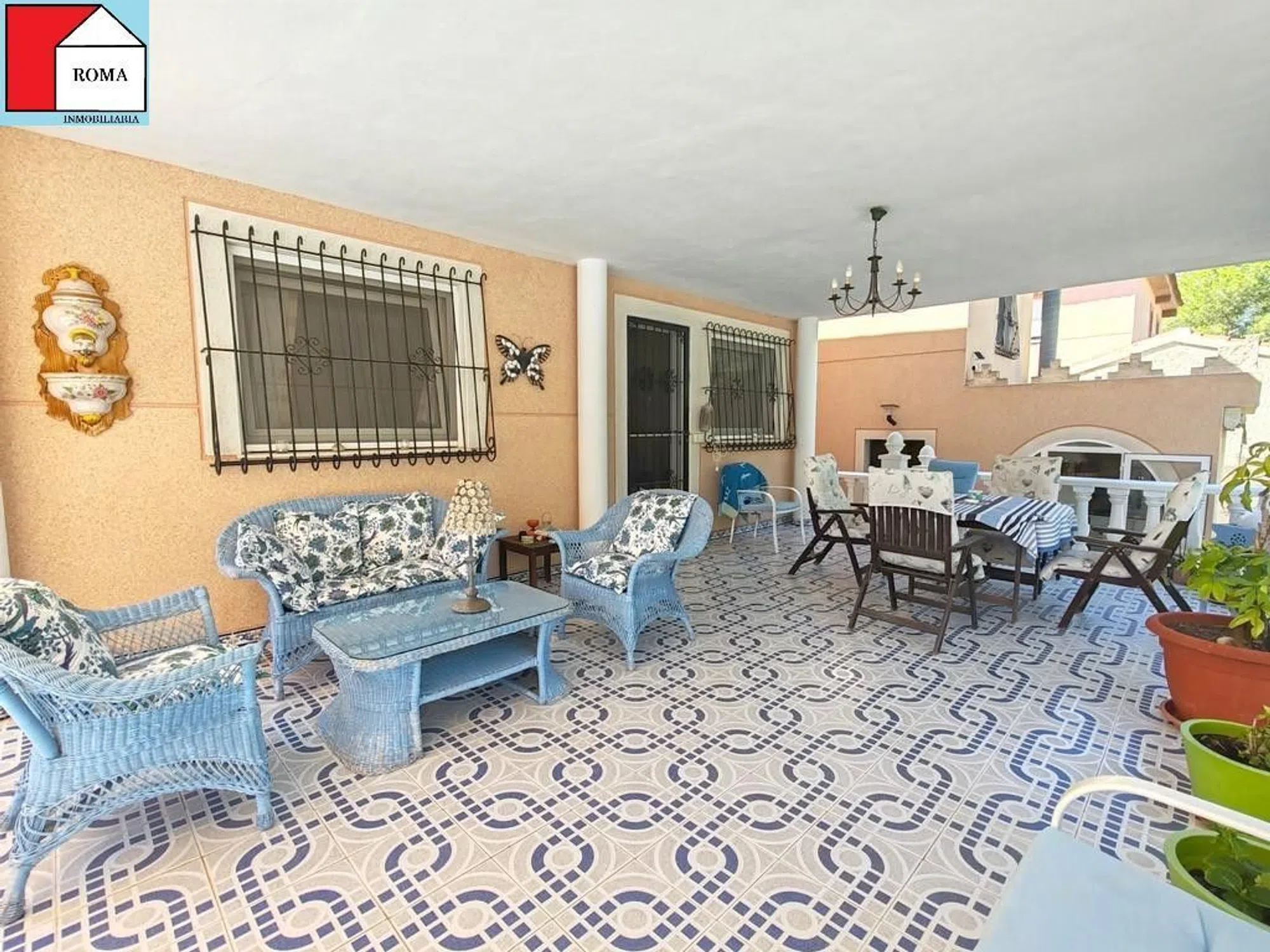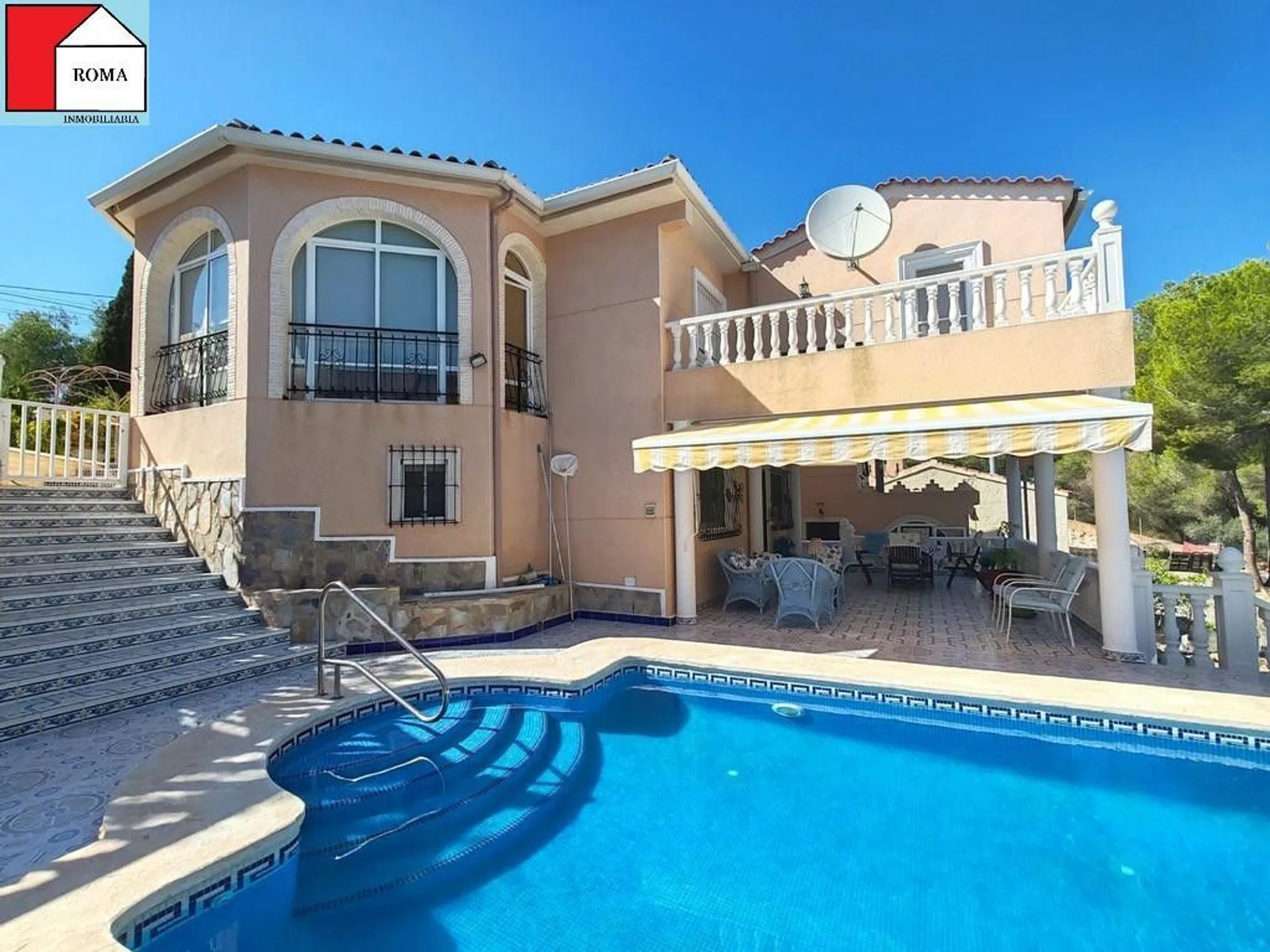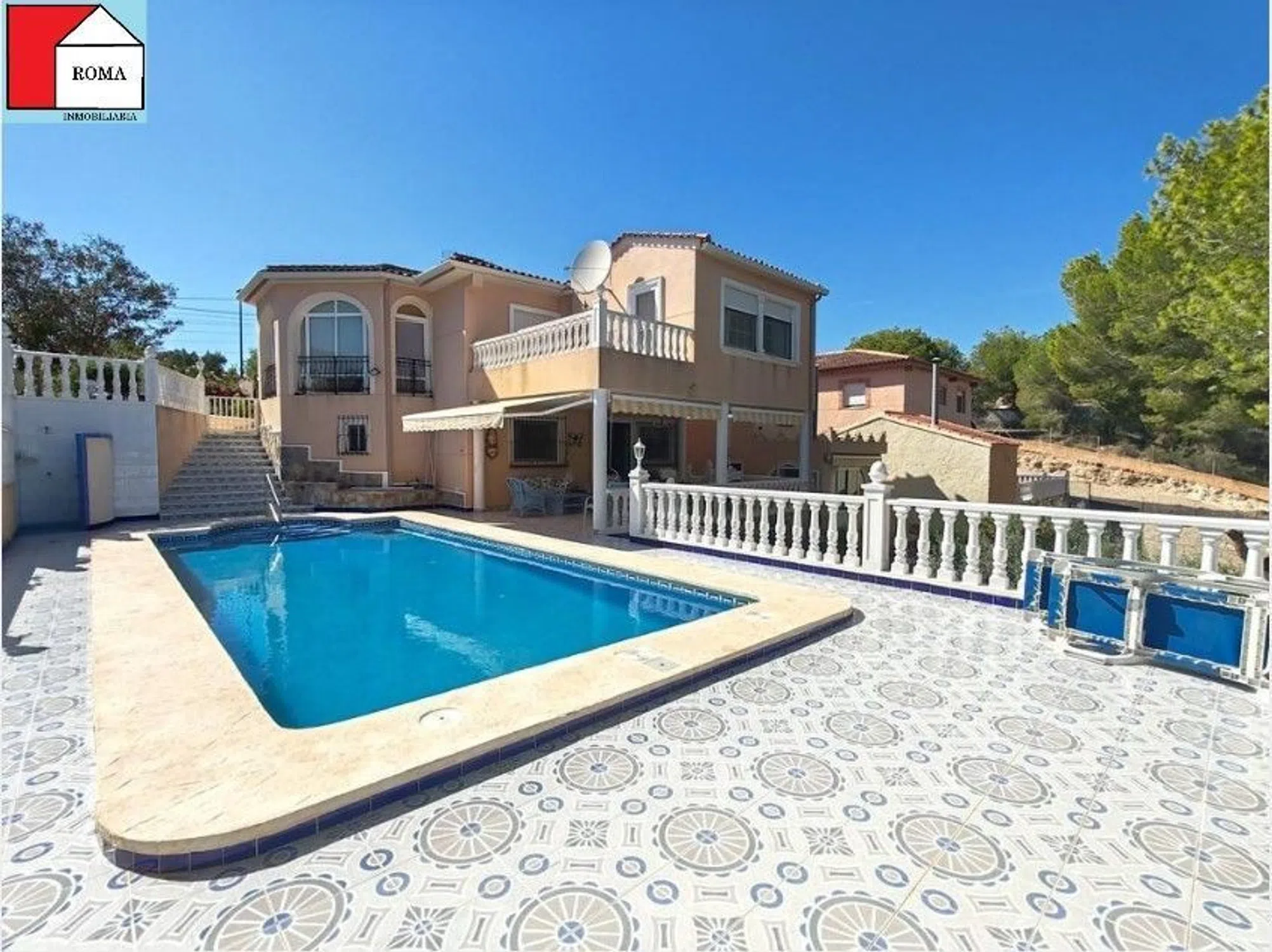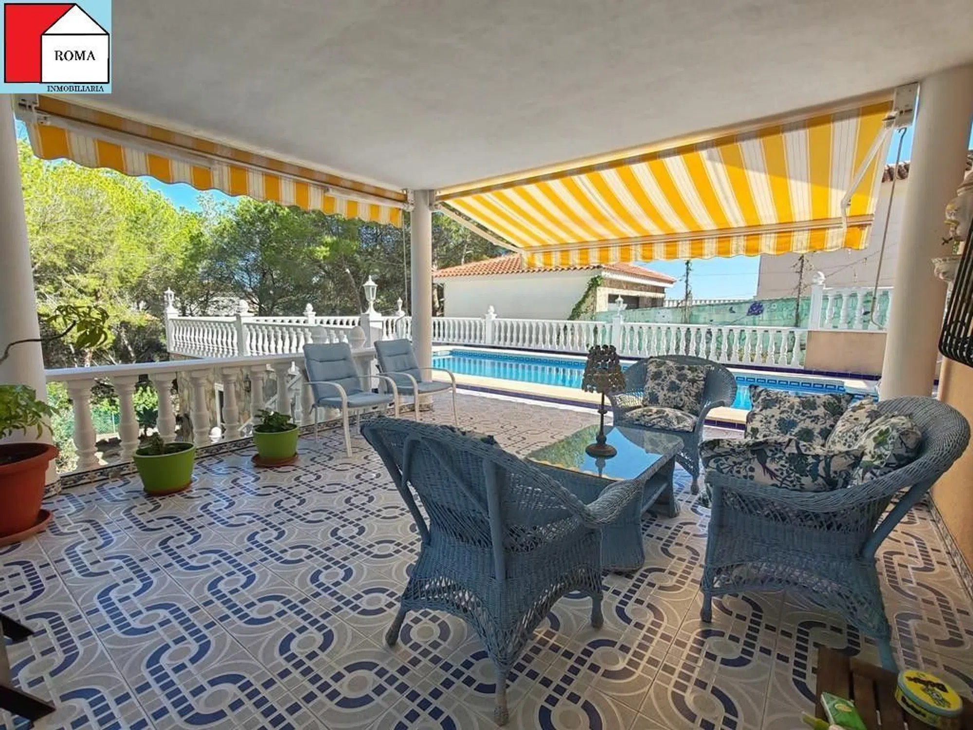 Chalet en el Pinar de Campoverde con una parcela de 975 m2 y 300m2 construidos. La casa principal se distribuye de la siguiente manera: primero nos encontramos con dos habitaciones, una de ellas comunica con una terraza abierta, y además tiene baño privado. Salón-comedor con acceso a una terraza acristalada, cocina independiente, y un baño mas. Bajamos por una escalera de caracol y ahí vemos una salita de estar, un baño y dos dormitorios, uno de ellos con acceso a un porche exterior que te guía directamente a la piscina Y a parte, un apartamento de invitados de una habitación con cocina americana y un baño. Tiene garaje con puerta automática y con capacidad para un coche, además de una barbacoa cubierta. [IW].