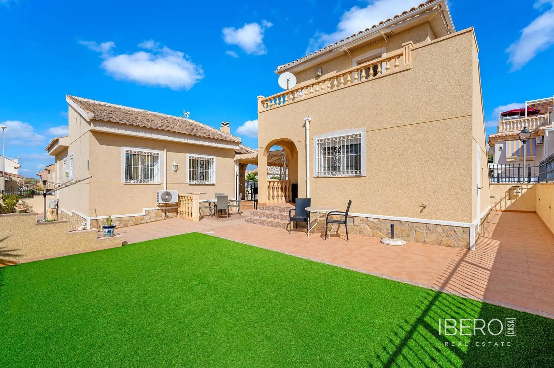 Propiedad Única con Gran Potencial – Ideal tanto para vivir como para alquilar Bienvenido a Atalaya Park, una zona residencial moderna y tranquila, a poca distancia de Benijófar, Ciudad Quesada y el Colegio Noruego en Rojales. Ubicada en una soleada parcela en esquina, esta propiedad ofrece algo verdaderamente especial: una casa principal más una segunda edificación con dos apartamentos independientes – una combinación poco común con infinitas posibilidades. La vivienda principal está construida con estándares de accesibilidad, totalmente adaptada para sillas de ruedas y diseñada para disfrutar de una cómoda vida en una sola planta. Dispone de un luminoso salón-comedor, una cocina práctica, tres dormitorios y dos baños – incluido un baño en suite en el dormitorio principal. La segunda edificación consta de dos apartamentos independientes, perfectos para invitados, familia o para generar ingresos por alquiler. * La planta baja incluye salón con cocina integrada, un dormitorio, un baño y trastero. * El apartamento superior ofrece un dormitorio, un baño, una pequeña sala de estar, trastero y un balcón. El espacio exterior es de fácil mantenimiento y orientado al sur, con zonas pavimentadas, una cochera cubierta y una sección de césped artificial que podría transformarse en una piscina privada. Además, los residentes disfrutan de acceso a una cuidada piscina comunitaria. Construida en 2011 y muy bien mantenida, con infraestructura completa incluyendo la opción de conexión a gas natural, esta propiedad combina comodidad, flexibilidad y un gran potencial de inversión. Destacados: * Dos viviendas con un total de 5 dormitorios, 4 baños y 2 cocinas * Casa principal diseñada con estándares de accesibilidad, totalmente adaptada para sillas de ruedas * Dos apartamentos independientes – ideales para alquiler o visitas * Soleada parcela en esquina de 414 m² orientada al sur * Cochera, trasteros y posibilidad de piscina privada * Acceso a piscina comunitaria * A poca distancia de tiendas, restaurantes y del Colegio Noruego Una oportunidad única – ¡contáctenos hoy mismo para concertar una visita!