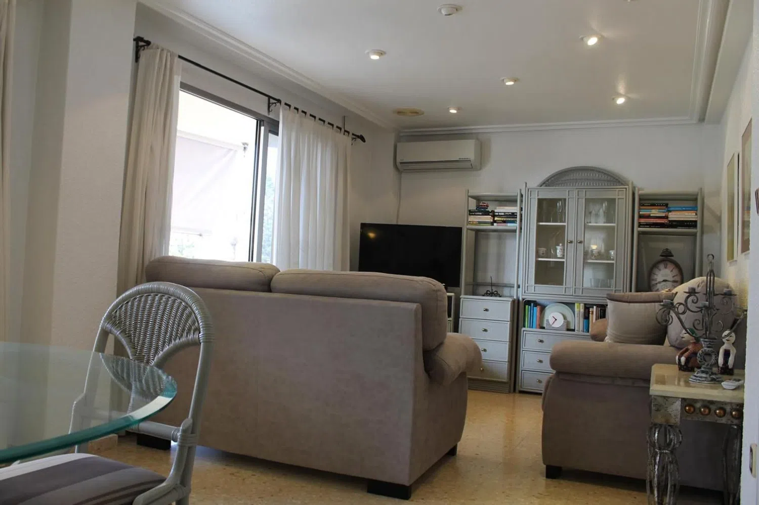 Das großzügige und sonnige Wohnzimmer öffnet sich zu einer Terrasse, die ideal ist, um die mediterrane Brise und das milde Klima zu genießen. Die modernen Aluminiumfenster sorgen für hervorragende Isolierung, während die Sicherheitstür den Bewohnern ein Gefühl der Ruhe und Sicherheit gibt.