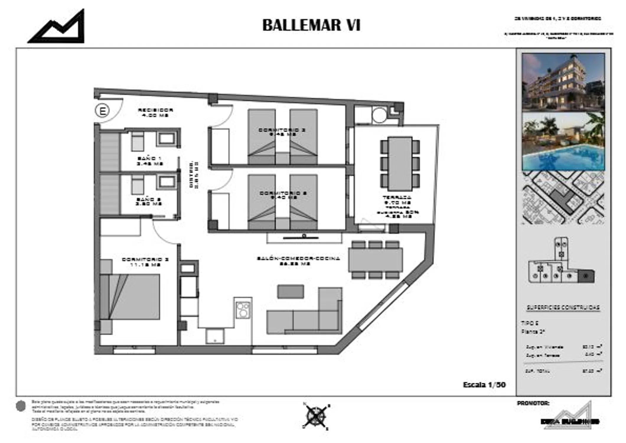 Ballemar VI: 28 viviendas con olor a mar. Ballemar VI es mucho más que una nueva promoción residencial, es una oportunidad para vivir con calidad, comodidad y privilegio de tener al mar muy cerca. Situado en la calle Maestro Alfonsea, 13, en Santa Pola, es exclusivo edificio alberga 28 viviendas de 1, 2 y 3 dormitorios, diseñadas pensando en el bienestar y el estilo de vida mediterráneo. Cada vivienda incluye plaza de garaje y trastero, añadiendo funcionalidad y valor a tu hogar. Además, las viviendas tienen todos los electrodomésticos incluidos. En la cubierta del edificio, los residentes podrán disfrutar de unas zonas comunes únicas, con piscina y solárium, ideales para relajarse, tomar el sol o compartir momentos en familia o con sus amigos mientras se contempla el horizonte. Ballemar VI destaca por su excelente localización, con todos los servicios necesarios al alcance. A tan solo 400 metros de la estación de autobuses de Santa Pola, 300 metros de grandes supermercados y a 700 metros del centro urbano, disfrutarás de una conectividad y comodidad excepcionales. La playa se encuentra a 900 metros, permitiéndote ir caminando a disfrutar del mar siempre que lo desees. El aeropuerto está a apenas a 14 km, lo que facilita los desplazamientos tanto para residentes como para visitantes. Ballemar VI será una promoción de referencia en la zona gracias a su cuidado diseño arquitectónico, sus excelentes prestaciones y la alta calidad de los materiales empleados en la construcción. Cada detalle ha sido pensado para ofrecer espacios funcionales, modernos y confortables, que respondan a las necesidades del día a día sin renunciar al estilo. Fecha de inicio de las obras: 4º trimestre 2025. Fecha fin de las obras: 2º trimestre 2027.