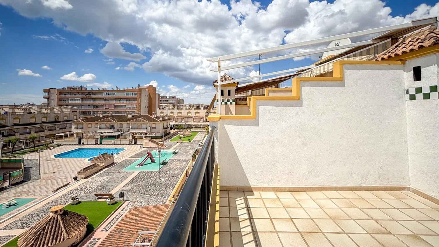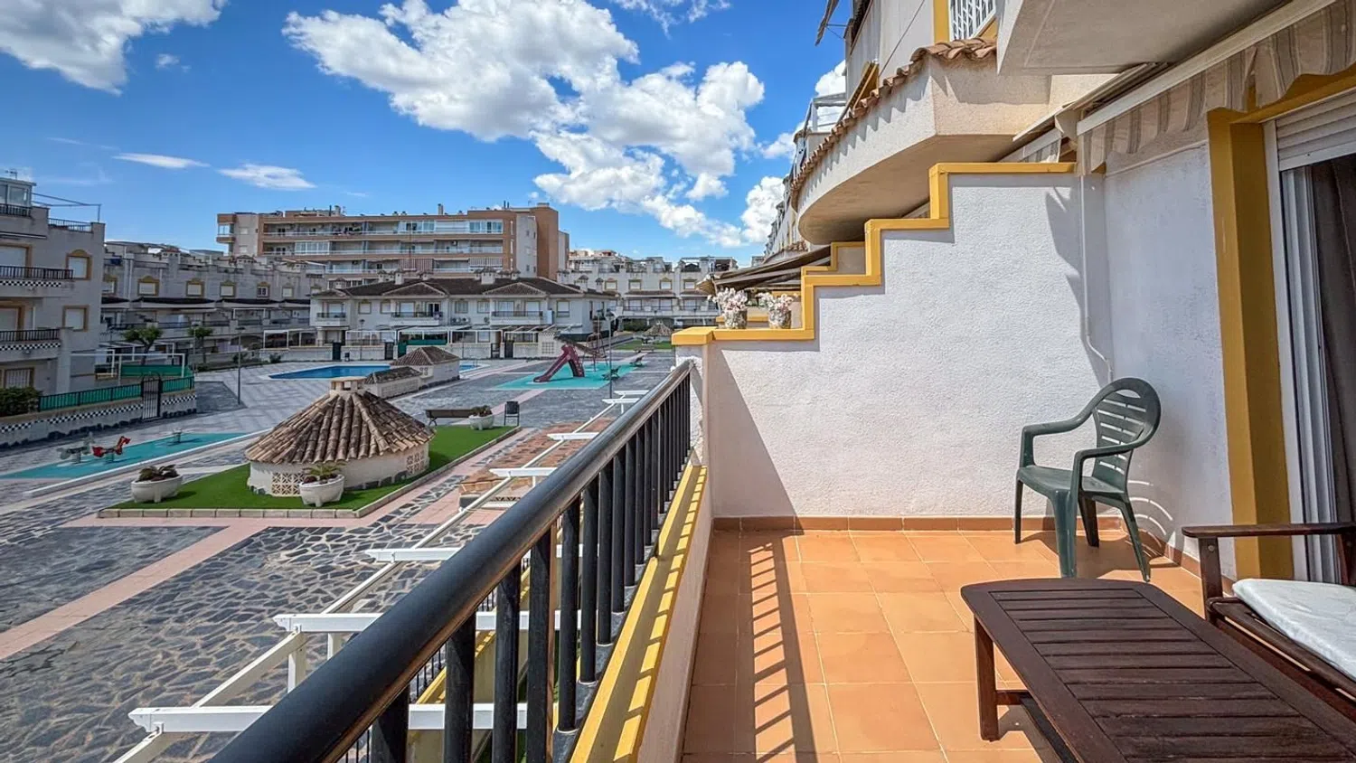 Dieser großzügige Bungalow mit 2 Schlafzimmern und 2 Badezimmern bietet weitläufige Terrassen, einen Gemeinschaftspool sowie angenehme Freizeiträume in der malerischen Umgebung von Gran Playa, nur einen kurzen Spaziergang vom Strand entfernt. Die Wohnung befindet sich im ersten Stock eines Wohnkomplexes und bietet insgesamt zwei Wohnebenen sowie eine dritte Ebene mit einem großen Solarium, das mit einem Grillbereich und Ausblick auf die Bucht ausgestattet ist.