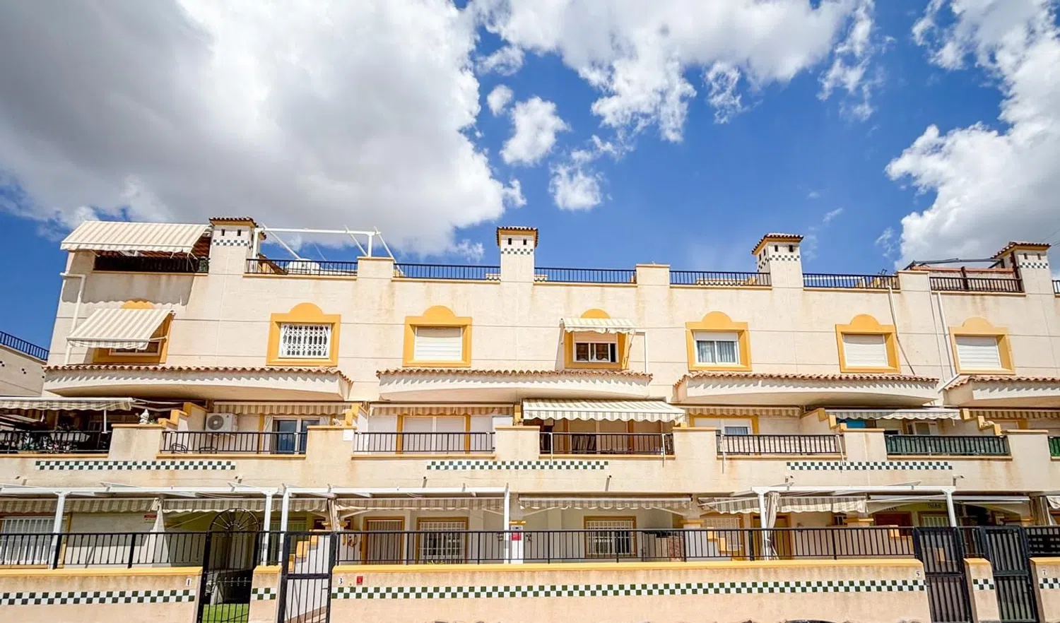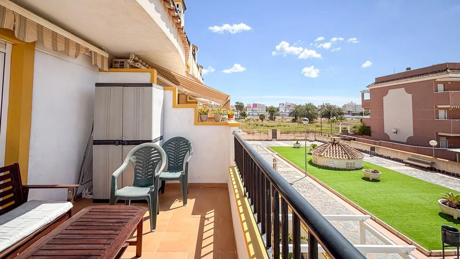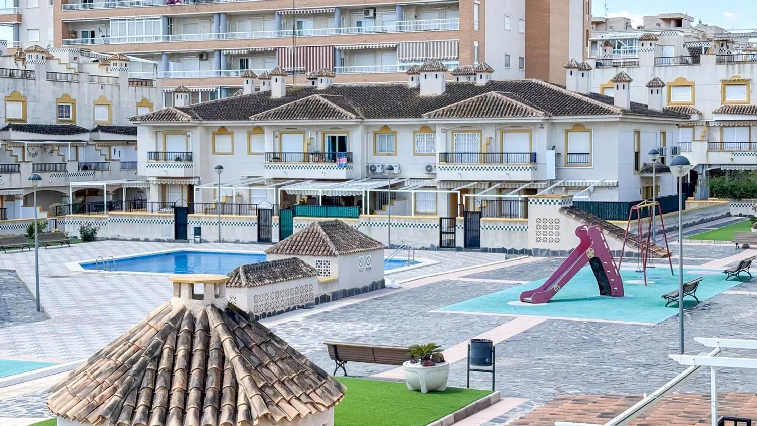 Im Obergeschoss liegt der Schlafbereich mit zwei Doppelzimmern, wobei das Hauptschlafzimmer über einen Einbauschrank verfügt. Hier befindet sich ein modernes Badezimmer, das den Schlafzimmern zur Verfügung steht. Zu den Annehmlichkeiten dieser Unterkunft zählen der Gemeinschaftspool, Spielplätze für Kinder, gepflegte Gartenanlagen sowie weitere attraktive Extras.
