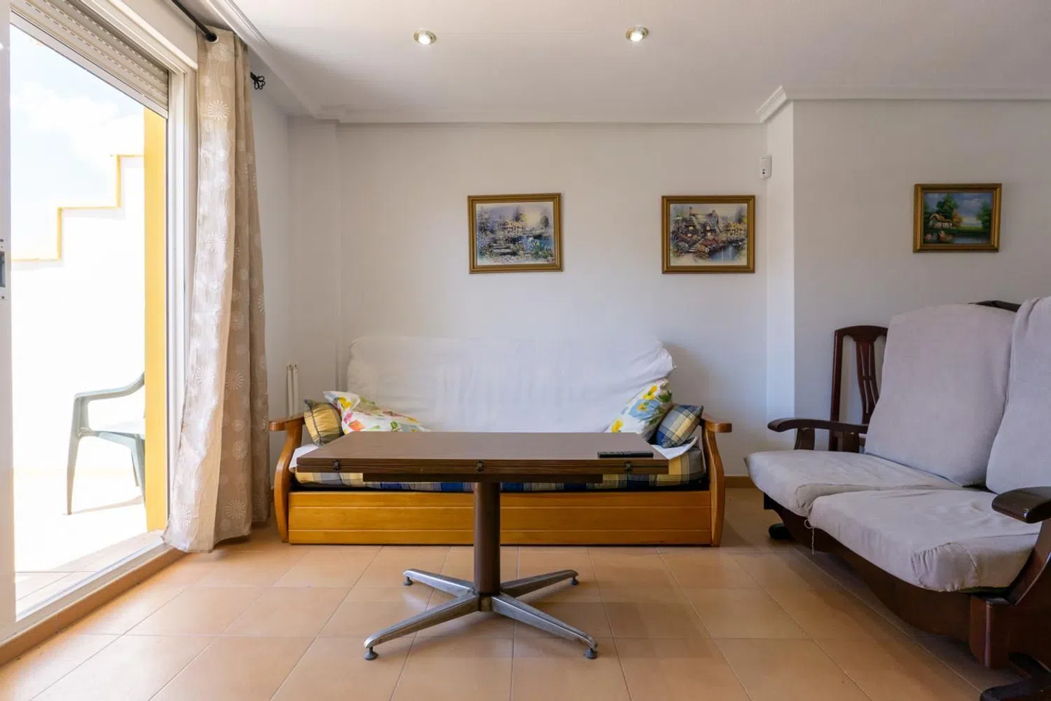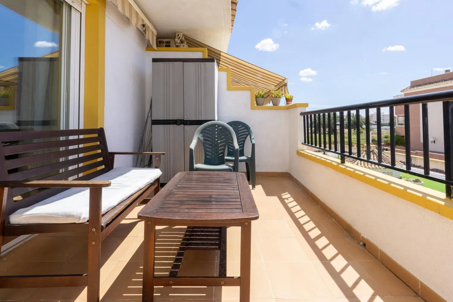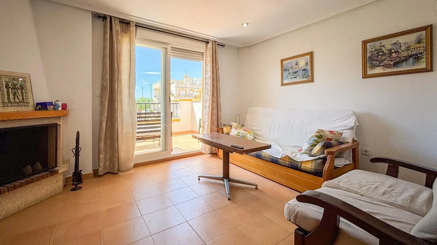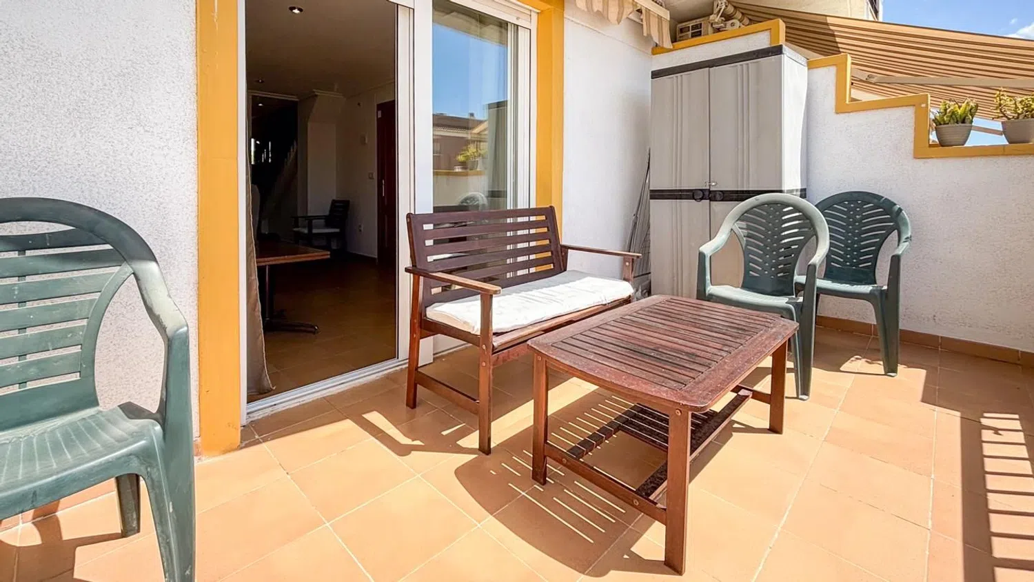 Im Obergeschoss liegt der Schlafbereich mit zwei Doppelzimmern, wobei das Hauptschlafzimmer über einen Einbauschrank verfügt. Hier befindet sich ein modernes Badezimmer, das den Schlafzimmern zur Verfügung steht. Zu den Annehmlichkeiten dieser Unterkunft zählen der Gemeinschaftspool, Spielplätze für Kinder, gepflegte Gartenanlagen sowie weitere attraktive Extras.