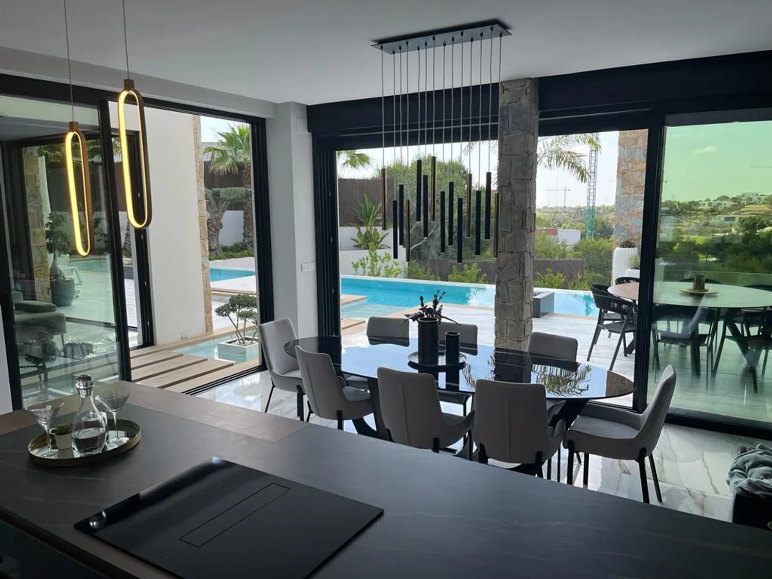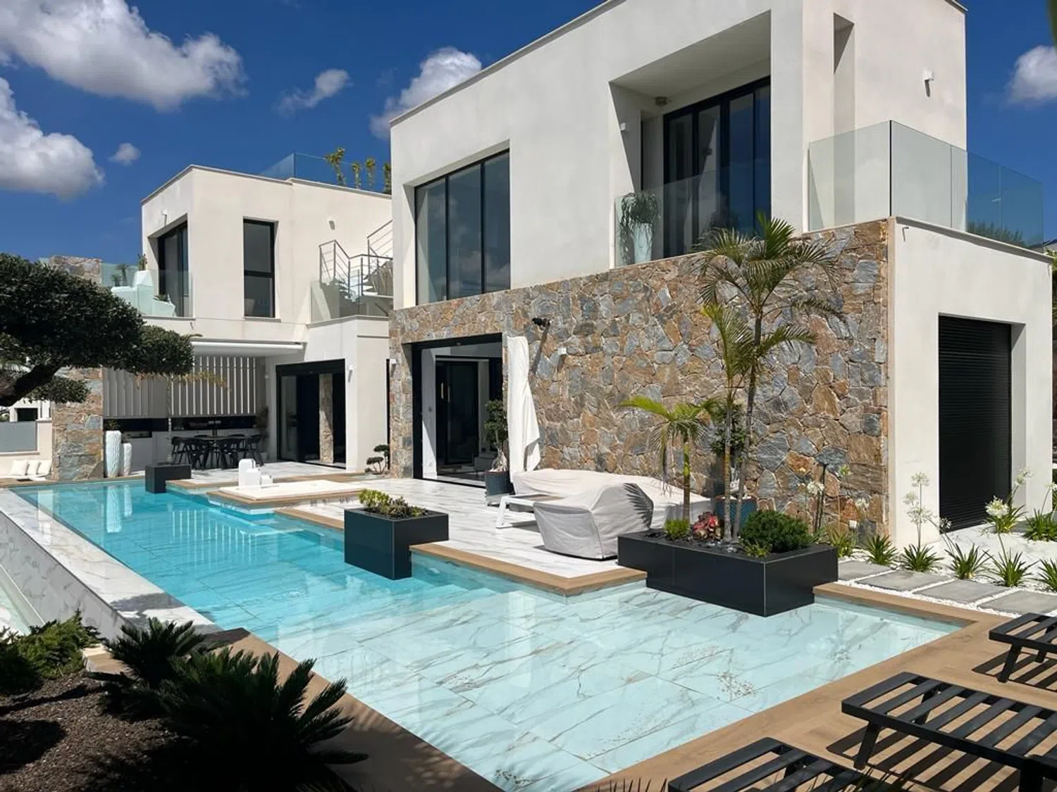 Die Villa erstreckt sich über vier Etagen und umfasst eine Vielzahl von Annehmlichkeiten. Diese beinhalten unter anderem Solarpanels, reversible Klimaanlage, einen Kamin, einen Fahrstuhl und eine großzügige Poollandschaft. Die hochwertigen Möbel sind im Preis inbegriffen, und die Küche ist mit modernster Ausstattung versehen. Die großzügige Villa bietet Platz für bis zu vier Schlafzimmer und vier Badezimmer, darunter ein Gäste-WC im Erdgeschoss.