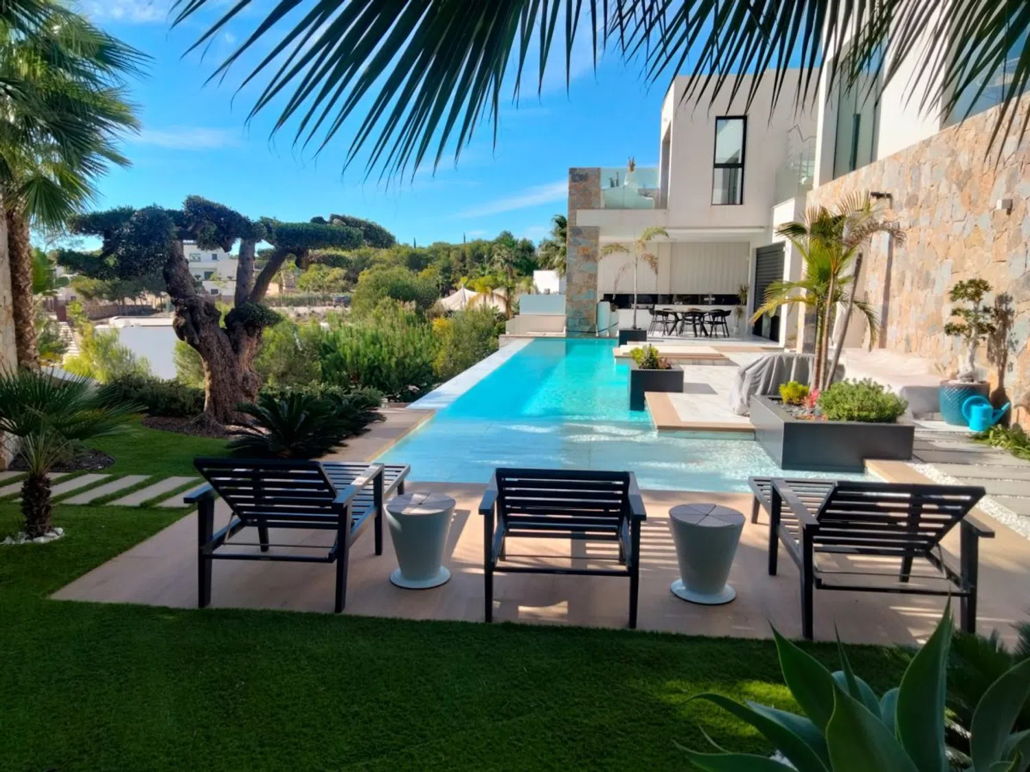 Im Außenbereich erwartet Sie ein großzügiger Garten von 400 m² mit zwei Minigolfplätzen, einer Beleuchtung rund um das Haus und einem automatischen Bewässerungssystem. Rund 100 m² Terrassenfläche bieten zahlreiche Möglichkeiten, die Sonne zu genießen, während eine Außenküche mit Fritteuse, Spüle, Grill und reichlich Stauraum ausgestattet ist. Ein entspannender Bereich mit einem Außenkamin lädt dazu ein, am ruhigen Pool von 16 m x 3 m zu verweilen. Zudem gibt es einen Sandstrand in Form eines T, der das Wohnzimmer vom Essbereich trennt und somit ein harmonisches Ambiente schafft.