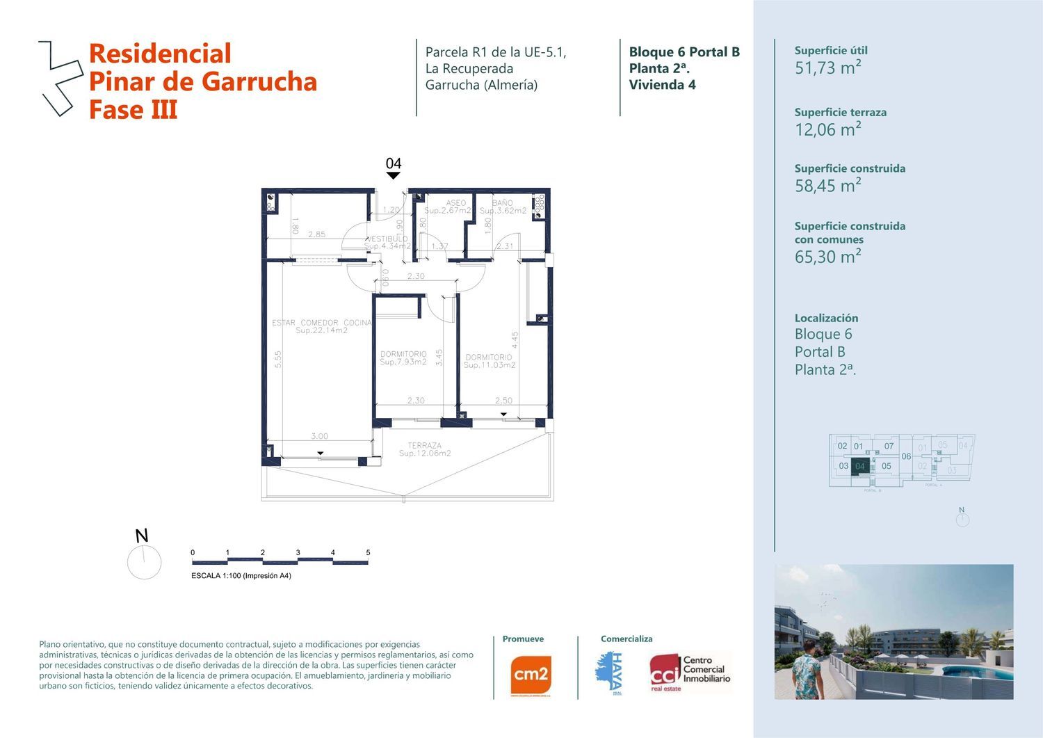 En la Costa del Levante Almeriense, amparada por recónditas calas recortadas en las Sierras Almagrera y Cabrera, se encuentran las extensas playas de fina y dorada arena, arropadas por una línea de flora única, envidia de toda la región.Con una franja marítima de 6 kilómetros, su carácter excepcional por el cuidado y limpieza con que se mantienen, y por sus aguas cristalinas del Mar Mediterráneo, ha llevado a conseguir que luzcan numerosos distintivos otorgados a las playas de máxima calidad.Comprende una amplia tipología de viviendas ubicadas en un entorno privado de zonas verdes rodeado de piscinas, zona de recreo acuática, pista de pádel, zonas de juegos infantiles. A tan solo 200 metros de pinar garrucha se encuentra el paseo marítimo, comúnmente denominado el malecón, que cuenta con kilómetro y medio de baranda de mármol y unos mimados jardines mezclados con la arena de la costa, que hacen de él una espléndida avenida sobre el mediterráneo. en él también podemos encontrar una gran variedad de comercios: restaurantes, heladerías, terrazas, tiendas, donde pasear y disfrutar del enclave y la gran vida social y turística de la zona.DotacionesLa urbanización, cerrada perimetralmente, cuenta con amplias zonas ajardinadas, piscinas comunitarias, zonas de recreo y pista de pádel.SituaciónSituado en una zona privilegiada por encontrarse junto al pueblo marinero de Garrucha (con Puerto Comercial y Deportivo), a 200 metros de la playa y Pº Marítimo, muy cerca de Mojácar Playa con sus centros de ocio familiares y nocturnos y de las maravillosas playas de Garrucha.ComunicacionesA 93 kilómetros de Almería, a unos 500 kilómetros de Madrid y a 10 minutos de las excelentes playas de Vera.