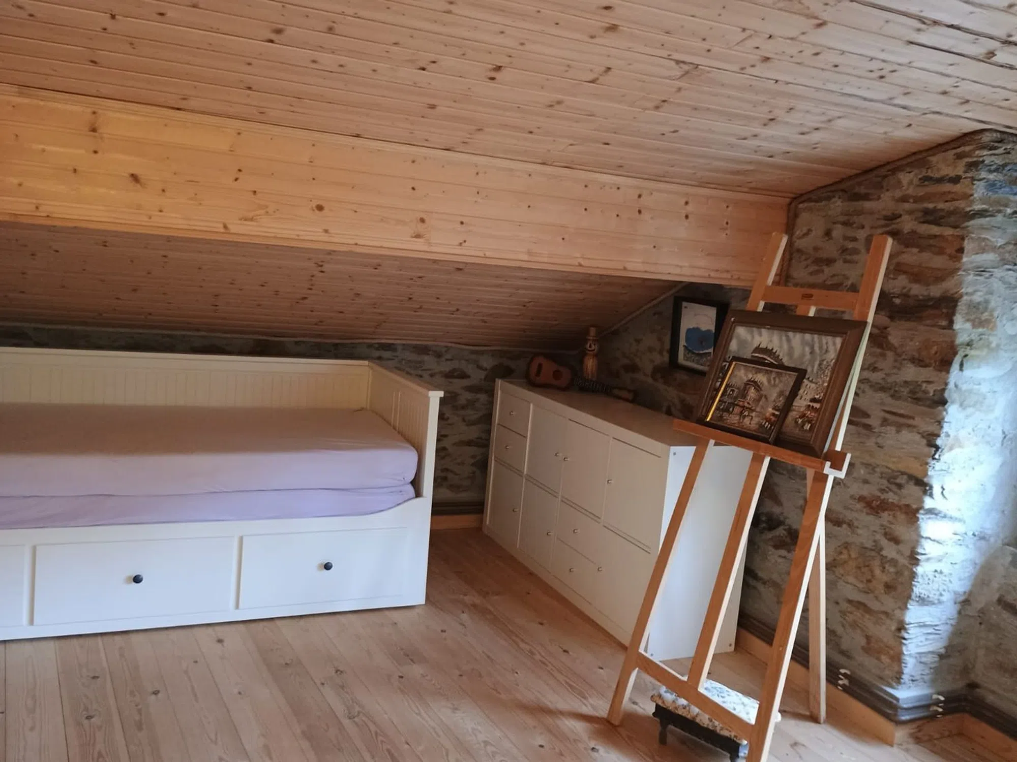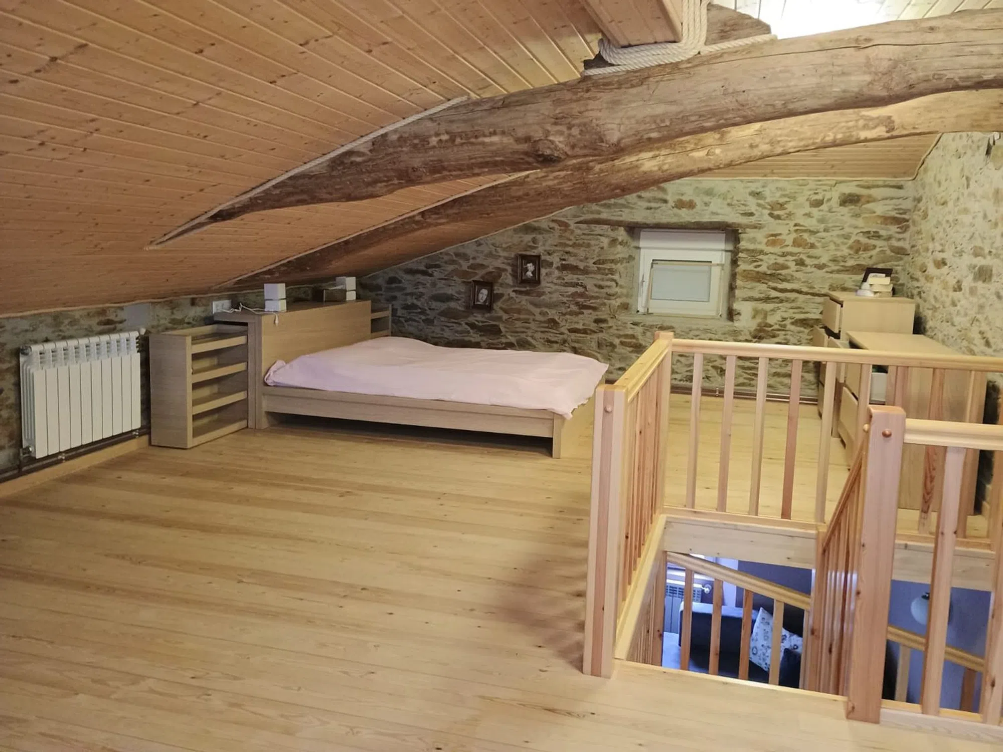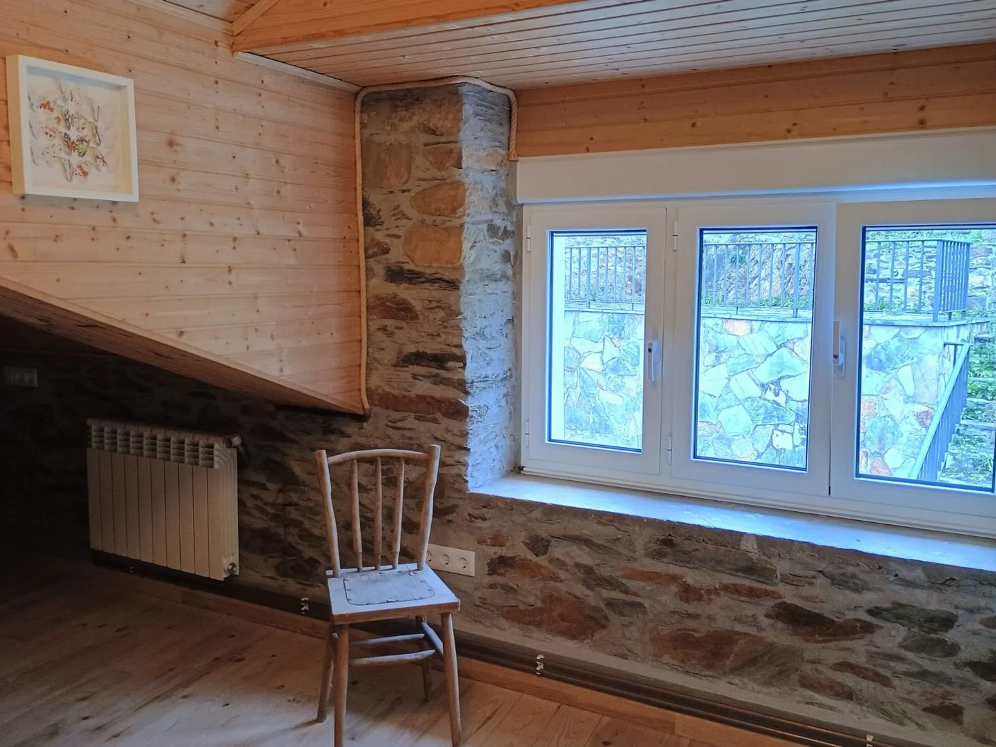 Casa Rural recién reformada con cocina de alta calidad incl. cocina, horno y lavavajillas. Nueva cocina de leña. Gran comedor integrado en la cocina. Sala de estar de planta abierta. En la planta baja hay un amplio cuarto de baño accesible para minusválidos. Un dormitorio independiente. Toda la planta baja está construida sin escalones, sin barreras para usuarios de sillas de ruedas. Planta superior La planta superior cuenta con dos amplios dormitorios. Ambas zonas están separadas por un antiguo muro de piedra de cantera. El tejado es abierto, con vigas a la vista. Todo el tejado está aislado. Sótano Un gran taller o sala de fiestas con cuarto de baño (ducha y WC). Calefacción central con quemador polivalente y caldera de 300 litros. Preparación de agua caliente eléctrica o por leña/carbón. Trastero independiente con conexión para lavadora, secadora, frigorífico, etc. Patio Patio parcialmente cubierto con acceso al sótano y escaleras a las plantas superiores. Terrazas Frente a la casa se encuentra la terraza panorámica de 3 niveles. Parcialmente pavimentada con losas de piedra nuevas y enmarcada con barandillas metálicas. Conexión de agua privada en el nivel superior. La zona superior está dividida con su propio muro de piedra de cantera (pantalla de privacidad) - salón chill-out. Amplio aparcamiento con su propia toma de agua en el acceso a las terrazas. Amplio prado con jóvenes árboles frutales sobre las terrazas. Ubicación La propiedad está situada en el tranquilo occidente de Asturias, en el pueblo de Ponticiella (Villayón). Las ciudades más cercanas son Boal (19 km) y Navia (32 km) en la costa con sus hermosas playas.
