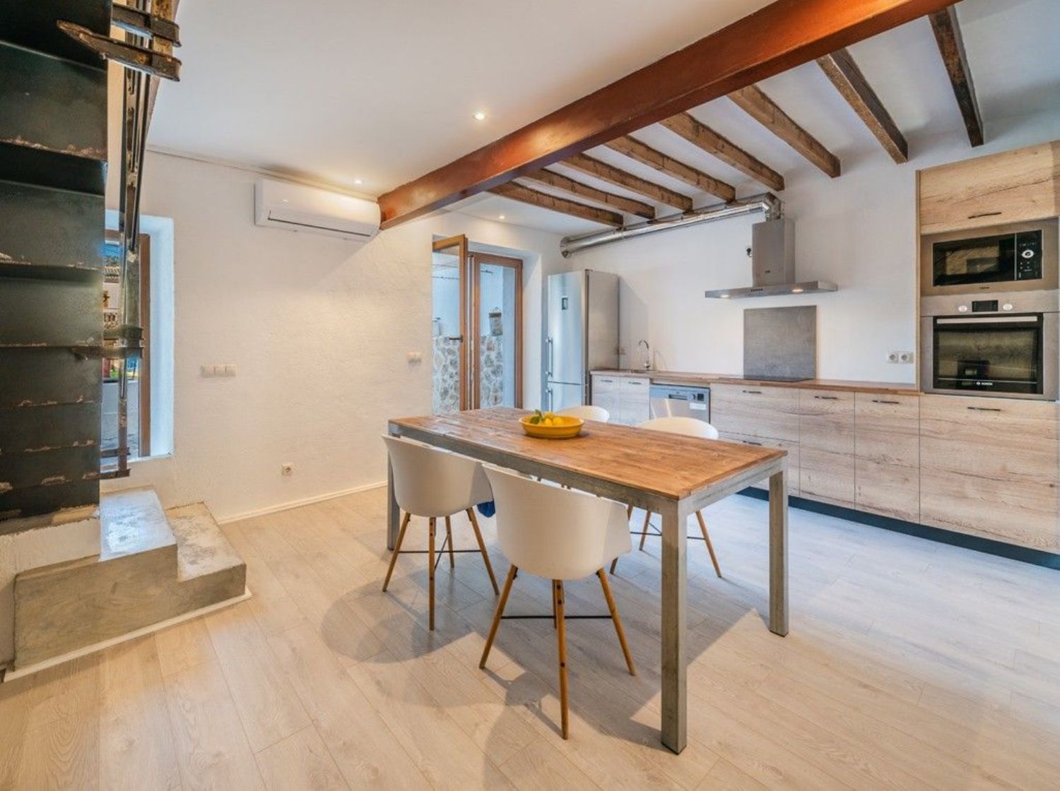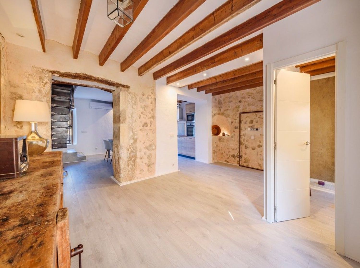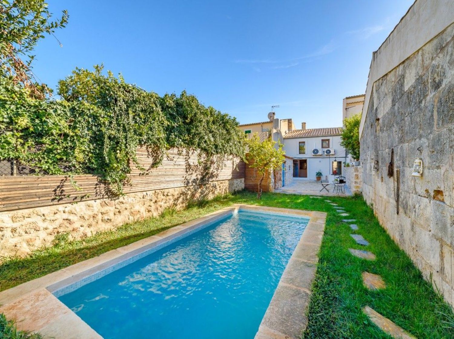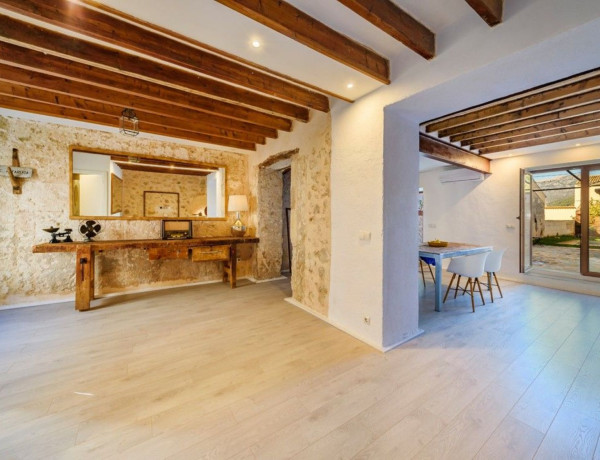 Encantadora casa adosada con precioso espacio exteriorEsta encantadora casa adosada acaba de someterse a una completa renovación y ahora brilla con todo su esplendor, lista para disfrutar de un apacible estilo de vida mediterráneo. Ubicada en una calle tranquila en las afueras del tradicional pueblo de Campanet, ofrece no solo un acceso fácil a la autopista, sino que también las playas se encuentran a solo un breve trayecto en coche. La propiedad está equipada con aire acondicionado y destaca por su atención al detalle con sus vigas de madera expuestas y la piedra mallorquina. Al entrar en este hogar, se presenta todo un espacio abierto, solo dividido por arcos antiguos, que se compone de la sala de estar, la cocina y una zona de comedor que conduce directamente al encantador y amplio patio, jardín y piscina. En esta planta baja además se encuentra un aseo de invitados con ducha. La primera planta alberga tres dormitorios y un baño familiar, todos con techos altos y suelos de parquet. El espacio exterior podría ser un verdadero Edén, de bajo y fácil mantenimiento, con una amplia terraza al sol y una piscina de inmersión de sal de 6 x 3 metros, ideal para relajarse en verano. Esta propiedad es realmente especial y perfecta para disfrutar de momentos de calidad con familiares y amigos. Ya sea que estés buscando un nuevo hogar bajo el sol o una inversión segura, esta casa de pueblo es definitivamente digna de consideración. La propiedad incluye estacionamiento doble con acceso desde la calle trasera y conexión directa con el área de la piscina y el jardín. Un área de lavandería independiente y espacio para una cocina de verano completan la oferta. Se recomienda encarecidamente programar una visita para experimentar personalmente esta joya.Campanet es un hermoso pueblo situado en el interior pero muy bien conectado a la red de carreteras, a sólo 15 minutos de la playa, 30 minutos de Palma de Mallorca y del aeropuerto. Es un pueblo maravilloso y auténtico, que fue habitado incluso antes de la ocupación romana. Además, permanece mayoritariamente fuera de la red turística. Ahora es un pueblo residencial con alrededor de 2600 habitantes, un lugar único para experimentar la tradición y el auténtico estilo de vida mediterráneo. La nueva autopista es de fácil acceso y un servicio de autobús circula varias veces al día hasta la siguiente estación de tren en Inca. Campanet cubre todas las necesidades básicas, incluyendo un pequeño supermercado y un mercado semanal todos los martes, con productos frescos y locales. Situado entre tierra plana y montañas, es simplemente un pueblo encantador. Hay mucho que ver paseando por las estrechas calles que conducen a la gran plaza principal "Plaça Major" con su imponente iglesia barroca originada en el siglo XVIII y muchos restaurantes y bares. Campanet alberga unas cuevas impresionantes que tienen muchas formaciones rocosas naturales hermosas y lagos subterráneos. A las afueras del pueblo se encuentra la capilla de "Sant Miquel" del siglo XIII, una de las más antiguas de la isla, y en los bosques es donde las espectaculares fuentes naturales de "Ufanes" cobran vida después de las fuertes lluvias. Los precios de las propiedades aquí son relativamente asequibles, lo que significa que usted obtiene más por su dinero y las propiedades son igual de encantadoras. Encontrará bonitas casas de pueblo y casas de campo en venta y en alquiler.