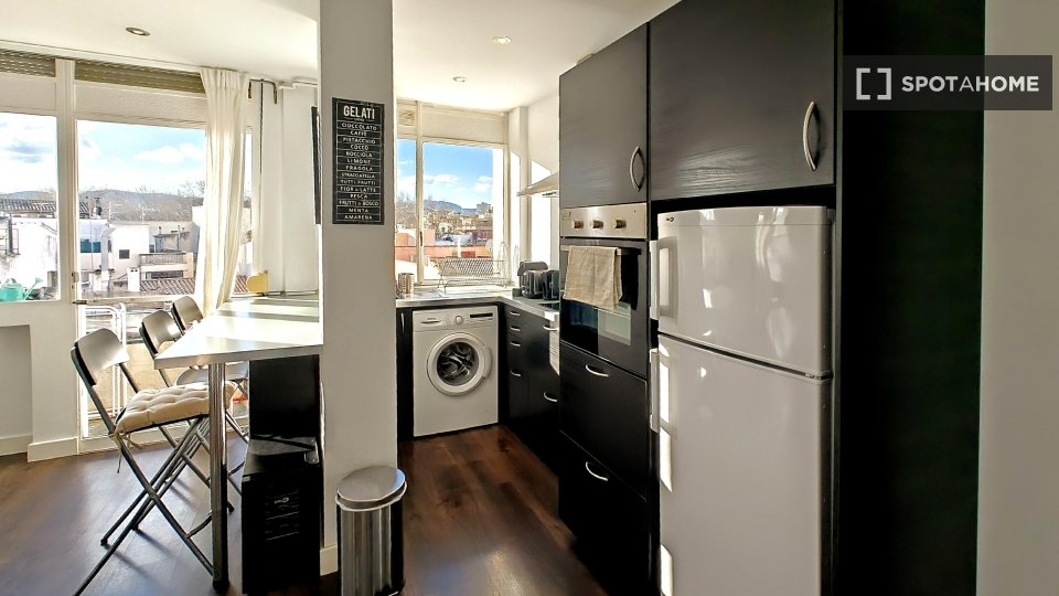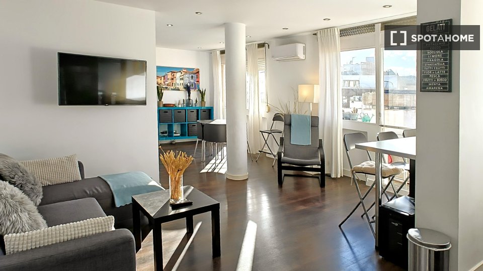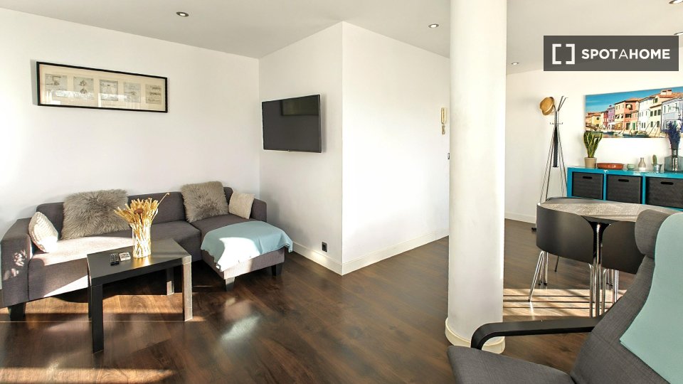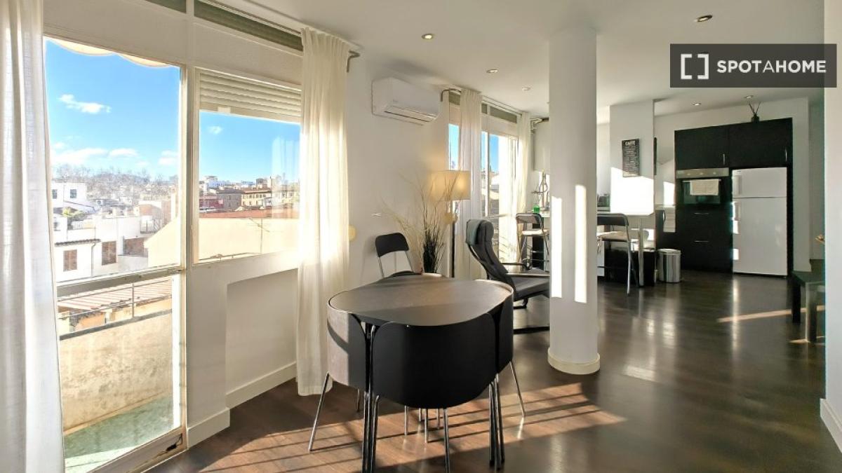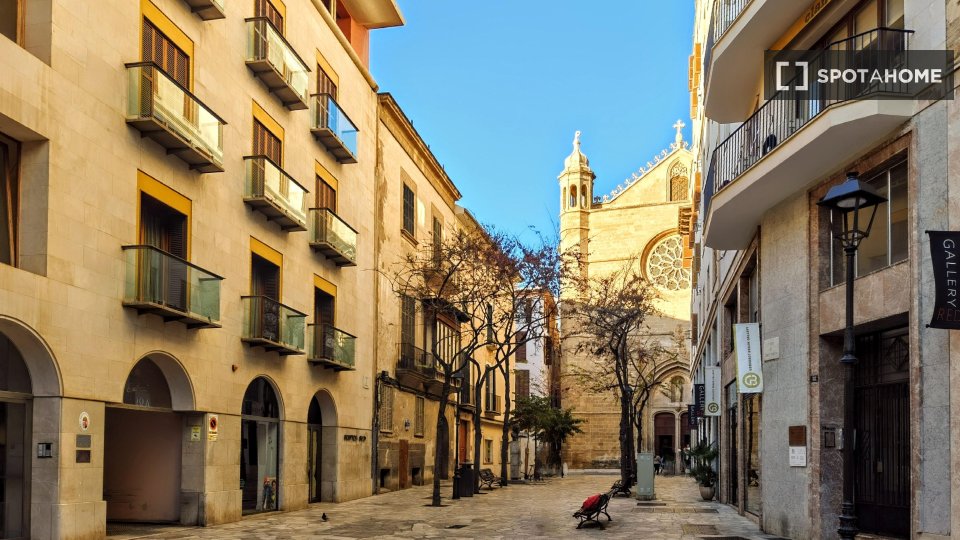Suchen Sie eine stilvolle Mietwohnung in Palma? Dieses komplett möblierte Apartment mit 2 Schlafzimmern befindet sich im pulsierenden Viertel Sant Nicolau. Die Unterkunft bietet Klimaanlage, Heizung und einen Balkon oder eine Terrasse, um das sonnige Wetter zu genießen. Die ausgestattete Küche verfügt über einen Backofen, und es stehen gemeinschaftliche Waschmöglichkeiten zur Verfügung. Paare und Berufstätige sind willkommen. Alle Nebenkosten (Strom, Wasser, Gas und WLAN) sind im Preis inbegriffen. Geprüft von Spotahome! Sant Nicolau ist eine erstklassige Lage mit Attraktionen wie La Caja Blanca, dem Pelaires Centre Cultural Contemporani und Wind Pirates, die fußläufig erreichbar sind. Auch der Paseo des Born und der Arco de l'Almudaina befinden sich in der Nähe – ideal, um das reiche kulturelle Erbe zu erkunden und lokale Restaurants und Unterhaltung zu genießen.