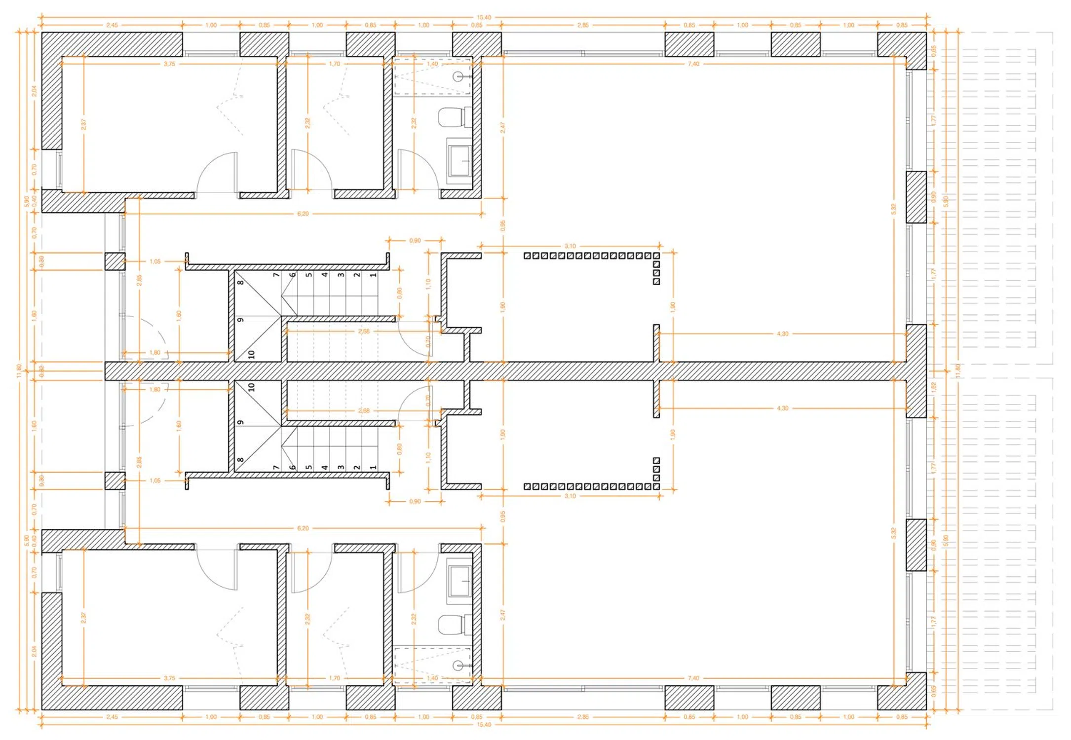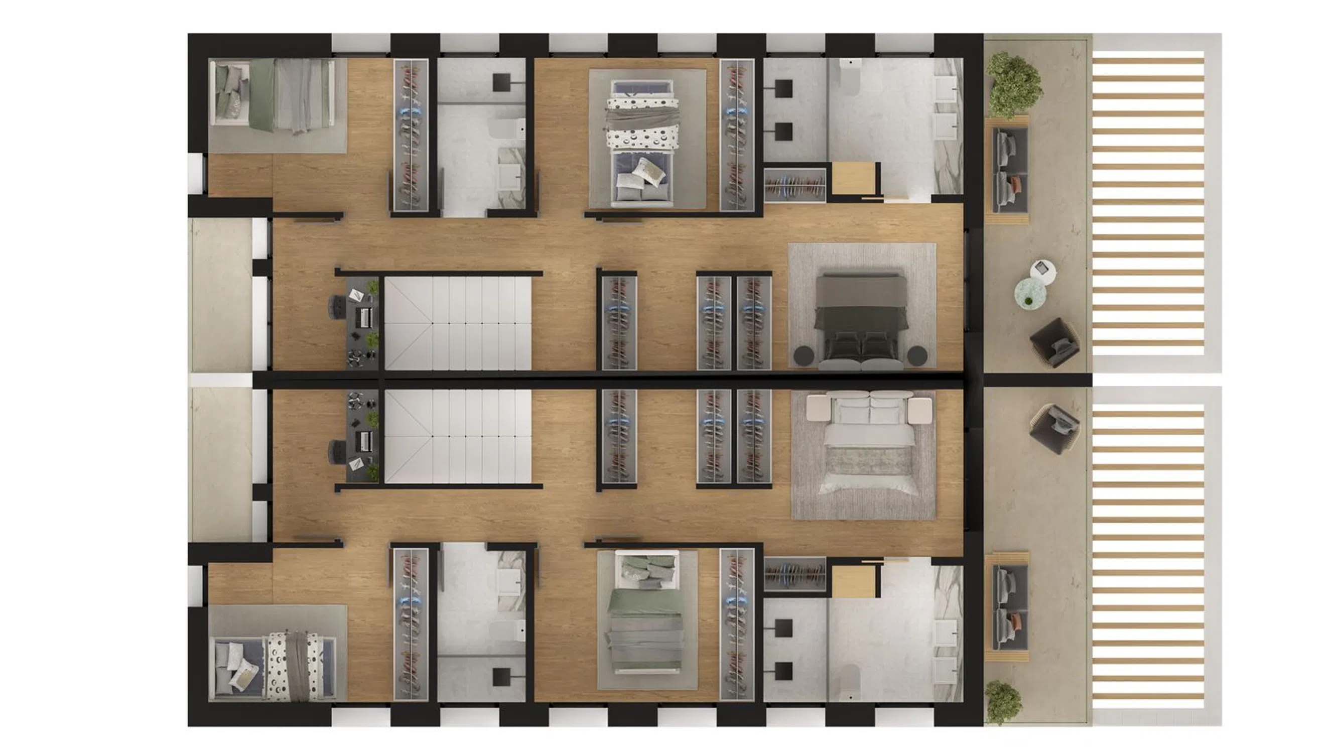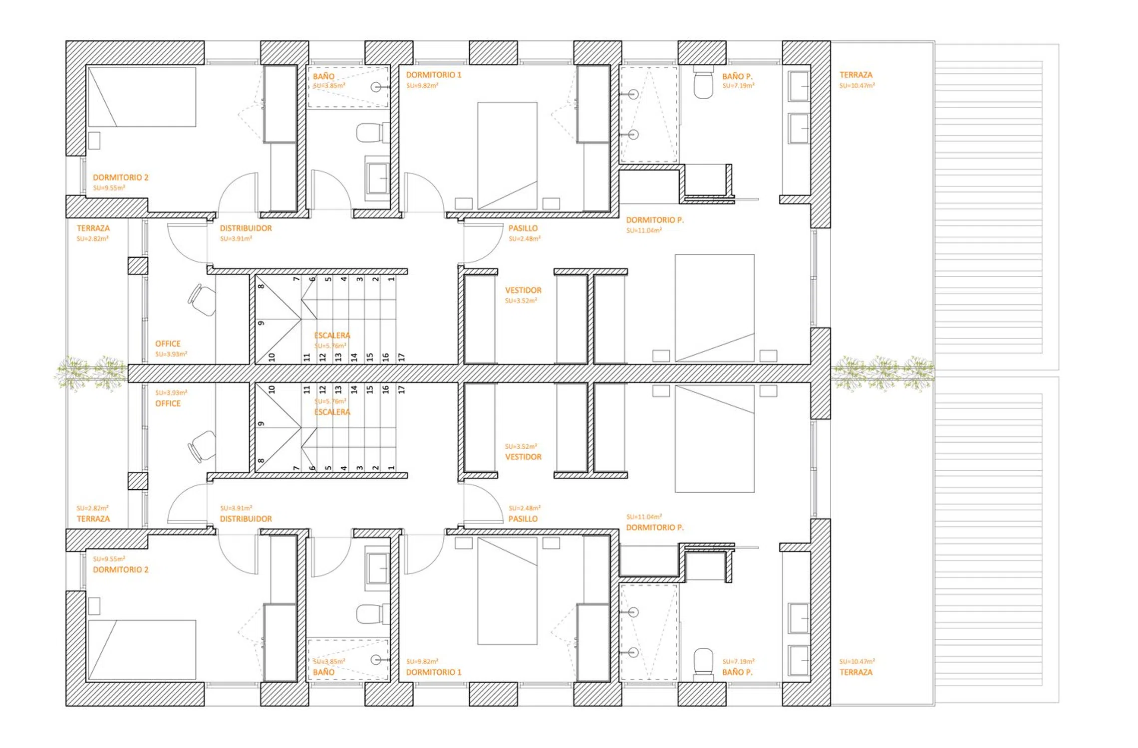 Tenemos en esta segunda planta dos dormitorios más, con armarios empotrados y un baño compartido. Y una oficina o sala de juegos con terraza completan la segunda planta.