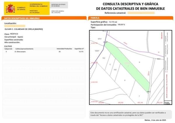 Parcela rústica con 100 olivos y pozo en Colmenar de Oreja – 13.173 m² según catastro Se vende estupenda parcela rústica de 12.250 m² (según nota simple) y 13.173 m² (según catastro), situada en Colmenar de Oreja, a solo 10 minutos de Aranjuez y a 45 km de Madrid. La finca dispone de un pozo propio dentro de la parcela, ideal para riego o uso agrícola. Entorno natural, tranquilo y de fácil acceso, perfecto tanto para uso agrícola como para disfrutar del aire libre y la desconexión. Una excelente oportunidad para inversión, cultivo o recreo. [IW].