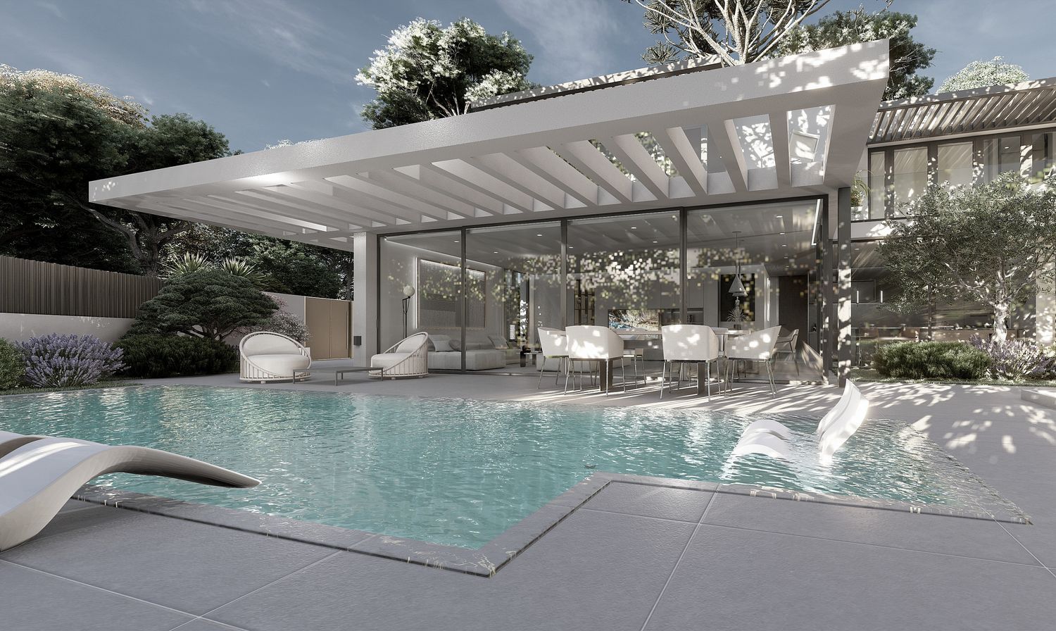 Die Villa verfügt über einen in Keramik beendeten Pool mit eingelassener Treppe und einem Salzelektrolyse-System zur Wasseraufbereitung, sowie einen vollständig angelegten Garten. Die Küche ist mit Ober- und Unterschränken sowie einer großformatigen Arbeitsfläche ausgestattet, die der Kunde in einem ausgewählten Geschäft wählen kann.