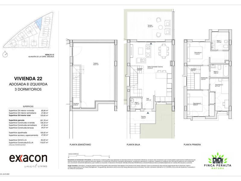 Exxacon Smart Living präsentiert die Finca Peralta Natura. Diese Phase ist Teil der bereits bestehenden städtischen Siedlung Finca Peralta in Alhaurin de la Torre. Die Siedlung besteht aus insgesamt 22 Häusern in einer Reihe, die sich auf 2 Etagen und ein Halbgeschoss verteilen, mit Parkplatz, Veranda und Terrasse mit direktem Zugang zu den gemeinschaftlichen Bereichen. Freuen Sie sich auf offene, sonnendurchflutete Räume in Ihrem neuen Zuhause. Das Viertel bietet eine ruhige Atmosphäre in einem Tal, umgeben von den Landschaften der Region Guadalhorse. Die Finca Peralta Natura ist 20 Minuten von der Hauptstadt Málaga und nur 15 Minuten vom internationalen Flughafen der Costa del Sol entfernt und sowohl mit öffentlichen als auch privaten Verkehrsmitteln gut angebunden. Die Ruhe der Natur ist nur ein paar Schritte entfernt. Die Reihenhäuser sind auf 3 Schlafzimmer, 2 Bäder und 1 Toilette verteilt. Die Innenausstattung umfasst ein Hauptschlafzimmer mit eigenem Bad, eine möblierte und integrierte Küche, um keinen Moment zu verpassen, um mit Freunden und Familie zu verbringen. Der Halbkeller der Häuser ist etwas Besonderes, denn dank seiner Geräumigkeit können Sie den perfekten Raum nach Ihren Wünschen gestalten. Momente der Entspannung und des Vergnügens für alle, gestalten Sie ihn nach Ihren Wünschen. Alle Häuser verfügen über einen eigenen Parkplatz. Die Finca Peralta Natura bietet vielseitige Räume, die alle lichtdurchflutet sind und in denen Funktionalität an erster Stelle steht. Weil wir wissen, was Ihnen wichtig ist, und weil wir Ihnen einen Ort bieten wollen, an dem Sie sich wohlfühlen.... wählen Sie die Finca Peralta Natura, Ihre beste Wahl, um sie Ihr Zuhause zu nennen. Nur Sie warten auf Sie! Das Ziel dieses Projekts ist es, seinen Besitzern ein Gefühl von Frieden, Ruhe, Gesundheit und Glück zu vermitteln. Fühlen Sie sich sicher in Ihrem neuen Zuhause.