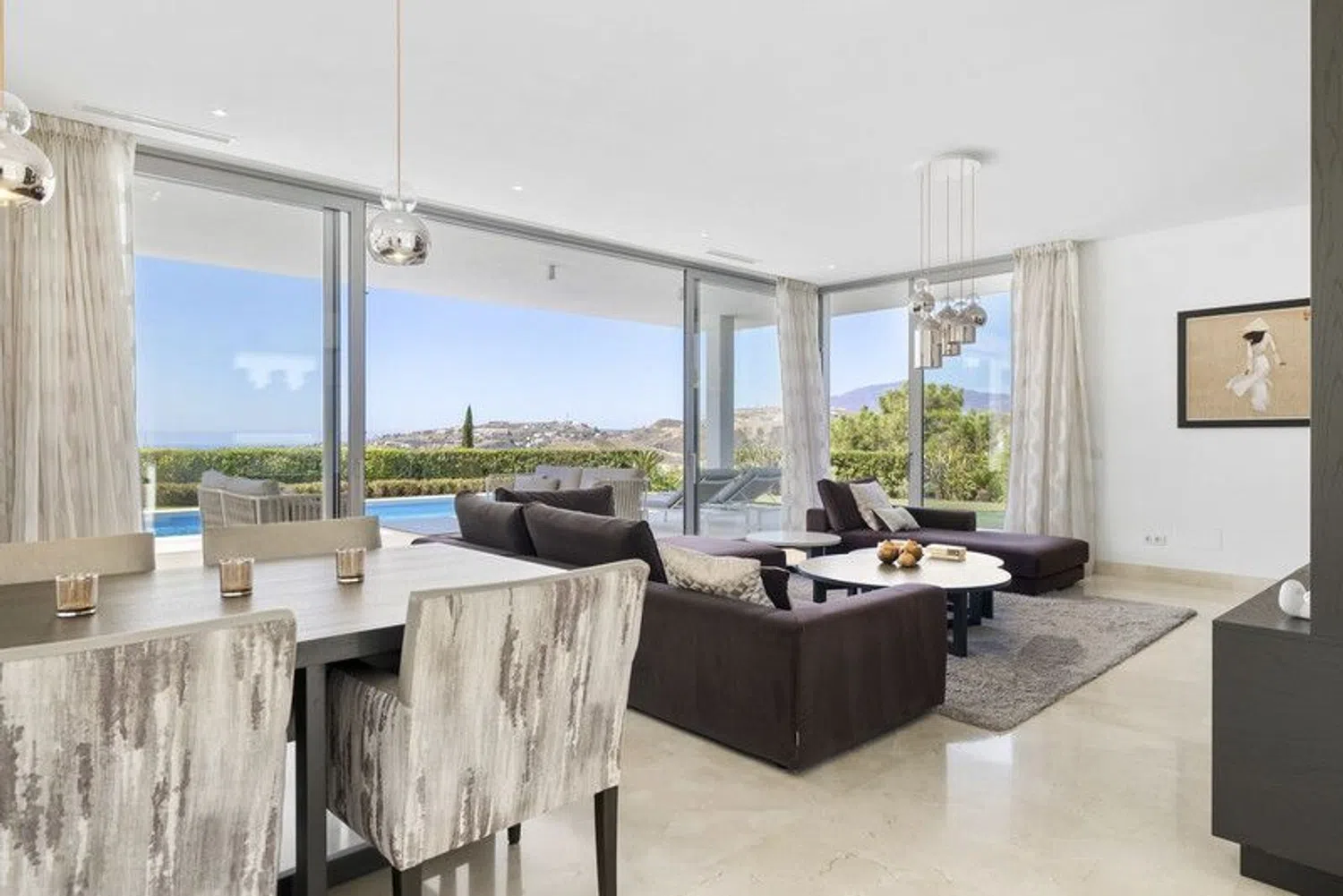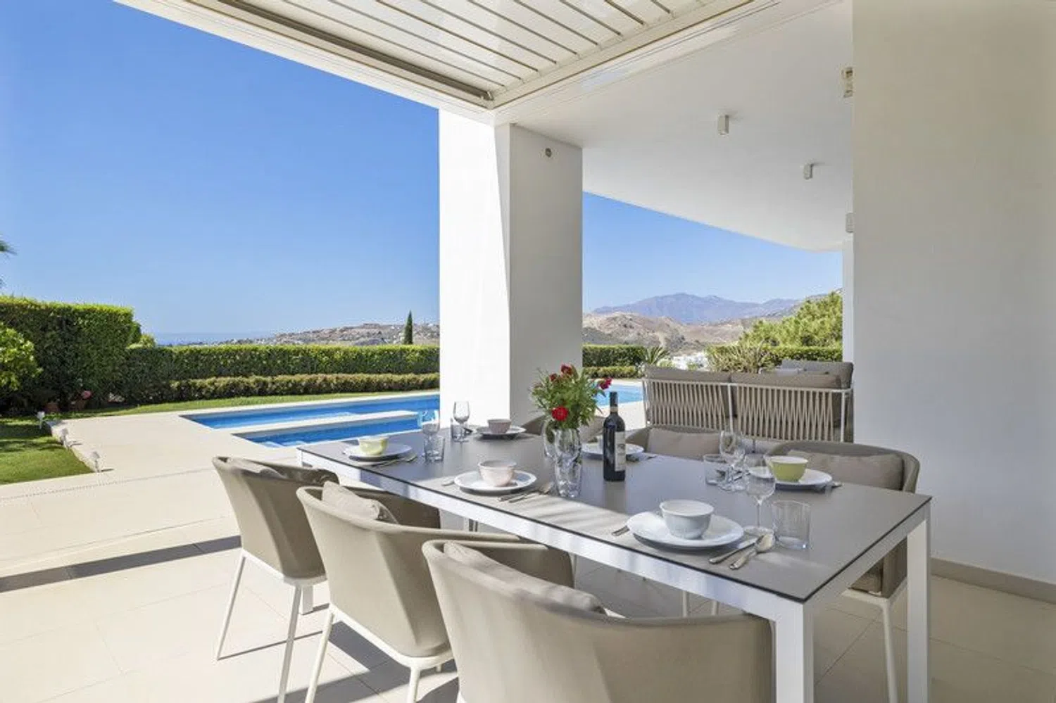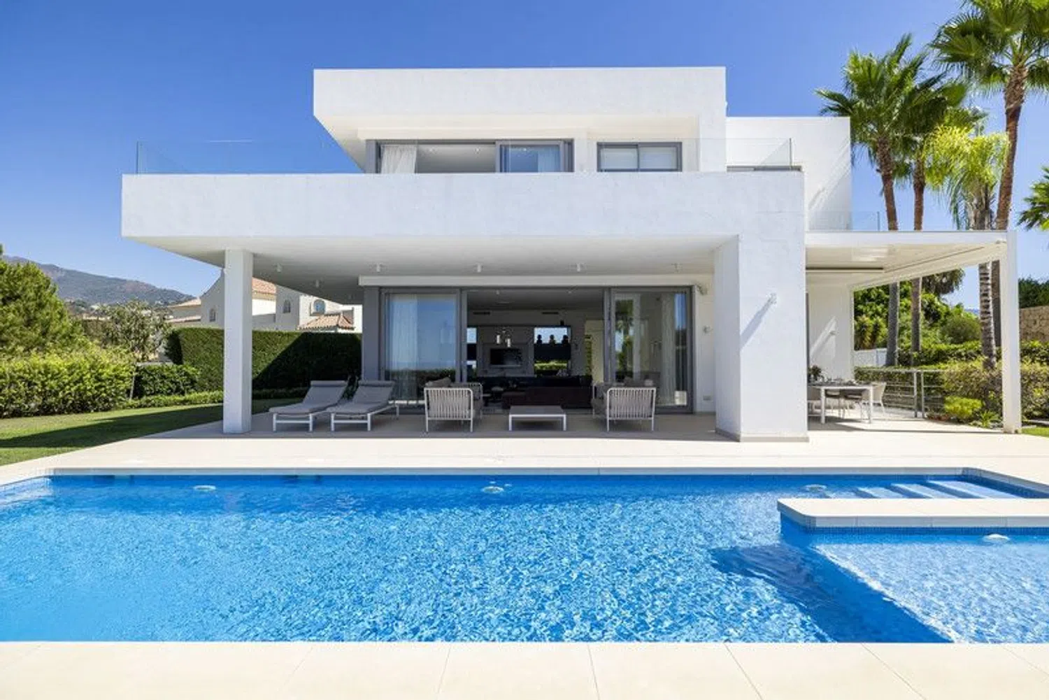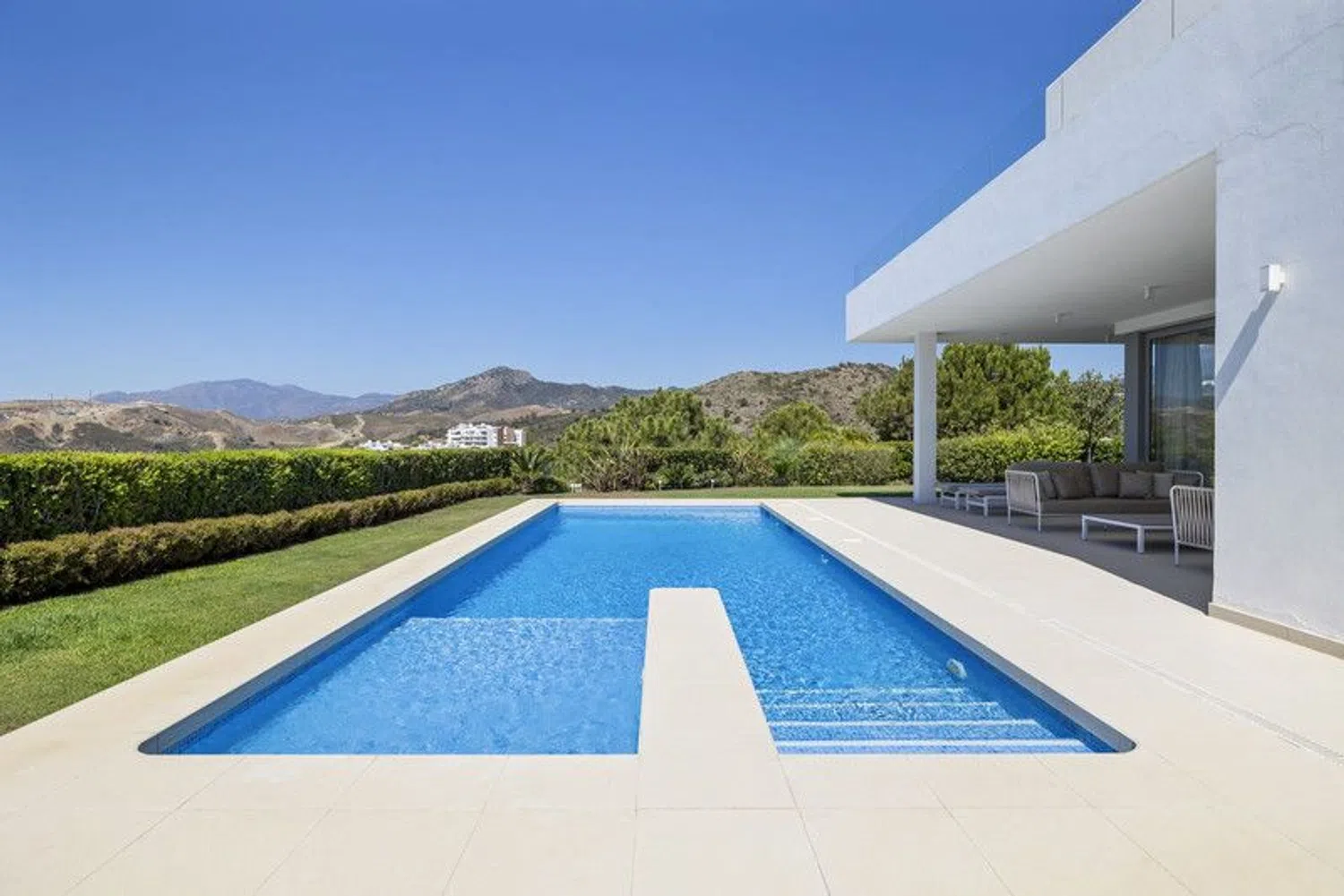 Discover this stunning contemporary 4-bedroom villa located in the tranquil and highly sought-after gated community of Puerto de Capitan, Benahavis. Nestled on the outskirts of Guadalmina Alta and San Pedro, this serene location is just a 5-minute drive from local amenities, international schools, and the toll road, with the vibrant Puerto Banus only 10 minutes away. Situated on a spacious 1,073 m² south-east facing plot, the villa boasts breathtaking panoramic views of the sea and mountains, offering an unmatched sense of luxury and privacy. Property Highlights: Built Area: 354 m² across 3 levels Parking: Ample space for 2+ vehicles with an electric gated entrance Layout: Ground Floor: Step into a bright and airy space with double-height ceilings and expansive feature windows, flooding the home with natural light. This level features an open-plan living, dining, and kitchen area equipped with top-of-the-line appliances and a breakfast bar. Sliding doors open onto a covered terrace with dining and seating areas, complete with automatic shutters and a retractable roof for year-round use. Also on this floor are a cloakroom, a guest bathroom, and a spacious en-suite bedroom with direct garden access. First Floor: The luxurious master suite includes a fully fitted walk-in dressing area and a lavish bathroom with a separate bath and shower. It opens onto a large private terrace with spectacular sea and mountain views. Two additional en-suite bedrooms with fitted wardrobes share the same panoramic outlook. Basement Level: Accessible via a separate entrance, the basement offers a utility and machine room, along with a vast flexible space ideal for a games room, spa, or any purpose you envision. Outdoor Features: The meticulously landscaped garden complements a sparkling saltwater swimming pool and a convenient storage shed. Additional Amenities: Underfloor heating in the master bathroom Solar panels for energy efficiency Water filtration system Security alarm system Automatic irrigation for the garden This exquisite villa has been elegantly furnished by Blackshaw, with all luxury furnishings and decor included in the sale. Seize the opportunity to own a dream home in one of Benahavis's most desirable locations. Contact us today for more information or to arrange a private viewing!