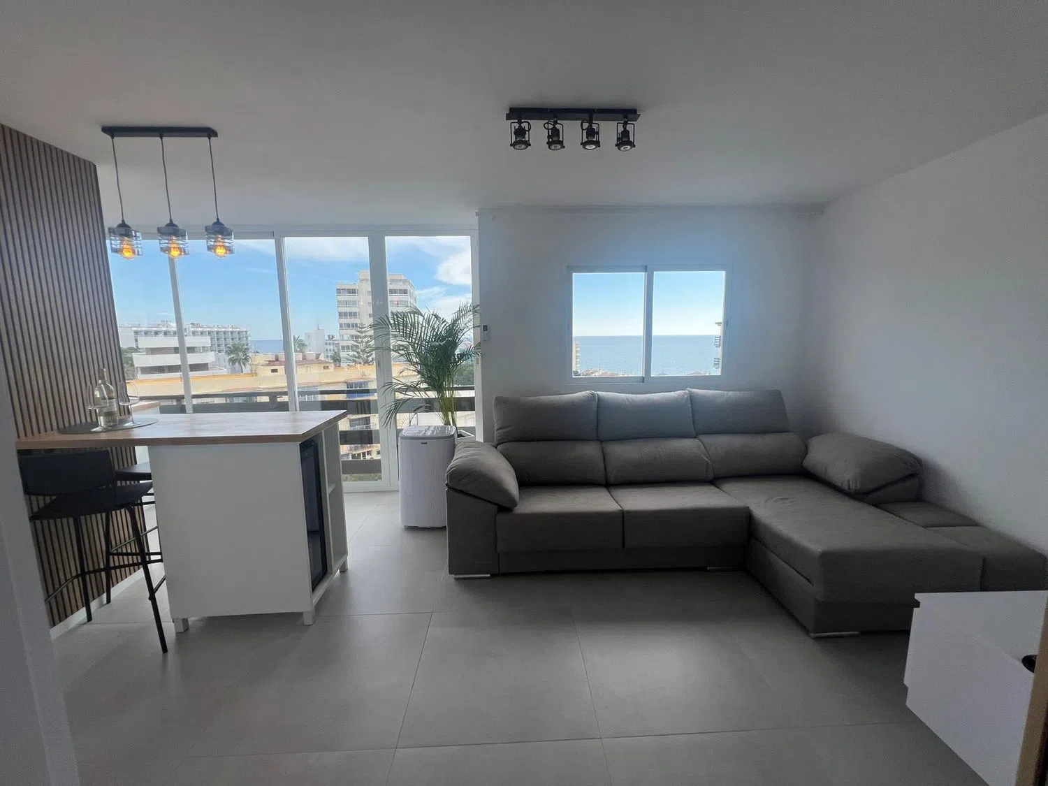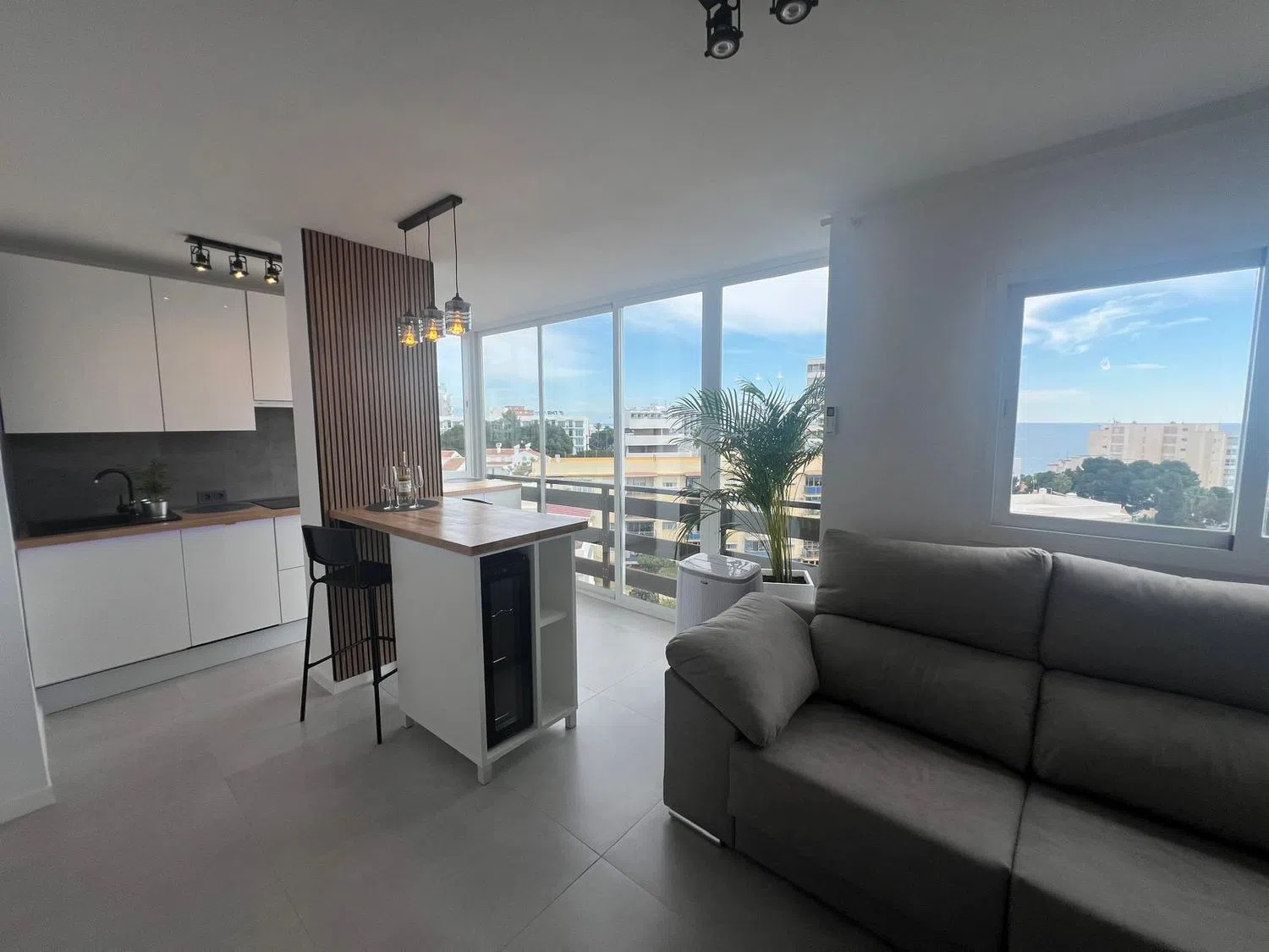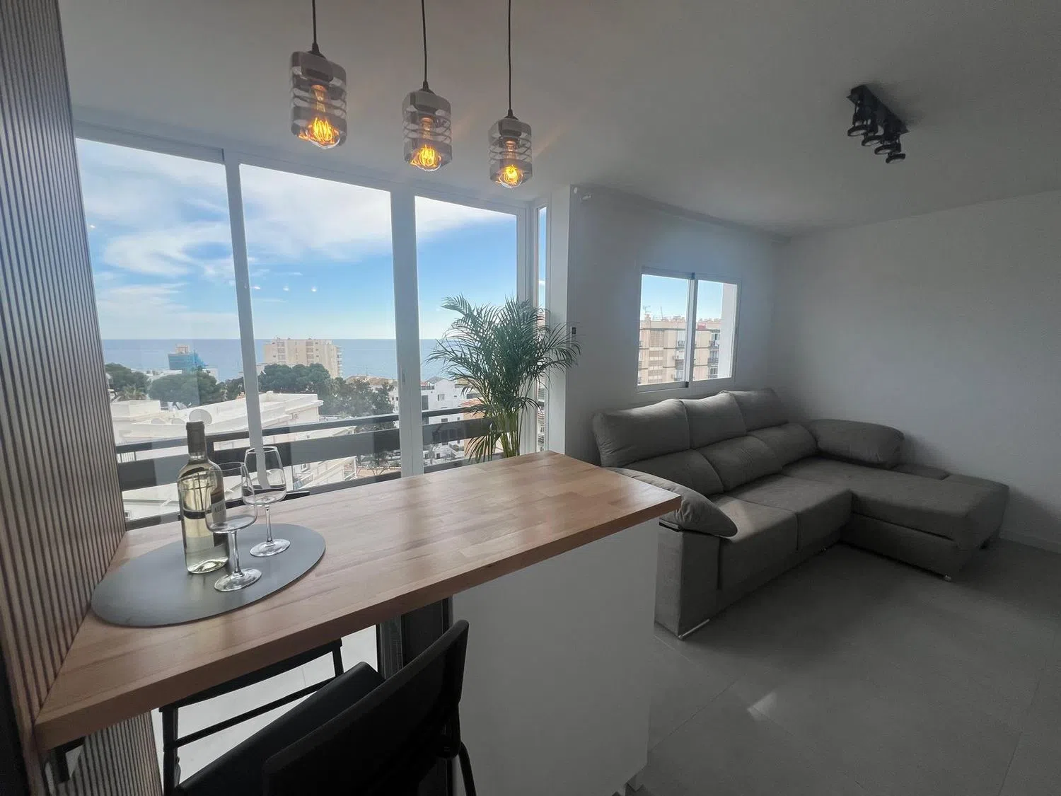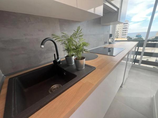 Precioso apartamento con espectaculares vistas al mar. A 280 metros de la playa junto al Parque de la Paloma y 1,4km a la estacion de tren Arroyo de la Miel, el cual esta conectado directamente con el aeropuerto y el centro de Malaga. Apartamento completamente reformado al más alto nivel y totalmente amueblado con todas las comodidades y servicios. Piso sin uso desde su renovacion. Listo para entrar a vivir o alquilar, cuenta con licencia turistica. Tuberias y instalacion electrica renovada. equipado con: vinoteca, nevera, placa de inducción, lavavajillas, lavadora, aire acondicionado (frio/calor), cocina moderna lacada con encimera de roble de madera auténtica, sofá cama de cuero, TV, 2x armario empotrado con puertas correderas, nuevas ventanas panorámicas, todas las puertas nuevas. Urbanización con 3 piscinas, jardín, restaurante y parking comunitario. Edificio con varios ascensores. A pocos pasos de todos los servicios necesarios y tiendas. Esta disponible para verlo en cualqier momento.