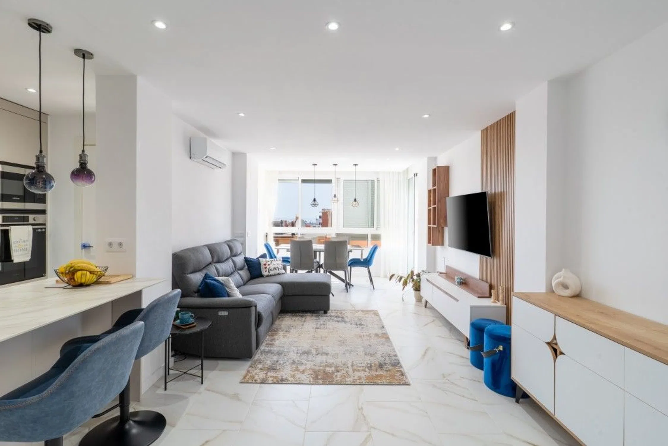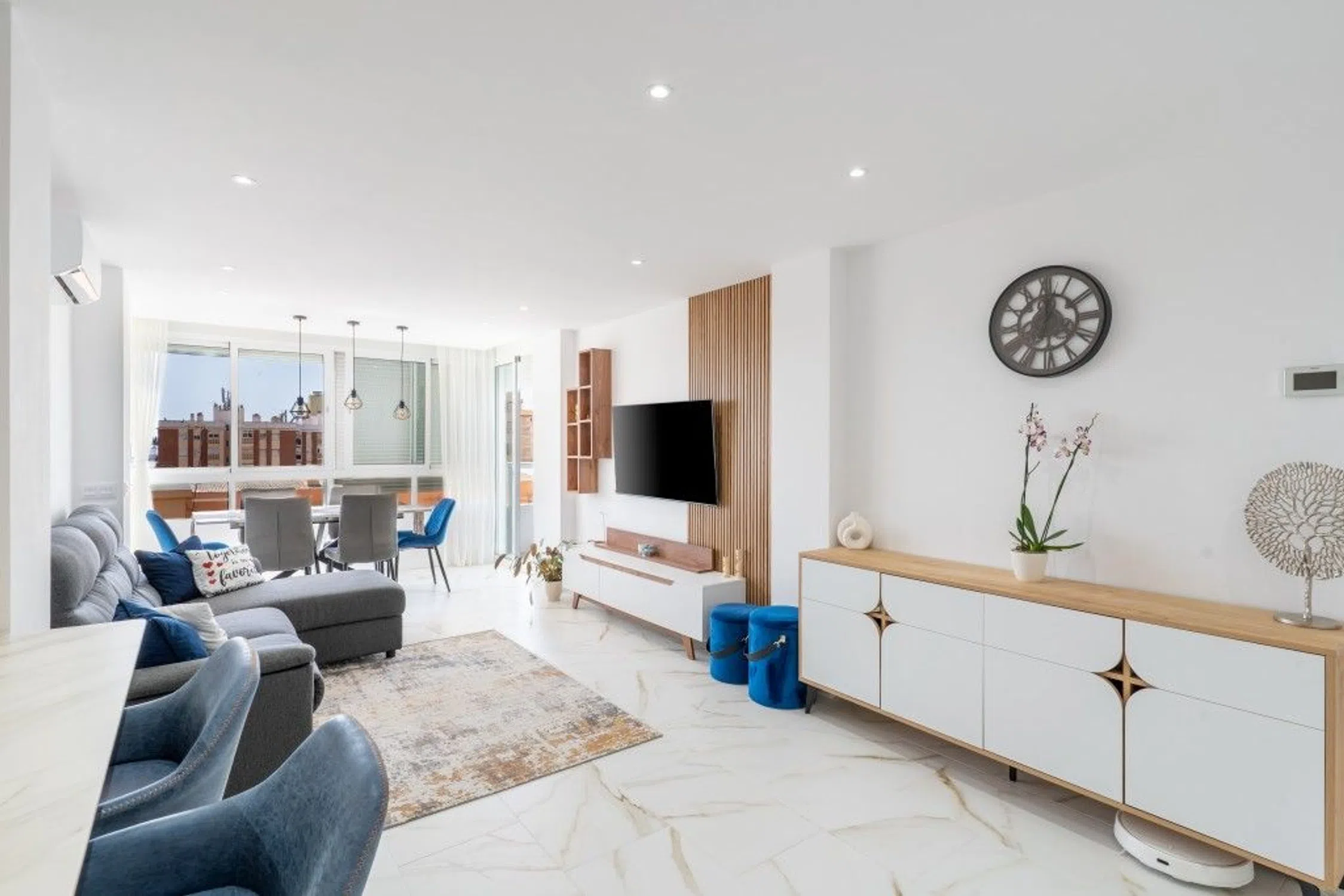 Bienvenido a este impresionante y totalmente renovado apartamento de 3 dormitorios y 2 baños situado en el corazón de Fuengirola, en la codiciada Calle Rodrigo de Triana 7. Esta elegante casa se encuentra dentro de una comunidad residencial bien mantenida que ofrece una piscina, jardines maduros y aparcamiento privado - una rara combinación en una ubicación tan céntrica y accesible a pie. El apartamento ha sido cuidadosamente renovado con los más altos estándares, con un hermoso suelo de cerámica de mármol mate que aporta un acabado limpio y sofisticado a toda la casa. La cocina abierta es un verdadero punto culminante, equipado con encimeras de piedra Dexton premium y electrodomésticos Samsung de gama alta, todos totalmente conectados a través del sistema Samsung Smart Home para el control sin esfuerzo, comodidad y eficiencia energética. Con su orientación sur y oeste, la propiedad disfruta de una excelente luz natural durante todo el día. Los tres dormitorios dan al exterior, mientras que la sala de estar y los dormitorios ofrecen vistas abiertas y sin obstáculos del horizonte de la ciudad de Fuengirola, dando a la casa una sensación espaciosa y elevada. Desde el salón también se puede disfrutar de vistas parciales al mar, añadiendo un toque costero al panorama urbano. Una terraza privada orientada al suroeste proporciona un espacio chill-out perfecto para relajarse o entretenerse, bañado por el sol de la tarde. El apartamento se vende completamente amueblado con piezas de diseño de alta calidad, como nuevas, creando un hogar moderno, llave en mano, ideal para su disfrute inmediato. Cada detalle ha sido cuidadosamente seleccionado para proporcionar un equilibrio entre comodidad, funcionalidad y estilo contemporáneo. La ubicación es inmejorable, a sólo 500 metros de la playa y del animado Paseo Marítimo. En las inmediaciones encontrará restaurantes de primera categoría como Sala Thai, Casa Colón y La Galería, así como acogedoras cafeterías, panaderías artesanales, supermercados, farmacias y tiendas boutique. Los mercados locales, cines, lugares culturales e instalaciones deportivas también están a poca distancia, ofreciendo un estilo de vida dinámico y conveniente durante todo el año. Combinando lujo moderno, tecnología inteligente, diseño y una ubicación céntrica, esta propiedad es una oportunidad única para disfrutar de lo mejor de la vida en Fuengirola.