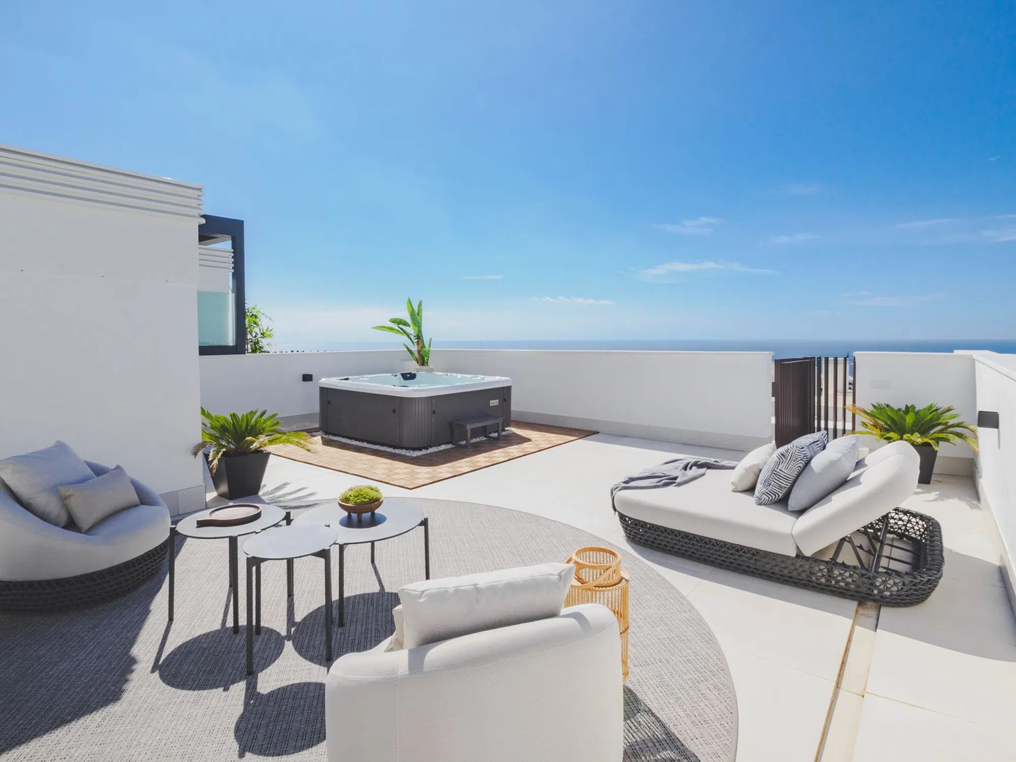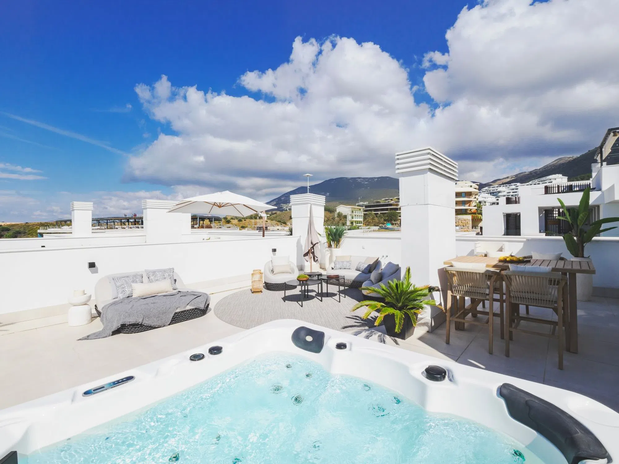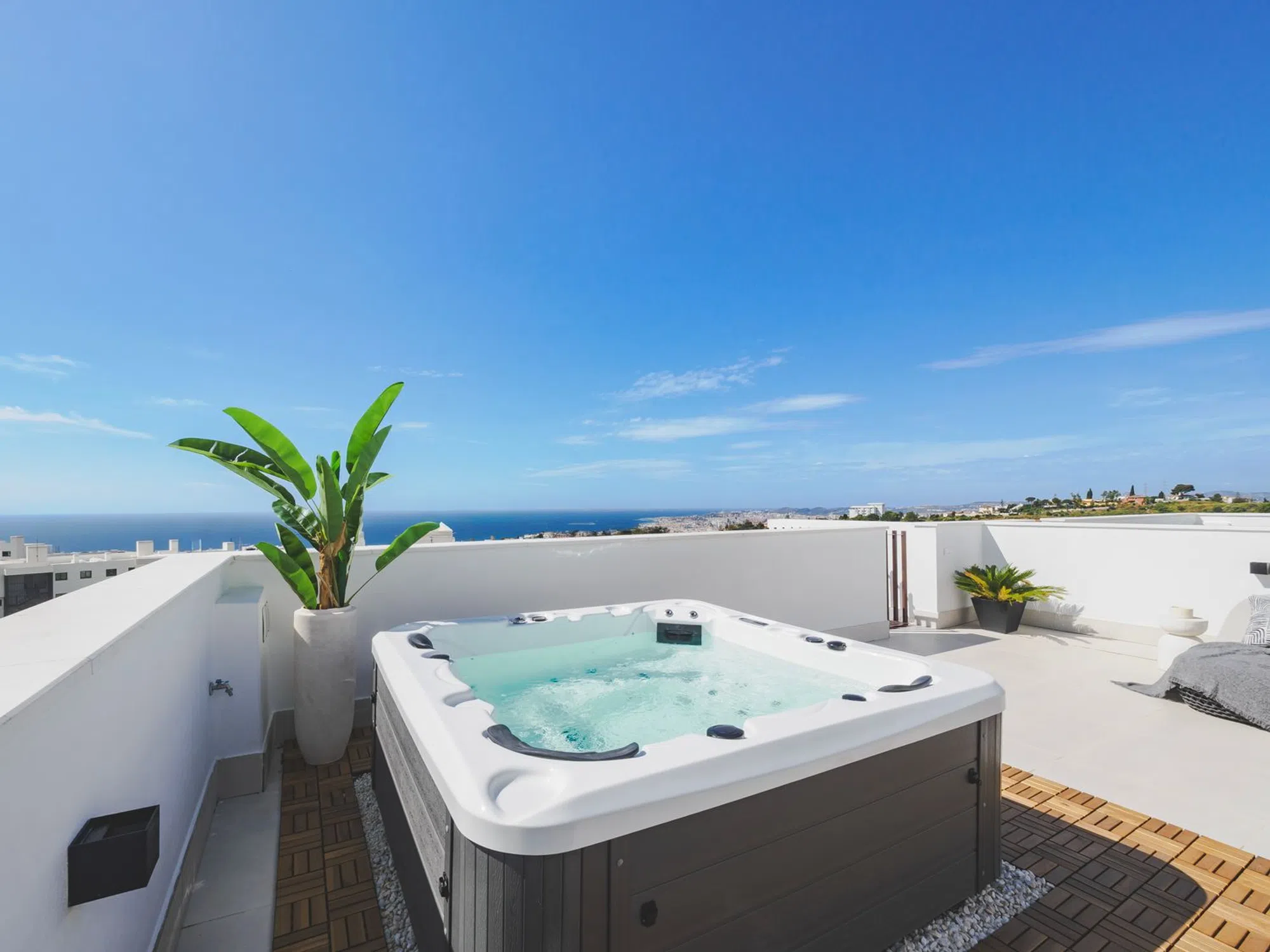 Se vende espectacular ático a estrenar situado en una de las mejores zonas de Fuengirola - El Higuerón. La vivienda se enmarca en un exclusivo complejo residencial de tan sólo 36 viviendas. Dentro de los servicios que ofrecen las zonas comunes, cabe destacar piscina “Infinity” de agua salada, gimnasio, coworking y sauna. La propiedad se entrega totalmente amueblada con piezas de diseño de alta gama y un proyecto integral de interiorismo realizado por Ikonia Ilusion&Arte, que combina mobiliario seleccionado, iluminación y tonos contemporáneos para maximizar la sensación de confort y amplitud. La cocina completamente equipada con electrodomésticos de alta calidad y concepto abierto al salón. Desde el salón-comedor tenemos acceso a la terraza principal de 27m2, y desde esta terraza accedemos a la planta de solárium, donde disponemos de una barbacoa y un jacuzzi para 4 personas y se puede disfrutar de espectaculares vistas panorámicas hacia el mar y la montaña. De vuelta al interior nos encontramos los dos espaciosos dormitorios con el principal con baño "en suite" y un segundo baño de invitados. La vivienda incluye dos plazas de aparcamiento y un trastero. La urbanización tiene todos los servicios: Restaurantes, Spa, gimnasio, piscinas y zonas deportivas exteriores. Esta perfectamente conectada, cerca de la Autovía AP 7 y de la playa; a 15 minutos del Aeropuerto, a 25 minutos de Málaga Centro y a 30 minutos de Marbella. En la urbanización hay una estación de tren, que conecta con el centro de Fuengirola, Málaga-Centro y el Aeropuerto de Málaga. El comprador está libre de honorarios de agencia. No están incluidos en el precio los gastos derivados del proceso de compraventa, tales como notaría, registro o los impuestos correspondientes a la transmisión.