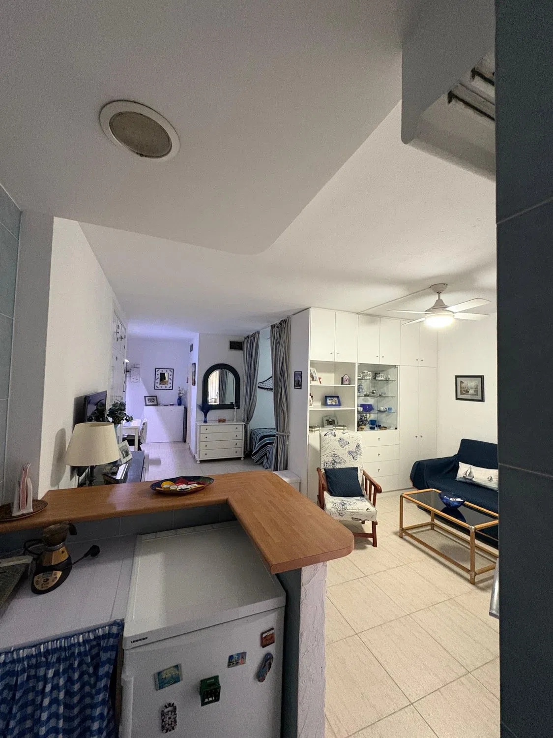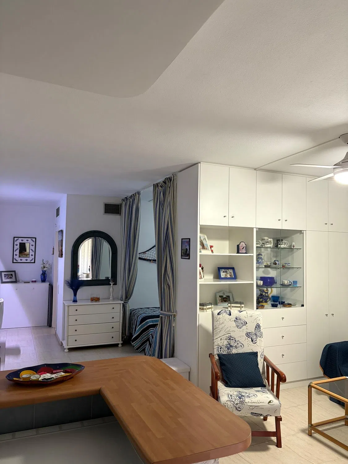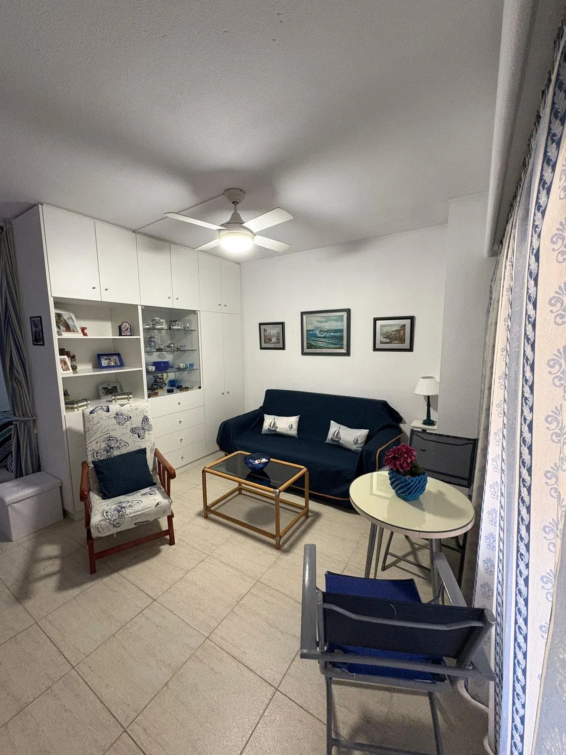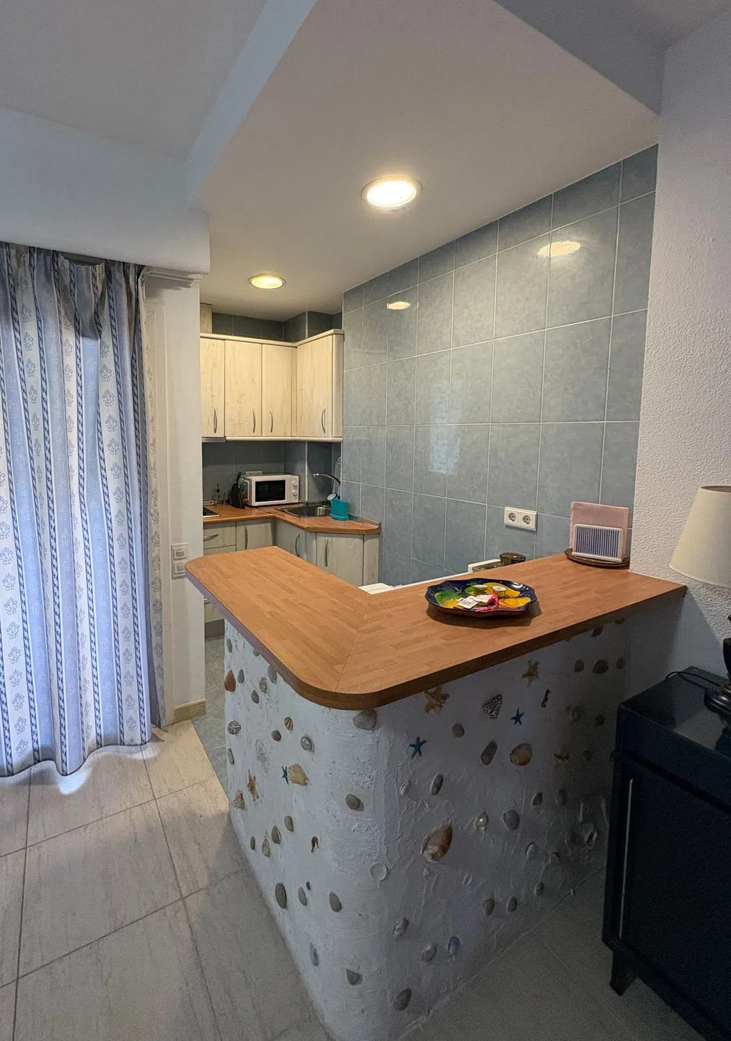 Estudio en primera línea de playa con vistas al mar, situado en el complejo hotelero PYR, frente al Puerto Deportivo, en pleno centro de Fuengirola. Estudio luminoso mas grande al estar en esquina, que cuenta con zona de dormitorio, sala de estar con sofá cama, armario empotrado y armario separador de estancias realizado a medida por carpintero con menos de 5 años de antigüedad, y cocina americana con barra de diseño. La terraza tiene vistas al mar y esta acristalada con cortinas de cristal de la prestigiosa marca Lumon (valorado en mas de 12.000 euros). Se vende totalmente amueblado. Posibilidad de comprar plaza de garaje en el mismo hotel con acceso en ascensor directo. El complejo hotelero ofrece bar/cafetería, bar de piscina en los meses de verano, solarium, piscina exterior para adultos y niños, hamacas/sombrillas, proporcionando todo lo necesario para disfrutar del clima.