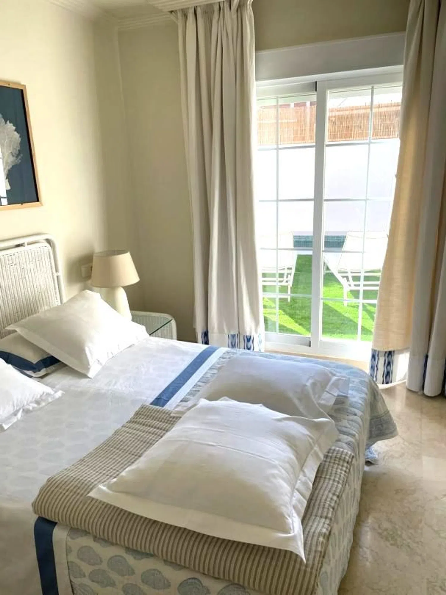 Precioso bajo con jardín y piscina privada en urbanización cuidada en segunda linea de playa. Se trata de un bajo reformado que cuenta con 3 dormitorios, 3 baños, precioso salón con acceso a un porche, jardín y a la piscina y cocina independiente totalmente equipada. 150m2 de jardín. Plaza de garaje y trastero. A 10 minutos de Marbella centro y a un paso de supermercados y comercios.