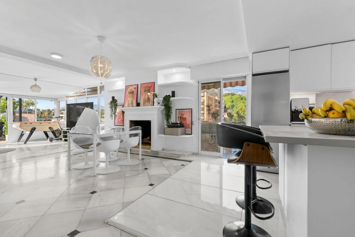 Ático situado en una urbanización bien cuidada en el centro de Marbella, que ofrece un amplio espacio interior combinado con amplias terrazas privadas. La propiedad cuenta con un luminoso salón-comedor diáfano con chimenea y acceso directo a las terrazas. La cocina ha sido reformada en un estilo contemporáneo con armarios blancos, encimeras con efecto mármol, electrodomésticos integrados y una barra central para desayunar. Hay tres dormitorios, incluido un dormitorio principal con armarios empotrados, junto con un cuarto de baño familiar bien presentado y acabado en tonos neutros. Una característica clave del apartamento es su gran espacio exterior, con múltiples terrazas que ofrecen zonas diferenciadas para comer, relajarse y entretenerse. Las terrazas disfrutan de vistas abiertas hacia La Concha y las colinas circundantes, con una combinación de zonas cubiertas y abiertas que permiten su uso durante todo el año. Otras características adicionales son el aire acondicionado, el ascensor y el acceso a jardines comunitarios bien cuidados. La propiedad se encuentra en el centro de la ciudad de Marbella, por lo que está cerca de los servicios locales, tiendas, cafeterías y servicios, y a poca distancia en coche del centro de Marbella y de la playa. Un apartamento bien proporcionado que ofrece un amplio espacio en la terraza y vistas abiertas en una ubicación consolidada de Marbella. Se recomienda visitarlo.