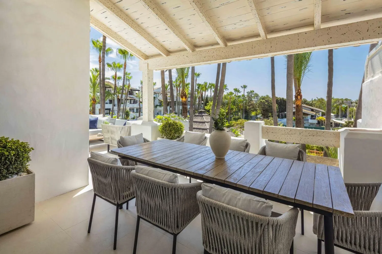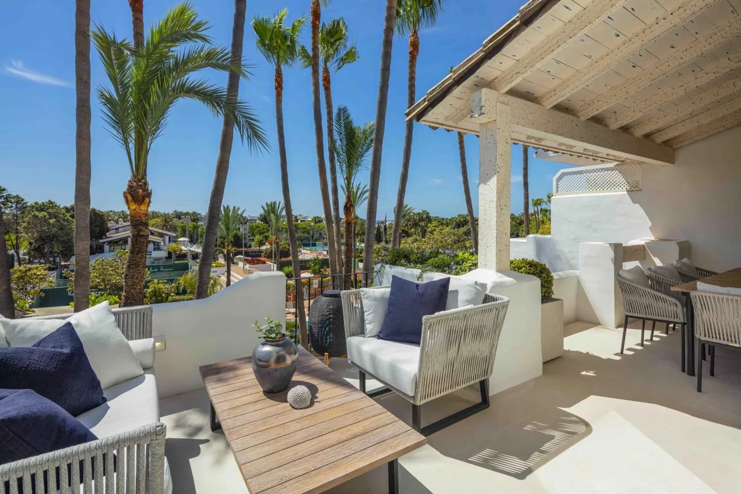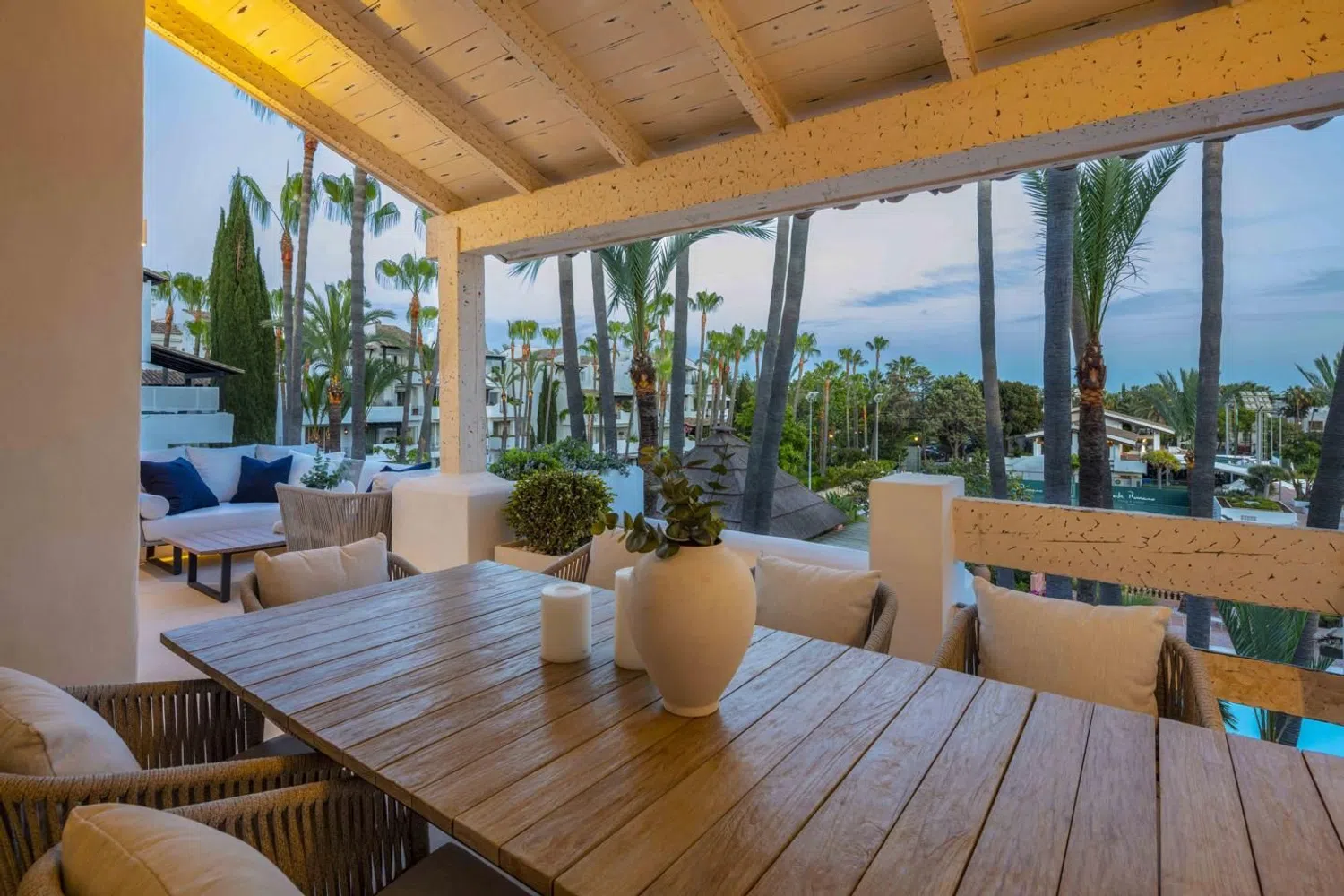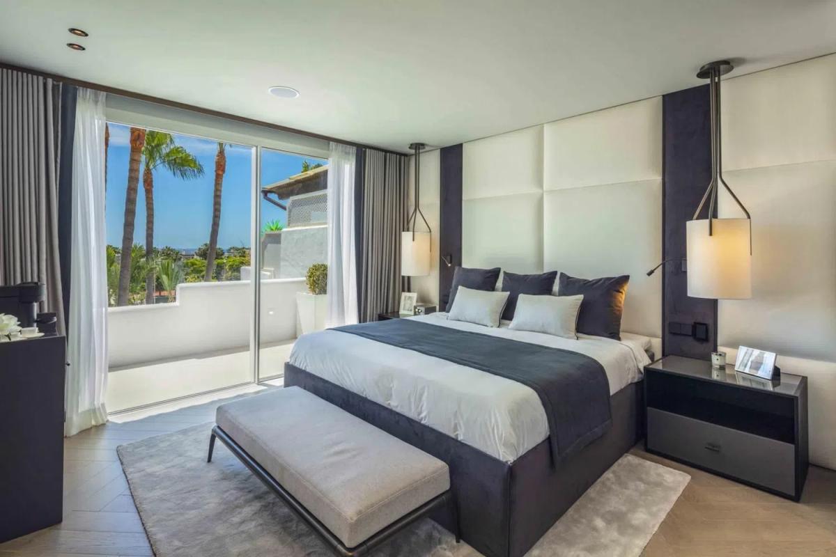 Ático dúplex en Jardines Andaluces dentro del resort 5-estrellas de Puente Romano. Ubicado en uno de los sitios junto a la playa más exclusivos del mundo, con restaurantes con estrellas Michelin, spa, tiendas boutique, club de tenis internacional y resort de playa. La ubicación más exclusiva en la Milla de Oro de Marbella. NIVEL PRINCIPAL: Al ingresar hay un amplio hall de entrada que conduce a una sala de estar de planta abierta con acceso a la terraza cubierta. Hay una elegante cocina moderna, completamente equipada con electrodomésticos MIELE y una elegante isla. Hay un amplio dormitorio en suite con baño privado y vestidor, así como un aseo de invitados y lavadero independiente. La amplia terraza se beneficia de vistas a los jardines y la piscina, tiene áreas cubiertas para relajarse y cenar al aire libre. NIVEL SUPERIOR: Aquí encontramos dos amplios dormitorios en suite, cada uno con su baño privado (con ducha y bañera), guardarropa y terraza privada. La suite principal tiene un vestidor más amplio y una terraza privada con vistas al mar y las palmeras de los alrededores. El apartamento tiene un estilo Moderno-Mediterráneo, con colores neutros y elementos cálidos como el mármol, la madera y la piedra. Las especificaciones incluyen una cocina de lujo de Modulnova con electrodomésticos Miele, chimenea con mármol, calefacción por suelo radiante (sistema de agua de bajo consumo) y muebles de marcas italianas de alta gama. La reforma total se terminó recientemente y está lista para entrar a vivir. El ático viene con dos plazas de garaje, además de tener aparcamiento adicional en la urbanización. Ubicado en la exclusiva urbanización de Jardines Andaluces con jardines maduros, gran piscina y bar social. El complejo de Puente Romano es la perla de la Milla de Oro, con playas de arena, restaurantes inolvidables, bares y el club de tenis (sede de principales torneos internacionales). Todo a pocos pasos, además de tener fácil acceso al casco antiguo de Marbella y Puerto Banús. Contacta con nosotros para más información o concertar una visita.