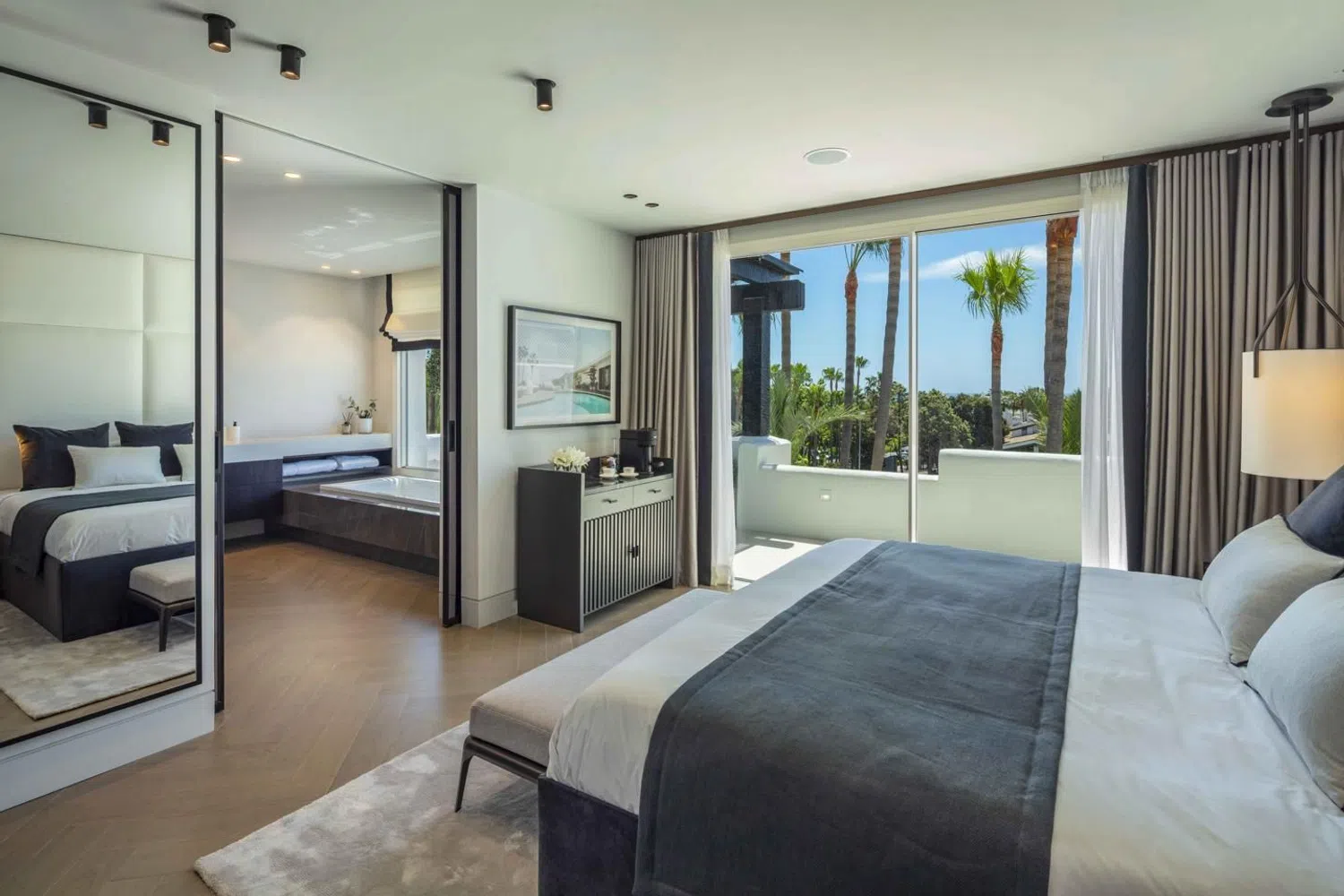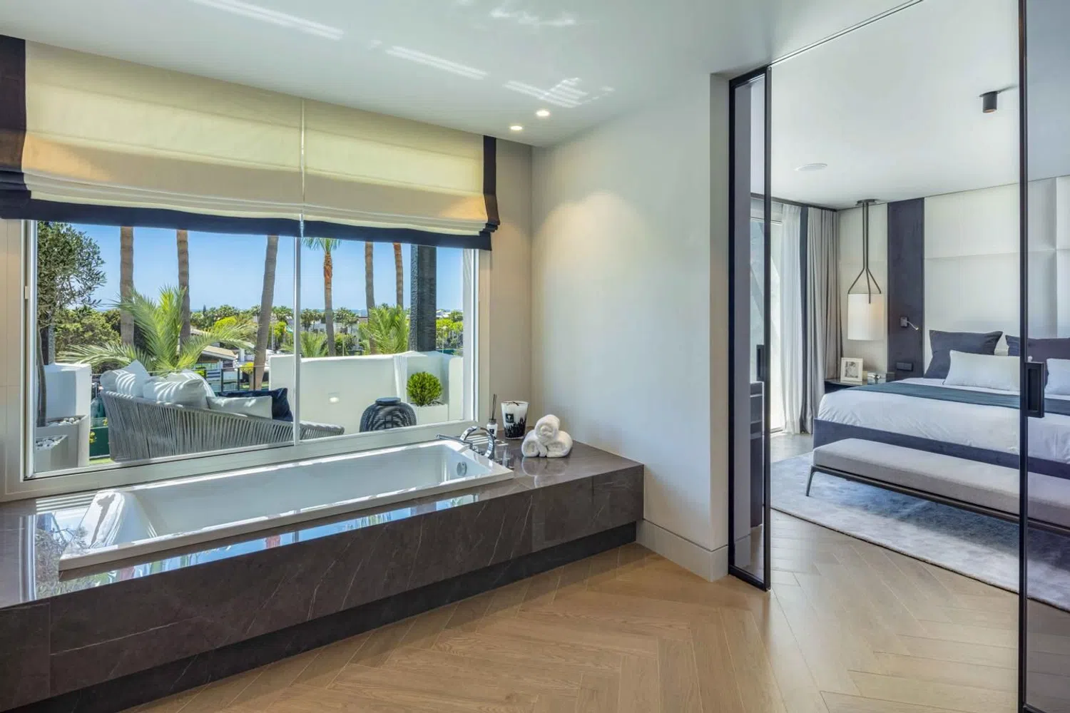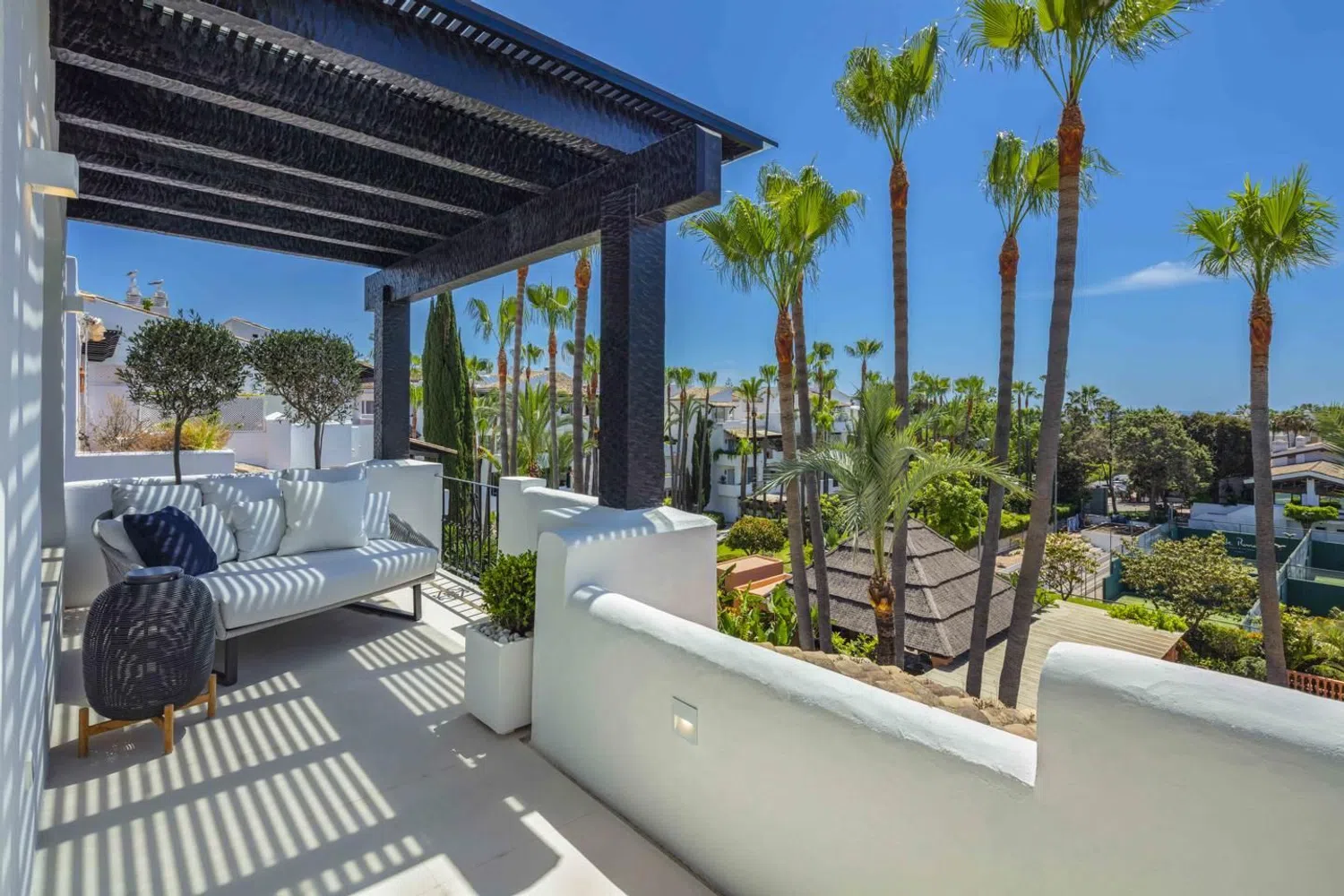 Ático dúplex en Jardines Andaluces dentro del resort 5-estrellas de Puente Romano. Ubicado en uno de los sitios junto a la playa más exclusivos del mundo, con restaurantes con estrellas Michelin, spa, tiendas boutique, club de tenis internacional y resort de playa. La ubicación más exclusiva en la Milla de Oro de Marbella. NIVEL PRINCIPAL: Al ingresar hay un amplio hall de entrada que conduce a una sala de estar de planta abierta con acceso a la terraza cubierta. Hay una elegante cocina moderna, completamente equipada con electrodomésticos MIELE y una elegante isla. Hay un amplio dormitorio en suite con baño privado y vestidor, así como un aseo de invitados y lavadero independiente. La amplia terraza se beneficia de vistas a los jardines y la piscina, tiene áreas cubiertas para relajarse y cenar al aire libre. NIVEL SUPERIOR: Aquí encontramos dos amplios dormitorios en suite, cada uno con su baño privado (con ducha y bañera), guardarropa y terraza privada. La suite principal tiene un vestidor más amplio y una terraza privada con vistas al mar y las palmeras de los alrededores. El apartamento tiene un estilo Moderno-Mediterráneo, con colores neutros y elementos cálidos como el mármol, la madera y la piedra. Las especificaciones incluyen una cocina de lujo de Modulnova con electrodomésticos Miele, chimenea con mármol, calefacción por suelo radiante (sistema de agua de bajo consumo) y muebles de marcas italianas de alta gama. La reforma total se terminó recientemente y está lista para entrar a vivir. El ático viene con dos plazas de garaje, además de tener aparcamiento adicional en la urbanización. Ubicado en la exclusiva urbanización de Jardines Andaluces con jardines maduros, gran piscina y bar social. El complejo de Puente Romano es la perla de la Milla de Oro, con playas de arena, restaurantes inolvidables, bares y el club de tenis (sede de principales torneos internacionales). Todo a pocos pasos, además de tener fácil acceso al casco antiguo de Marbella y Puerto Banús. Contacta con nosotros para más información o concertar una visita.
