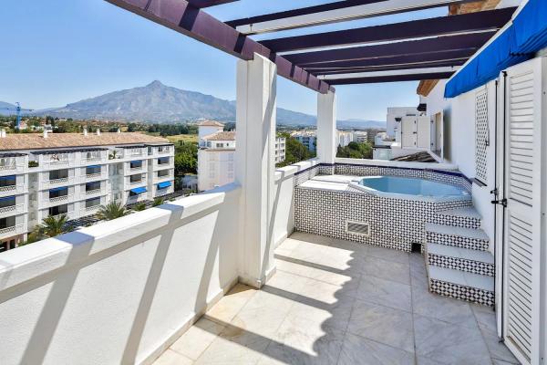 Bonito ático ubicado en Playas del Duque al lado de Puerto Banús con su maravillosa oferta de tiendas de lujo, supermercados, restaurantes y bares de copas. Situado en la 6ª planta y orientado principalmente al noreste, esta propiedad disfruta de bonitas vistas hacia la Concha y los alrededores desde sus dos terrazas. El ático ofrece 2 dormitorios, 2 cuartos de baño, salón con comedor, 1 terraza con bañera jacuzzi y salida desde el dormitorio principal, 1 terraza abierta así cómo una cocina completamente equipada con zona de comedor. Además la propiedad incluye una plaza de aparcamiento en el garaje comunitario. La urbanización ofrece cuidados jardines con varias piscinas, acceso directo a la playa y 24 horas de seguridad con servicio de conserjería. Este ático tiene la solería de mármol y esta equipado con A/C, línea ADSL y televisión por satélite. Ubicado muy céntrico, este ático representa la propiedad ideal para cualquiera que quiera disfrutar de las playas de Puerto Banús.