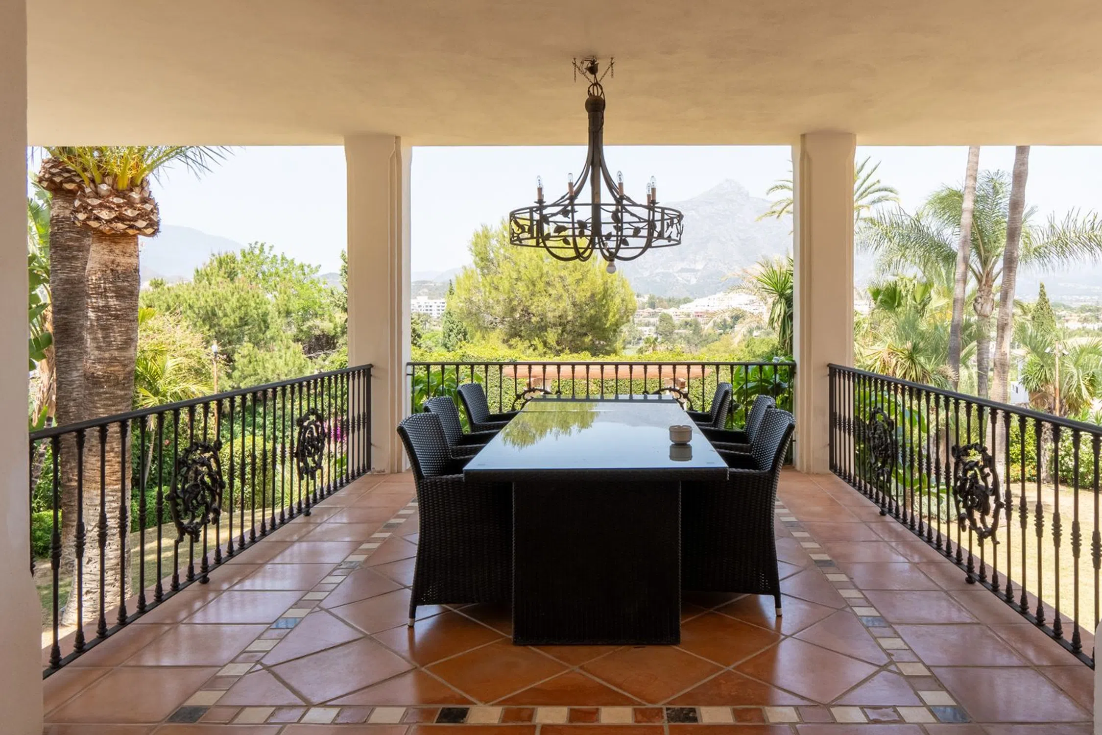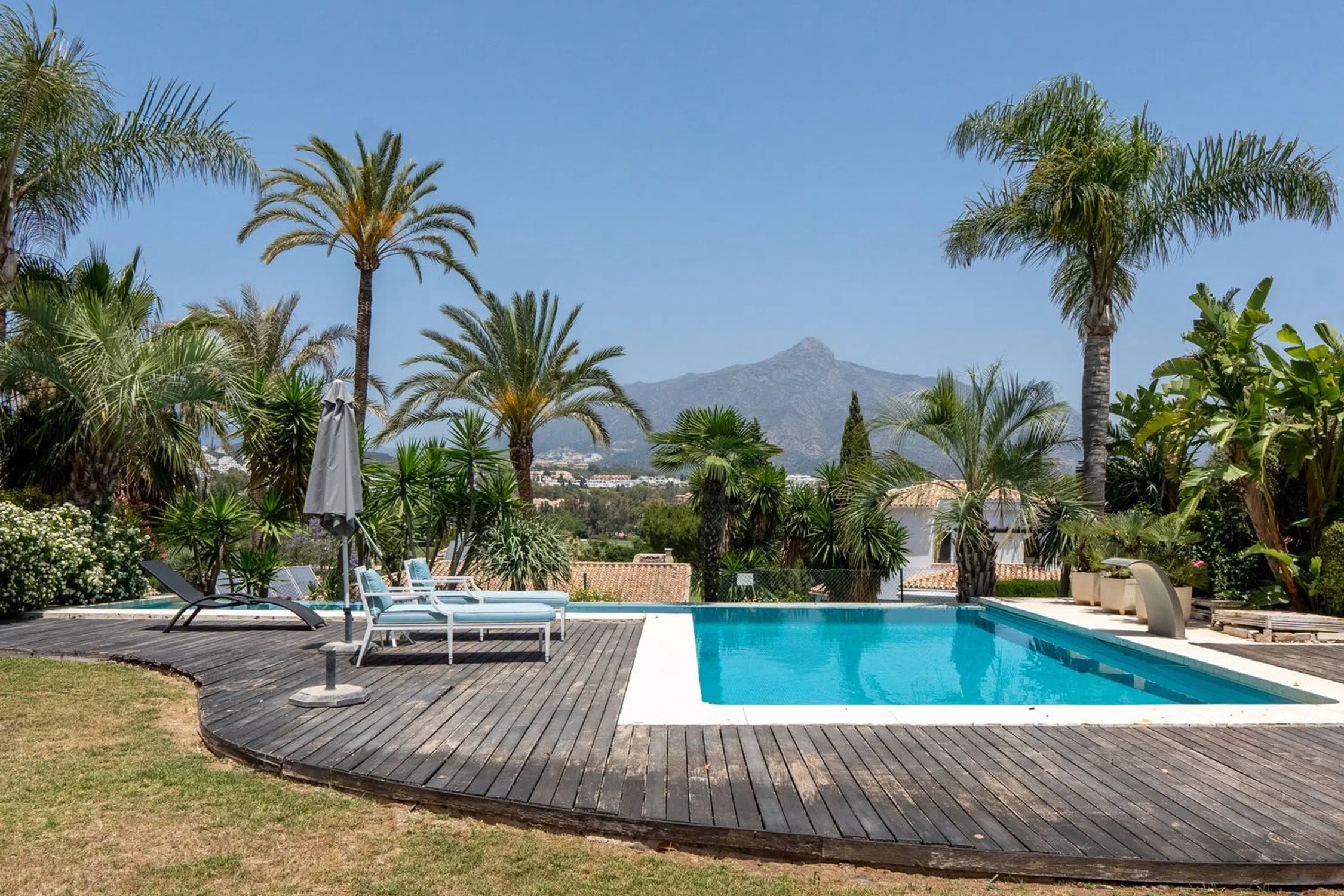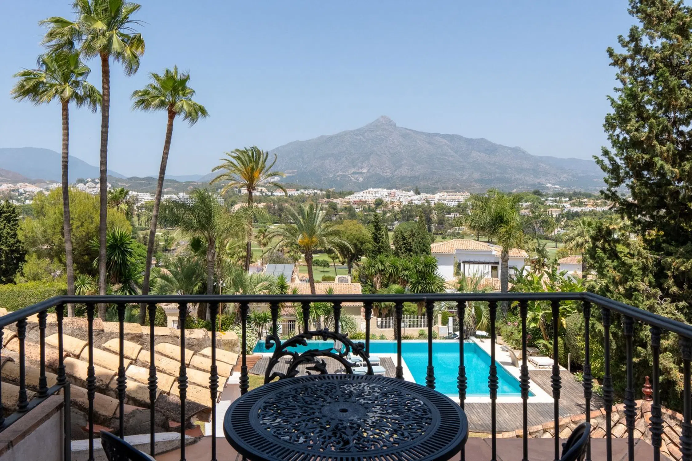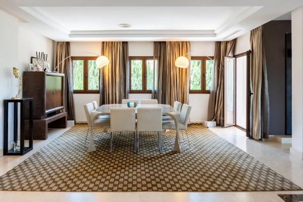 Una villa de seis dormitorios de estilo clásico contemporáneo se encuentra en una gran parcela elevada que ofrece fabulosas vistas al golf ya la montaña. La propiedad ha sido reformada y ampliada a 890m2 construidos. De sólida construcción y acabada con maderas nobles y mármol original, se distribuye en tres niveles. La planta principal nos recibe en el hall de entrada donde se prolonga el salón exquisitamente decorado con la zona de comedor y la cocina integrada totalmente equipada con electrodomésticos Neff con acceso a la terraza cubierta con comedor de verano y estupendas vistas a La Concha. En este mismo nivel hay tres dormitorios dobles en suite y un aseo de invitados. La planta superior consta del dormitorio principal en suite con vestidor y vistas a la montaña y vistas parciales al mar. La planta baja se encuentra a nivel del jardín, aquí encontramos dos dormitorios en suite con amplios armarios, ambos con acceso directo al jardín, una amplia sala de cine, aseo de invitados, lavadero y garaje con capacidad para tres coches. El gran jardín maduro está bien cuidado y ofrece una zona de barbacoa y piscina infinita. La propiedad ofrece un apartamento independiente de un dormitorio que actualmente se utiliza como apartamento para el personal. Las Brisas es una de las zonas más exclusivas de Nueva Andalucía, dentro de un corto trayecto en coche Las Brisas, Aloha y Los Naranjos Golf Clubs, numerosos restaurantes, cafeterías y escuelas internacionales.