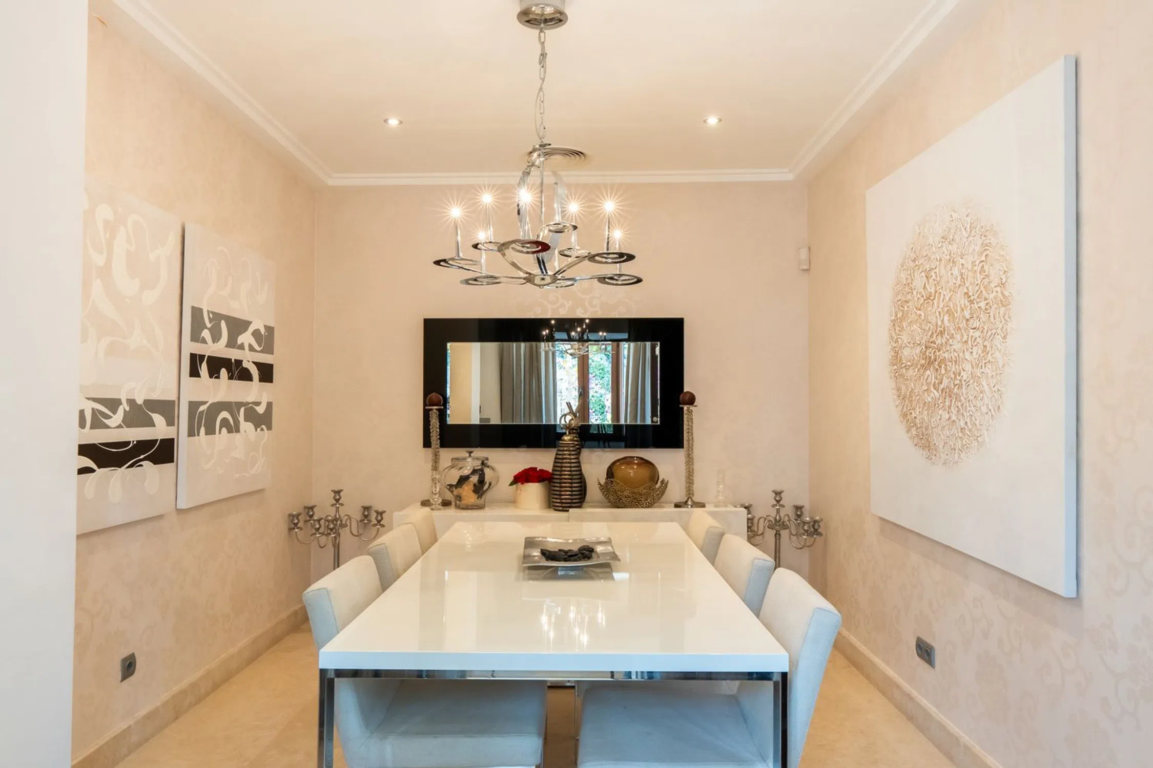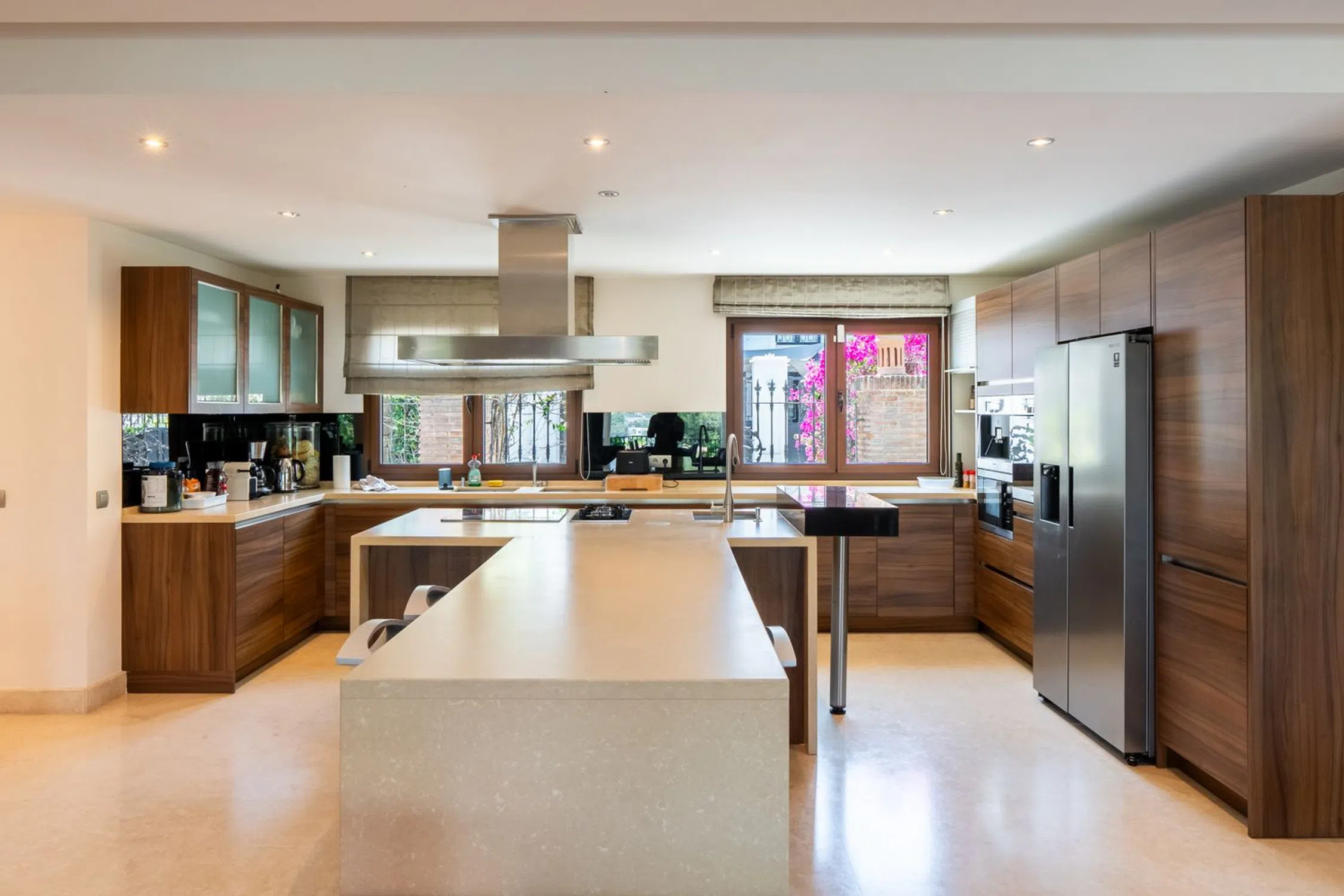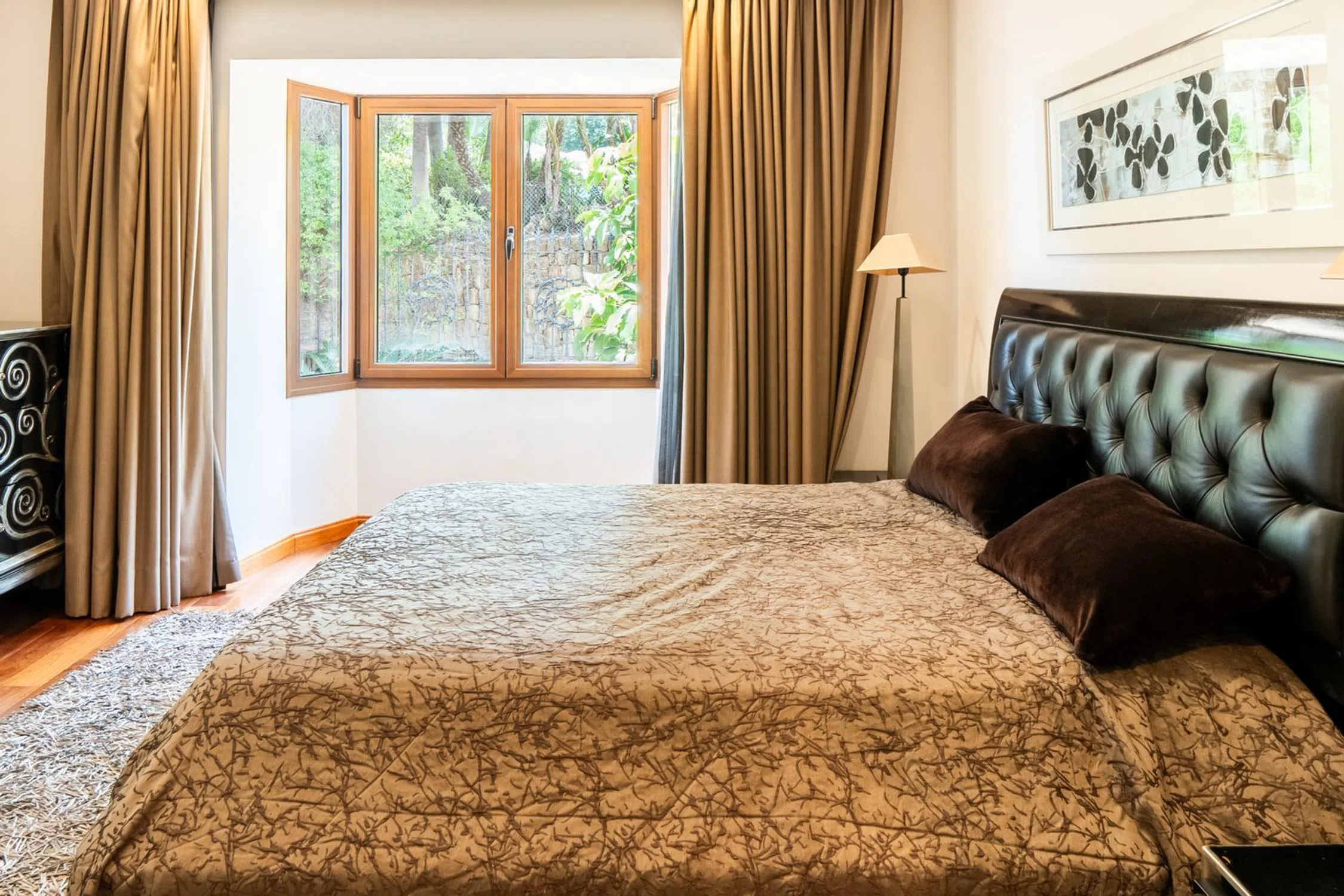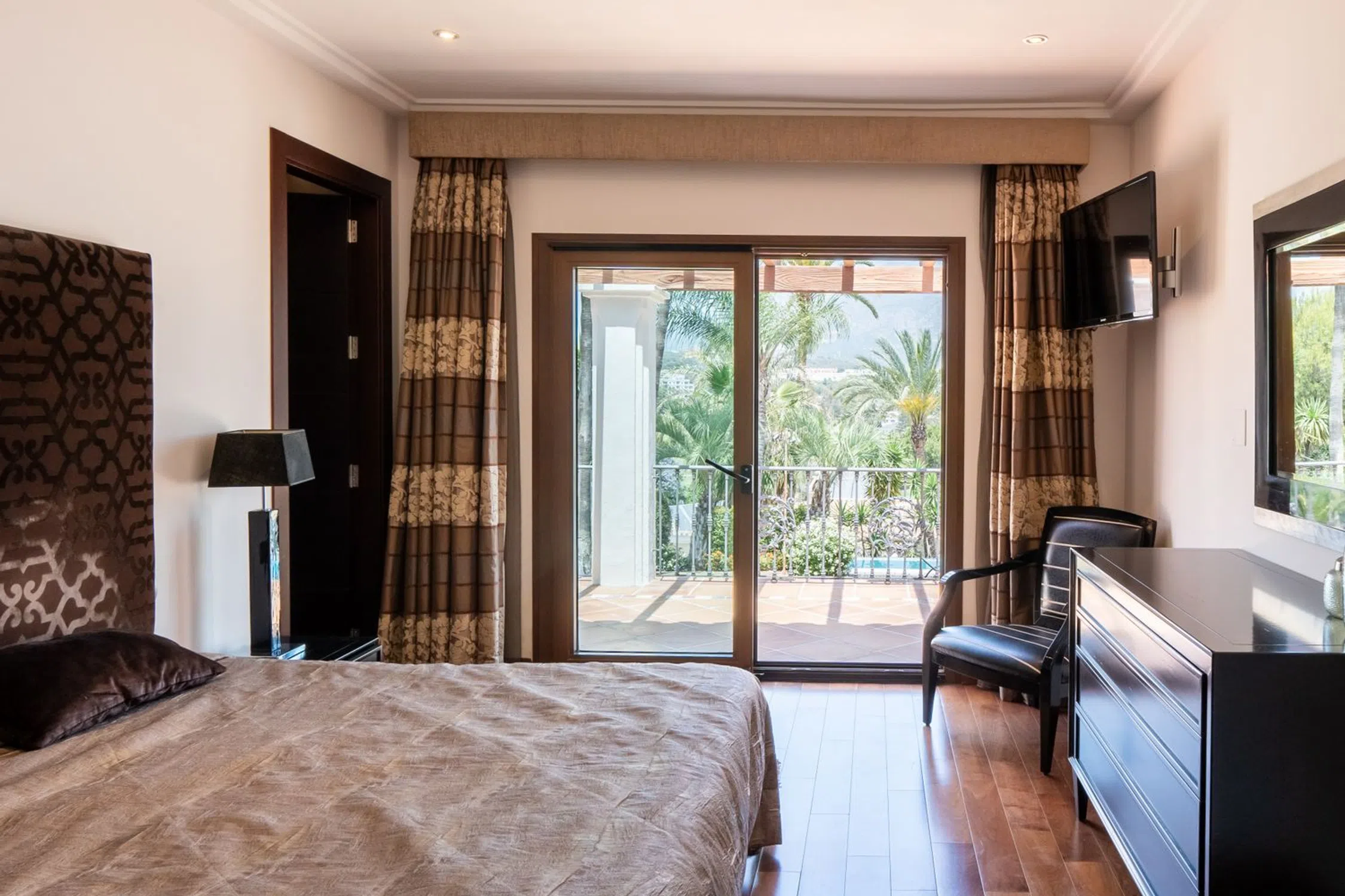 Una villa de seis dormitorios de estilo clásico contemporáneo se encuentra en una gran parcela elevada que ofrece fabulosas vistas al golf ya la montaña. La propiedad ha sido reformada y ampliada a 890m2 construidos. De sólida construcción y acabada con maderas nobles y mármol original, se distribuye en tres niveles. La planta principal nos recibe en el hall de entrada donde se prolonga el salón exquisitamente decorado con la zona de comedor y la cocina integrada totalmente equipada con electrodomésticos Neff con acceso a la terraza cubierta con comedor de verano y estupendas vistas a La Concha. En este mismo nivel hay tres dormitorios dobles en suite y un aseo de invitados. La planta superior consta del dormitorio principal en suite con vestidor y vistas a la montaña y vistas parciales al mar. La planta baja se encuentra a nivel del jardín, aquí encontramos dos dormitorios en suite con amplios armarios, ambos con acceso directo al jardín, una amplia sala de cine, aseo de invitados, lavadero y garaje con capacidad para tres coches. El gran jardín maduro está bien cuidado y ofrece una zona de barbacoa y piscina infinita. La propiedad ofrece un apartamento independiente de un dormitorio que actualmente se utiliza como apartamento para el personal. Las Brisas es una de las zonas más exclusivas de Nueva Andalucía, dentro de un corto trayecto en coche Las Brisas, Aloha y Los Naranjos Golf Clubs, numerosos restaurantes, cafeterías y escuelas internacionales.