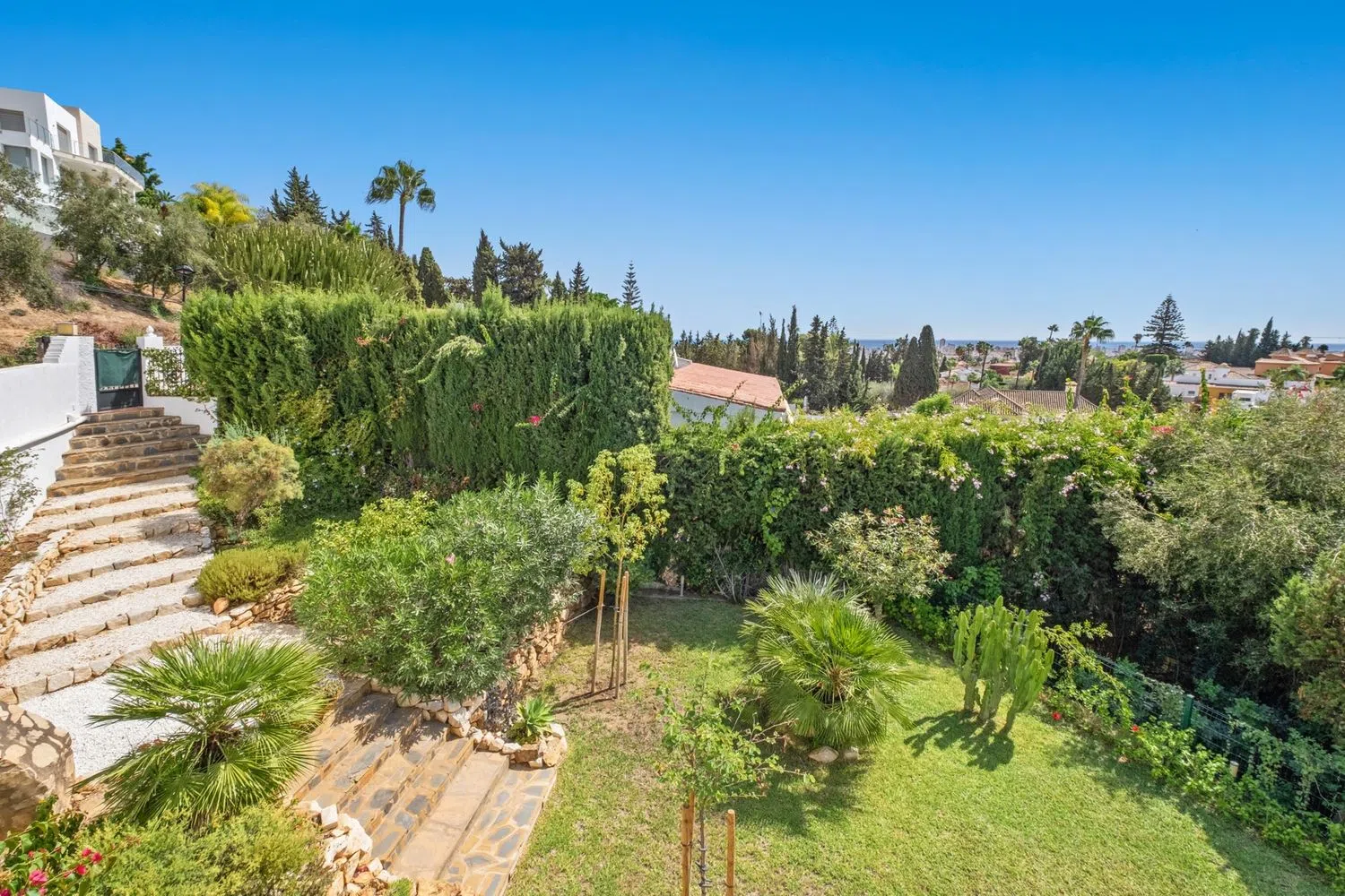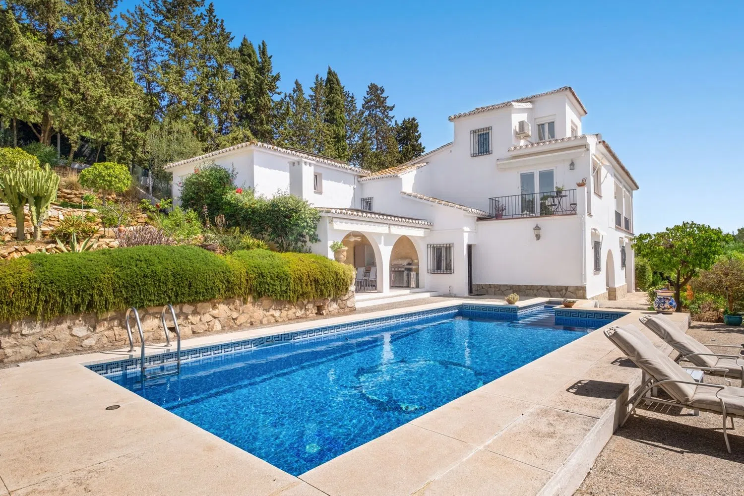 Esta exquisita villa con orientación suroeste se encuentra en la prestigiosa Urb. La Sierrezuela, Mijas Costa, que ofrece una vida lujosa con impresionantes vistas panorámicas. Meticulosamente mantenida y bellamente decorada, la propiedad se extiende en tres niveles, combinando espacio, elegancia y comodidad en una de las zonas más solicitadas de la soleada Costa del Sol. Nivel de calle: A su llegada, le recibirá una amplia zona de aparcamiento dentro de la parcela y un espacioso garaje. El vestíbulo de entrada conduce a la casa y ofrece una gran primera impresión con su acogedora escalera y su cómodo aseo para invitados. La espaciosa cocina totalmente equipada con electrodomésticos modernos se abre a un hermoso balcón, perfecto para disfrutar de su café de la mañana mientras contempla las vistas. El amplio salón-comedor es un verdadero punto culminante, con una cómoda chimenea, una ventana panorámica que enmarca el impresionante entorno y acceso directo a la terraza. Un encantador rincón de lectura en el salón crea un espacio tranquilo para relajarse o disfrutar de un buen libro. Nivel de jardín: En el nivel inferior, encontrará dos habitaciones dobles de generosas dimensiones, cada una con su baño privado. Ambos dormitorios ofrecen mucho espacio y luz, lo que los hace perfectos para invitados o familiares. Además, hay un lavadero exclusivo y una cómoda zona de almacenamiento. La pieza central de este nivel es el amplio dormitorio principal, completo con un lujoso baño privado que cuenta con una cabina de ducha, bañera, lavabos para él y para ella y un amplio vestidor. Desde esta planta se puede acceder a la amplia terraza, diseñada para la vida al aire libre y el entretenimiento. La terraza alberga una gran piscina, rodeada de un amplio espacio para tomar el sol o relajarse bajo la pérgola a la sombra. Esta tranquila zona al aire libre es perfecta para disfrutar del cálido clima español. Para aquellos a quienes les encanta recibir invitados, la cocina exterior cubierta es ideal para preparar comidas y disfrutarlas al aire libre. La terraza está salpicada de rincones tranquilos que brindan una sensación de paz y privacidad. Planta Alta (Habitación Torre): En el piso superior, una sala de la torre versátil se utiliza actualmente como oficina, pero se puede convertir fácilmente en un cuarto dormitorio, sala de pasatiempos o retiro privado, según sus necesidades. Con ventanas que ofrecen vistas más increíbles, esta habitación está llena de luz natural y ofrece infinitas posibilidades. Características y comodidades: Esta villa está equipada con todas las comodidades modernas para garantizar un estilo de vida confortable. Cuenta con aire acondicionado en todas partes, lo que garantiza la temperatura perfecta durante todo el año. Un sistema de energía solar reduce significativamente los costos de electricidad, haciendo que el hogar sea más eficiente energéticamente. Además, un avanzado sistema de alarma brinda seguridad y tranquilidad. La villa está rodeada por un hermoso jardín maduro, que cuenta con una variedad de árboles y exuberante vegetación, lo que contribuye a la atmósfera tranquila y privada de la propiedad. Ya sea que esté descansando junto a la piscina, entreteniéndose en la terraza o disfrutando de los acogedores espacios interiores, esta villa ofrece una combinación perfecta de lujo, comodidad y serenidad en una de las ubicaciones más deseadas de Mijas Costa. R4850830.