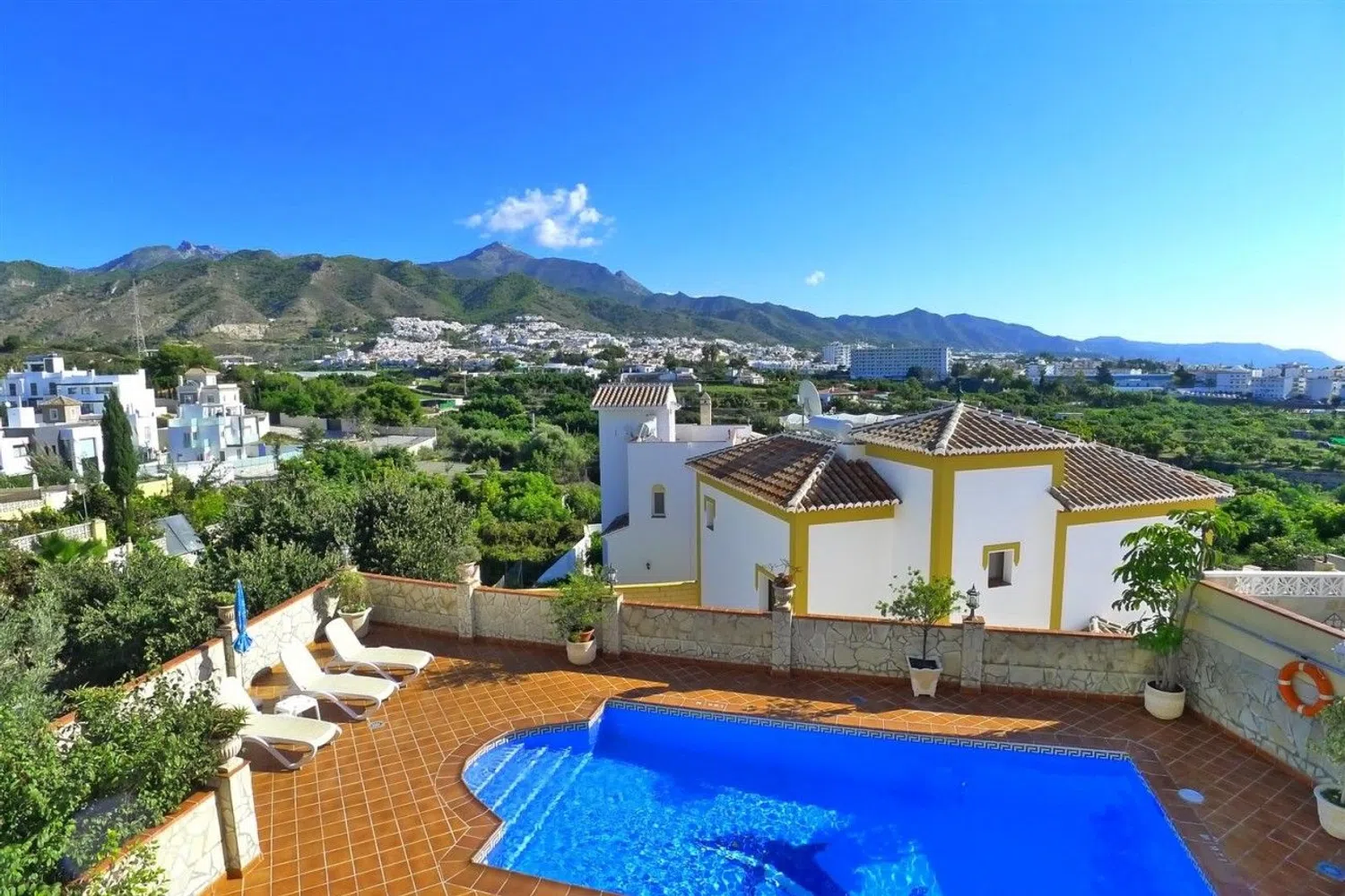 Fantástica y gran villa de 7 dormitorios con estupendas terrazas, piscina privada, garaje y Precioso entorno con magníficas vistas al mar y las montañas. Esta magnífica villa está situada a 3 minutos en coche del centro de Nerja y de las playas. Se localiza en un entorno natural, tranquilidad y unas fantásticas vistas hacen que esta propiedad sea una magnífica oportunidad. La propiedad, además, cuenta con un apartamento independiente de gran tamaño, con 3 dormitorios y 2 baños, ideal como inversión. Esta villa se divide en tres niveles: planta baja, primera planta y planta semisótano. La entrada a la villa se realiza a través de la planta baja donde se encuentra el hall, la cocina, 1 dormitorio, 1 baño y el salón-comedor con chimenea que da acceso a una enorme terraza. La terraza dispone de una parte techada como zona de estar y comedor, cuenta con zona de barbacoa y una fantástica piscina de 28 m² y un gran espacio exterior. En la primera planta se encuentran 3 dormitorios, 2 baños; uno de ellos en suite y 2 preciosas terrazas desde las que se pueden disfrutar de unas maravillosas vistas. El apartamento independiente se encuentra en la planta semisótano; con entrada independiente, se accede a través de una terraza techada. Consta de una amplísima cocina, salón, 3 dormitorios y 2 baños. Dispone también de 1 garaje situado en la planta semisótano. Una villa con mucho encanto y un gran potencial. Además de poseer una propiedad fantástica para disfrutar, también puede disponer de unos ingresos extras utilizando el apartamento como inversión. Sin duda, esta propiedad es una estupenda oportunidad!