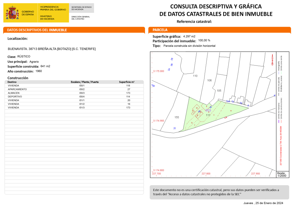 La propiedad se encuentra en la zona de Breña Alta, a solo 5 minutos de Santa Cruz de La Palma. Con una superficie construida total de 758 m² y una superficie de parcela de 22.872 m², esta casa ofrece un amplio espacio tanto en el interior como en el exterior.
