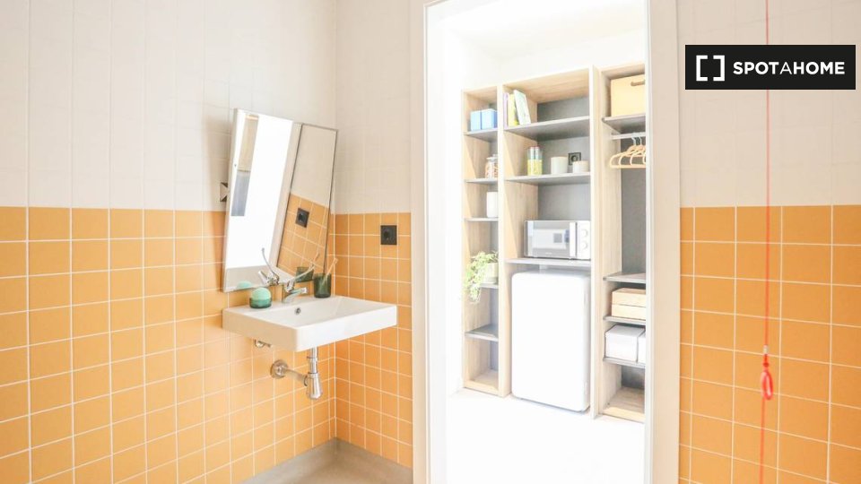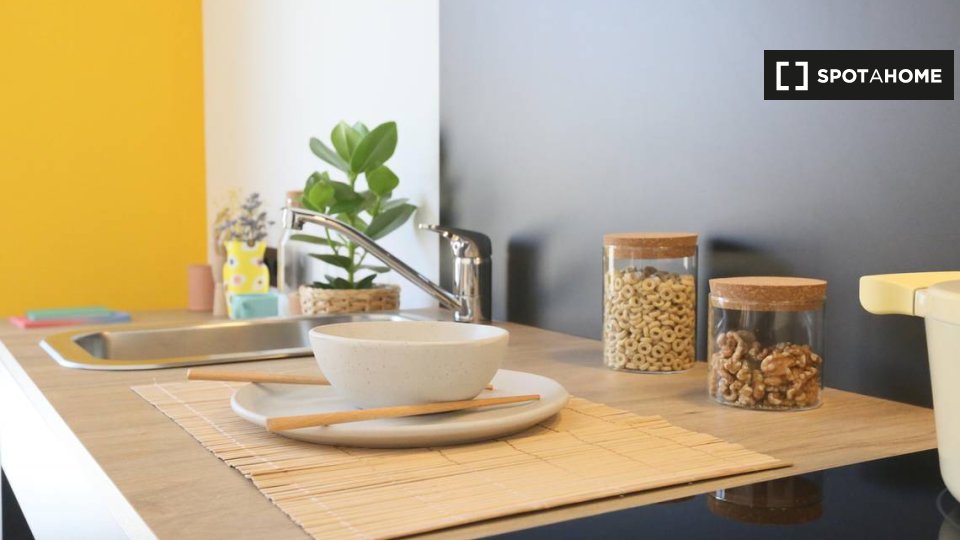 Möbliertes Studio-Apartment zu vermieten auf Pl. De La Marina Española. Das Anwesen verfügt über Einzelbett und Klimaanlage. Die Unterkunft umfasst eine eigene Küche mit Herd, Mikrowelle und Kühlschrank.