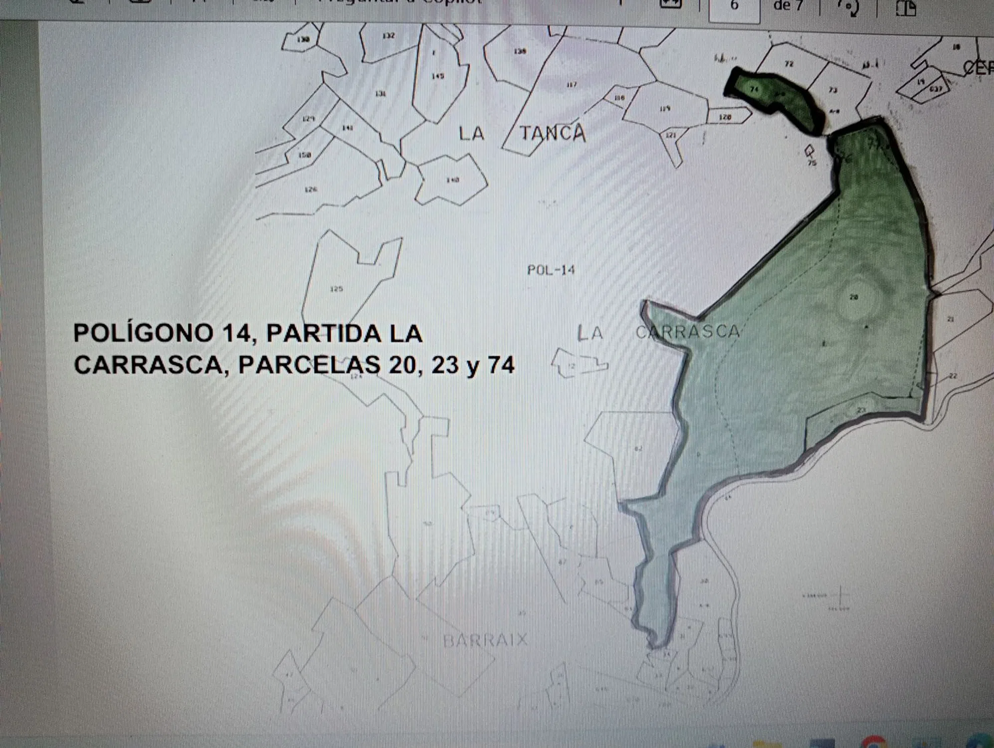 Terreno protegido dentro del Parque Natural de La Sierra Calderona. 93409 m² o 112,4 hanegadas con 3000 almendros (variedad marcona), 21 olivos centenarios y pinada. Tiene manantial de agua potable con pozo abierto de 2 m de diámetro y 8 de profundidad. El pozo está dentro de una caseta de seguridad. Finca totalmente alambrada. También se dispone de una caseta de aperos de dos plantas de aproximadamente 40 m². POLIGONO 14, PARTIDA La Carrasca, parcelas 20, 23 y 74.