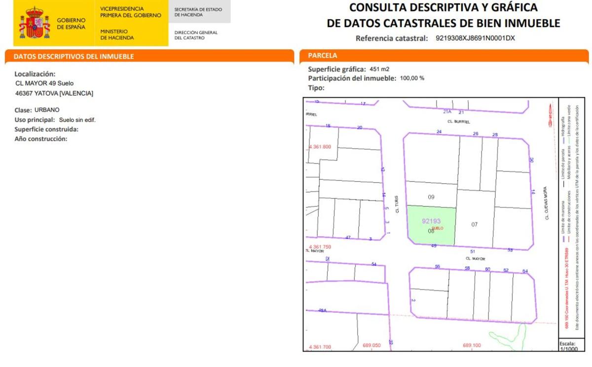 INMOBILIARIA PROZONA ofrece este enorme terreno para poder hacer una gran casa, o bien segregar para hacer diversas casas. En ella encontramos una parcela de 451 m2, terreno completamente esquinero entre calle Mayor y calle Turis. Muy buena ubicación en el mismo municipio de Yatova. Tiene la calle asfaltada, con alumbrado, servicio de basuras, todos los servicios. No puedes dejar pasar esta magnífica oportunidad. Contacta con nosotros para cualquier duda o visita, estaremos encantados de atenderle.