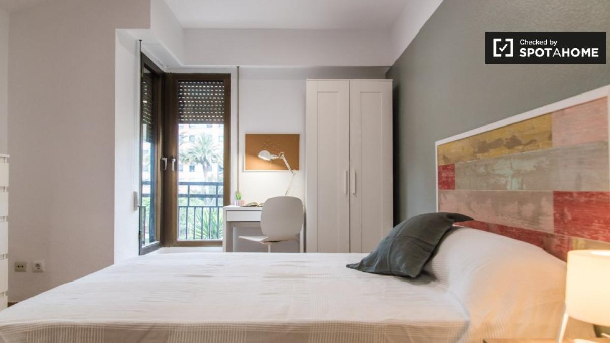 Entdecken Sie dieses geräumige, möblierte Zimmer in einer 5-Zimmer-WG im Viertel Jaume Roig in Valencia. Die Unterkunft verfügt über individuell regulierbare Klimaanlagen, eine gemeinschaftl...