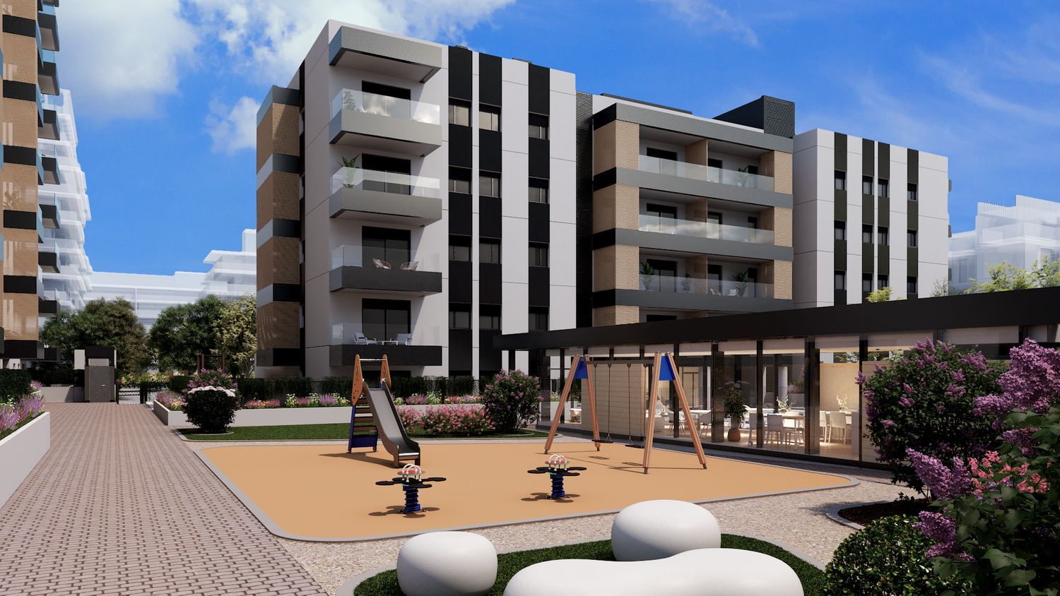 Construction is underway at Acea, a development of 155 residences located in the burgeoning neighborhood of Las Sedas in Alcalá de Henares. This area is rapidly evolving, nestled near El Olivar and Espartales. The project offers a range of homes with 2 and 3 bedrooms, featuring terraces, ground floor units with gardens, and penthouses with terraces. Residents will benefit from storage rooms and parking spaces.