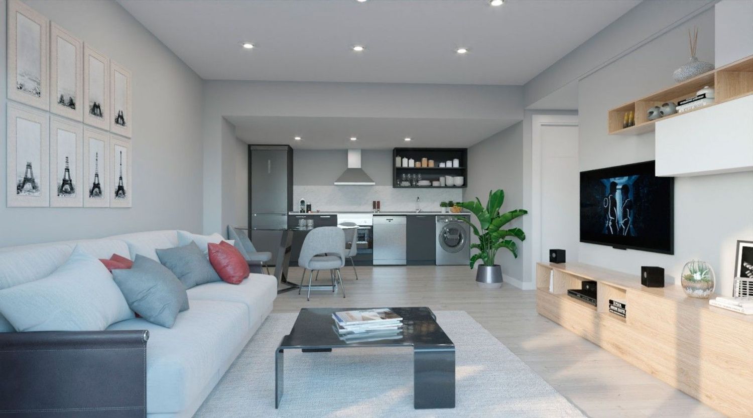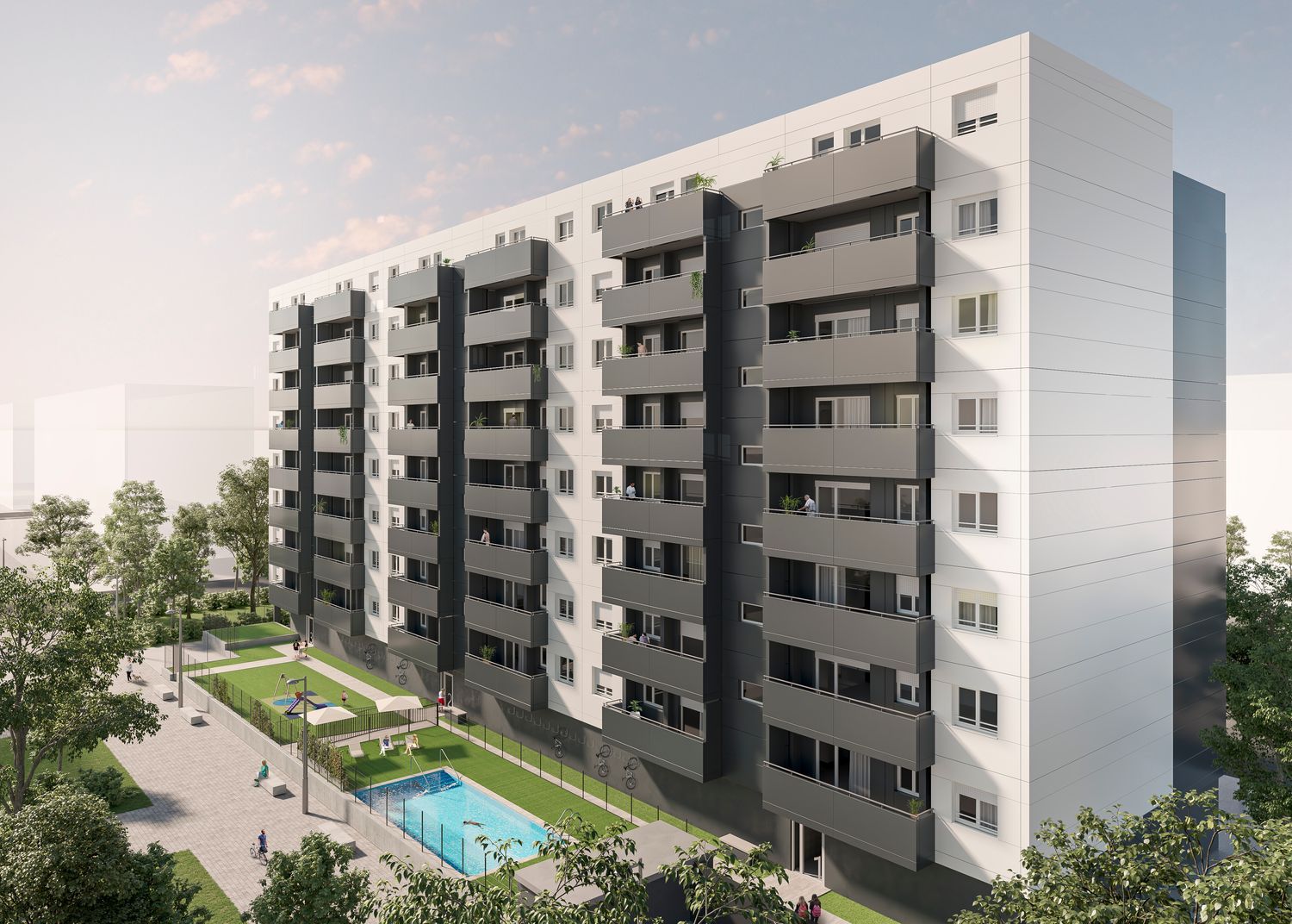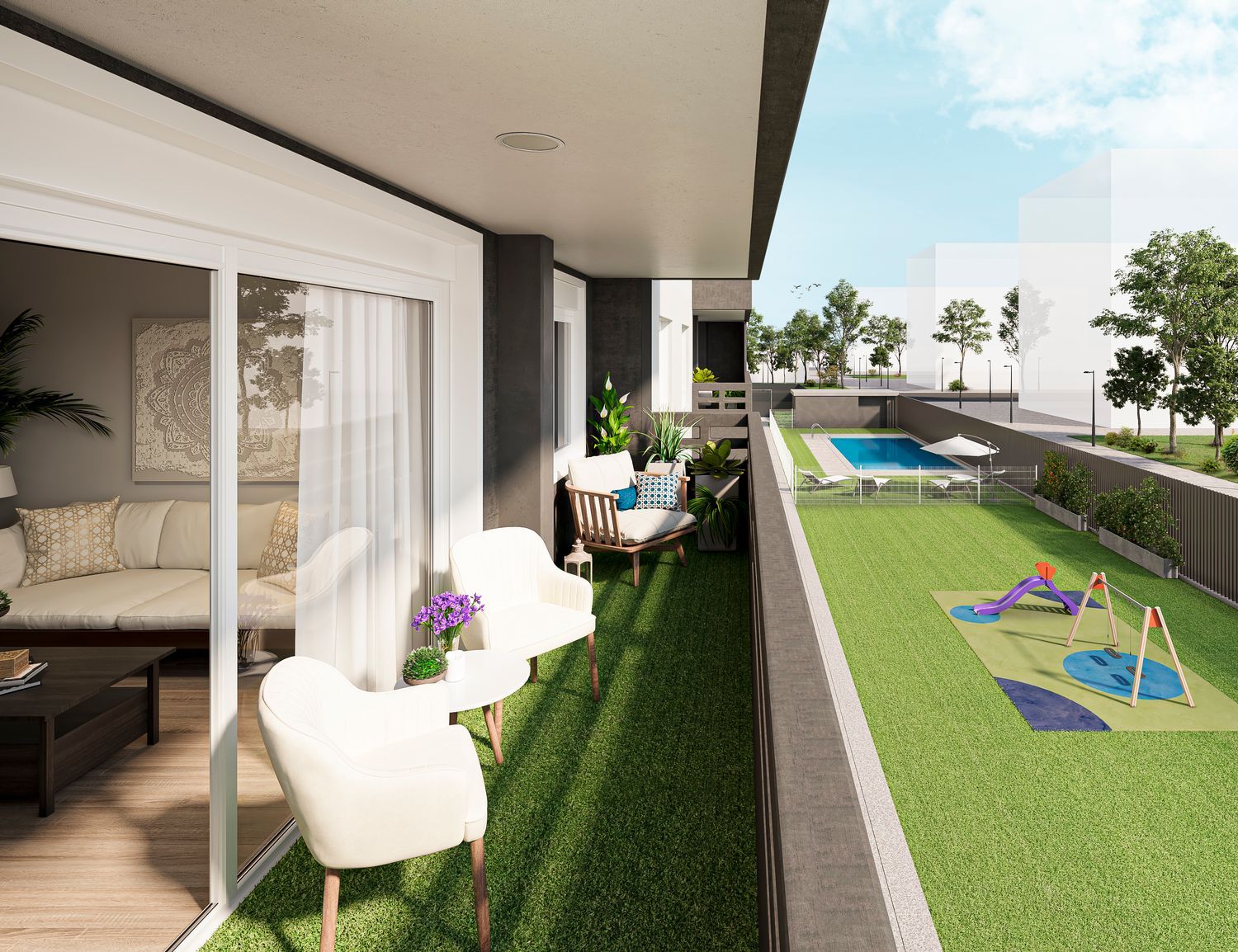 Residents will enjoy top-notch quality and upscale interiors. The bathrooms boast exclusive designs with laminate floors and a unique bath and shower areas adorned with vinyl panels. Kitchens are fully furnished and equipped with a ceramic cooktop, extractor hood, and oven. The master suite stands out with a spacious independent walk-in closet, tailored for optimal organization. Each apartment includes an extensive terrace, providing the perfect space to unwind throughout the year.