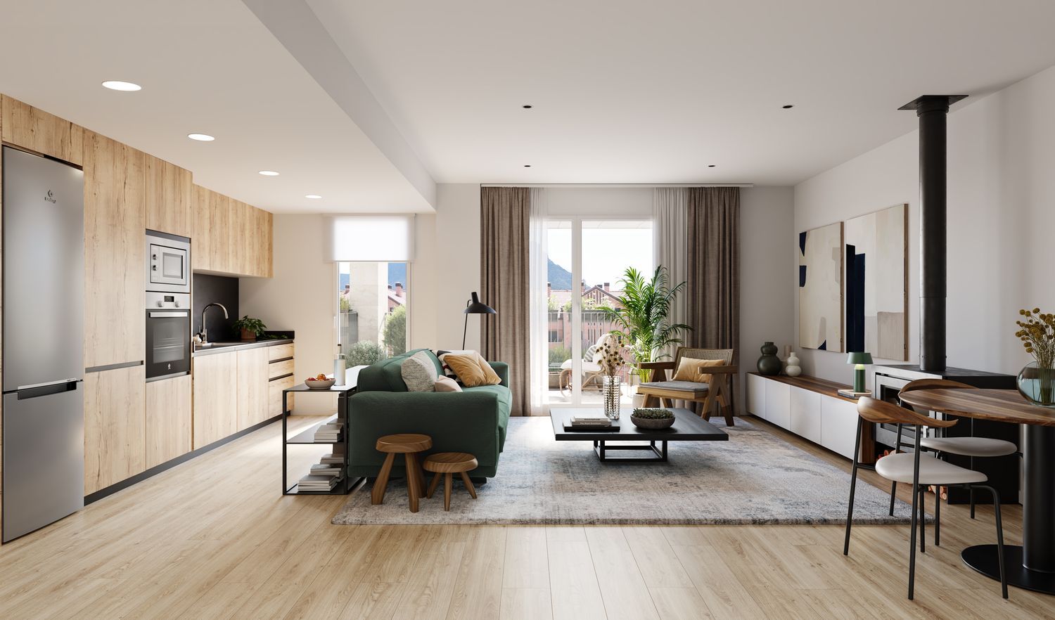 The community space spans over 200 square meters and includes a swimming pool, a children's play area, a landscaped lawn with trees, a picnic zone, and a dedicated bicycle parking area. The apartments available are 2 and 3-bedroom units, featuring secure reinforced entry doors, fully furnished kitchens equipped with top-brand appliances, and two full bathrooms. Each apartment also includes a terrace, pre-installed chimney options, provisions for air conditioning, individual boiler heating systems, and aerothermal support for hot water production.